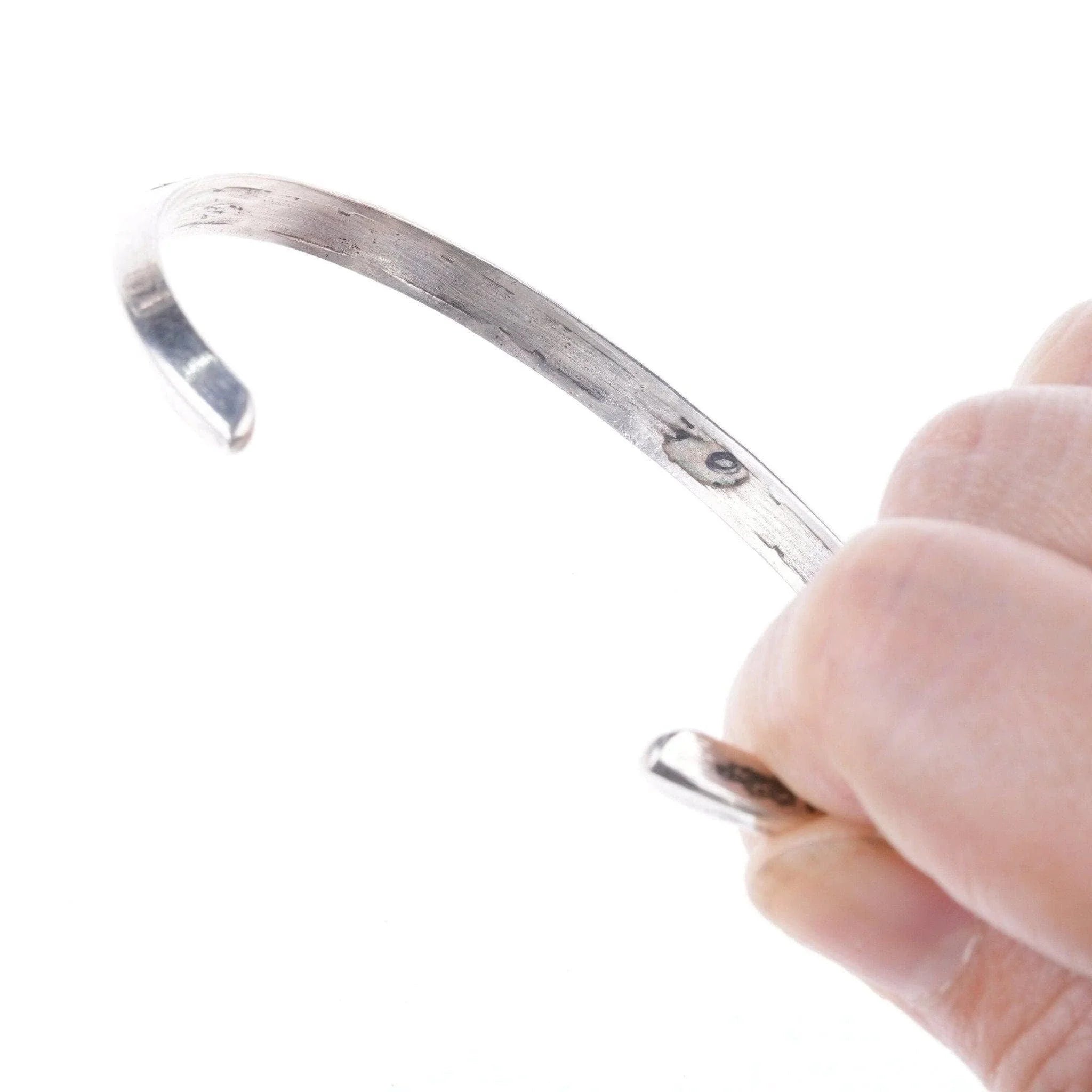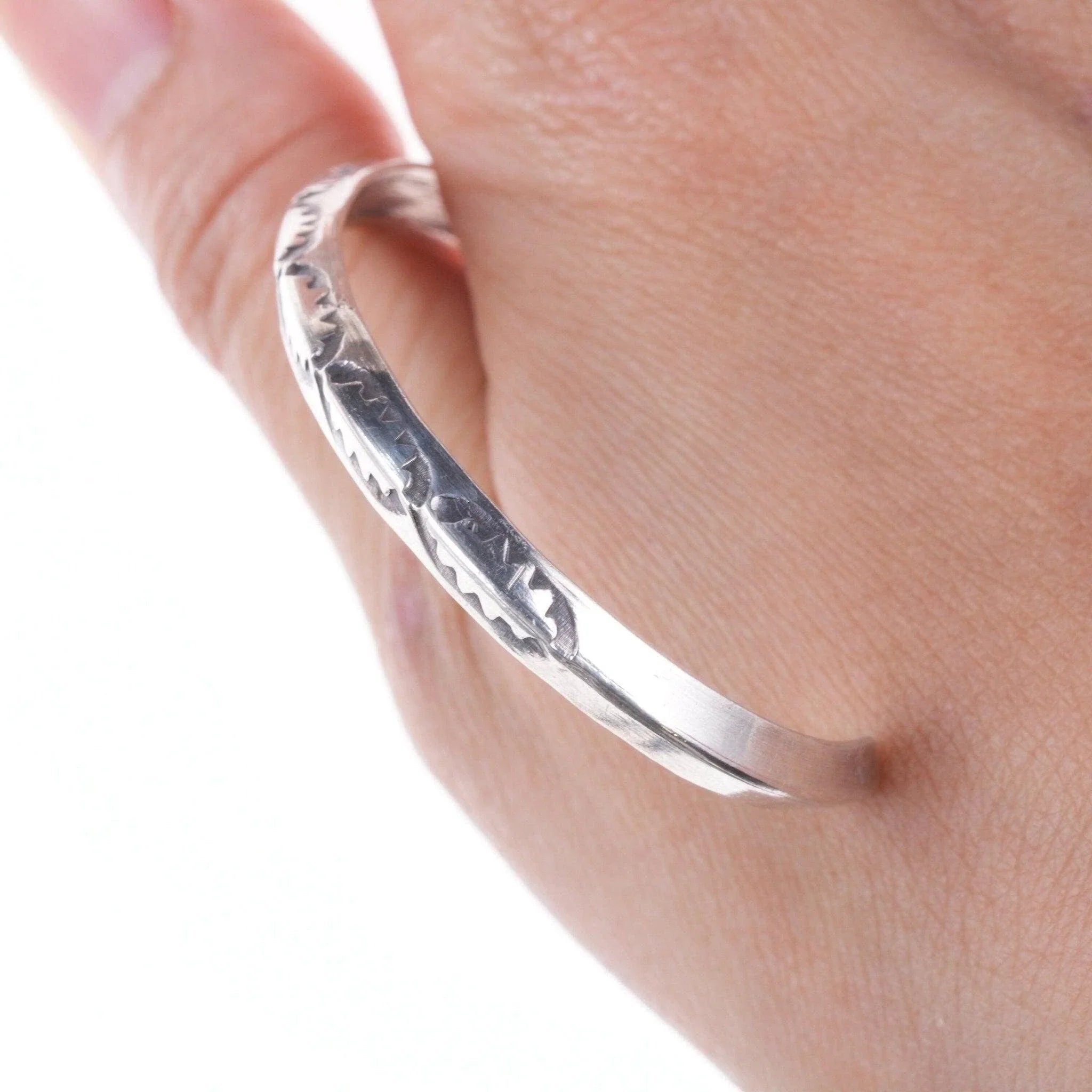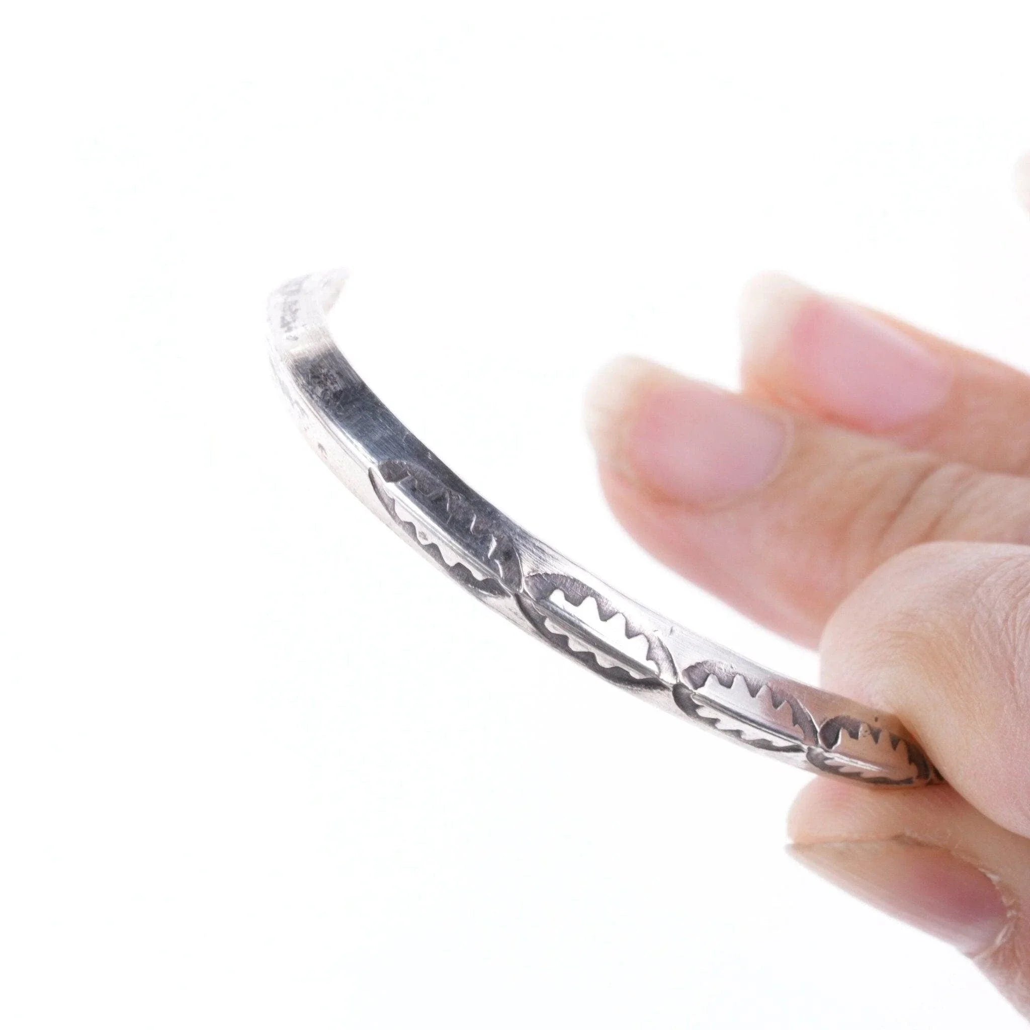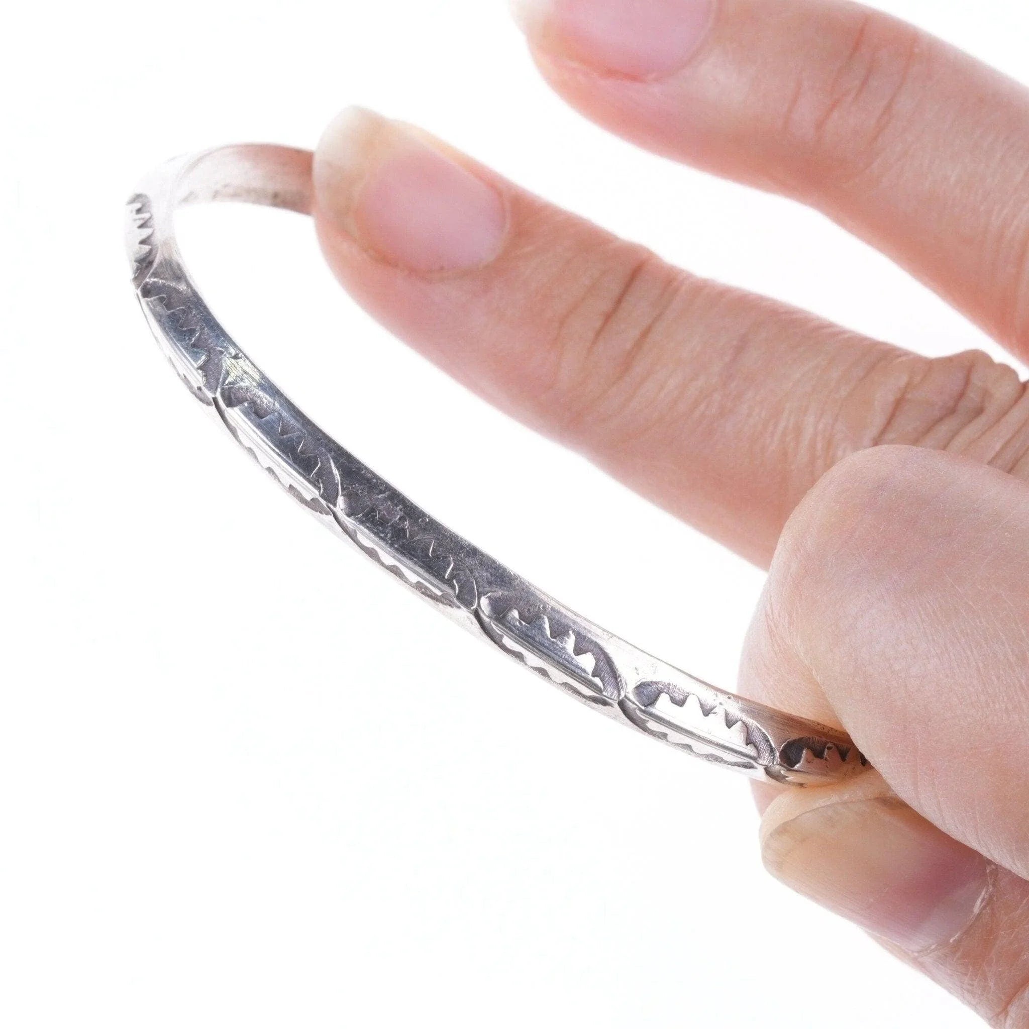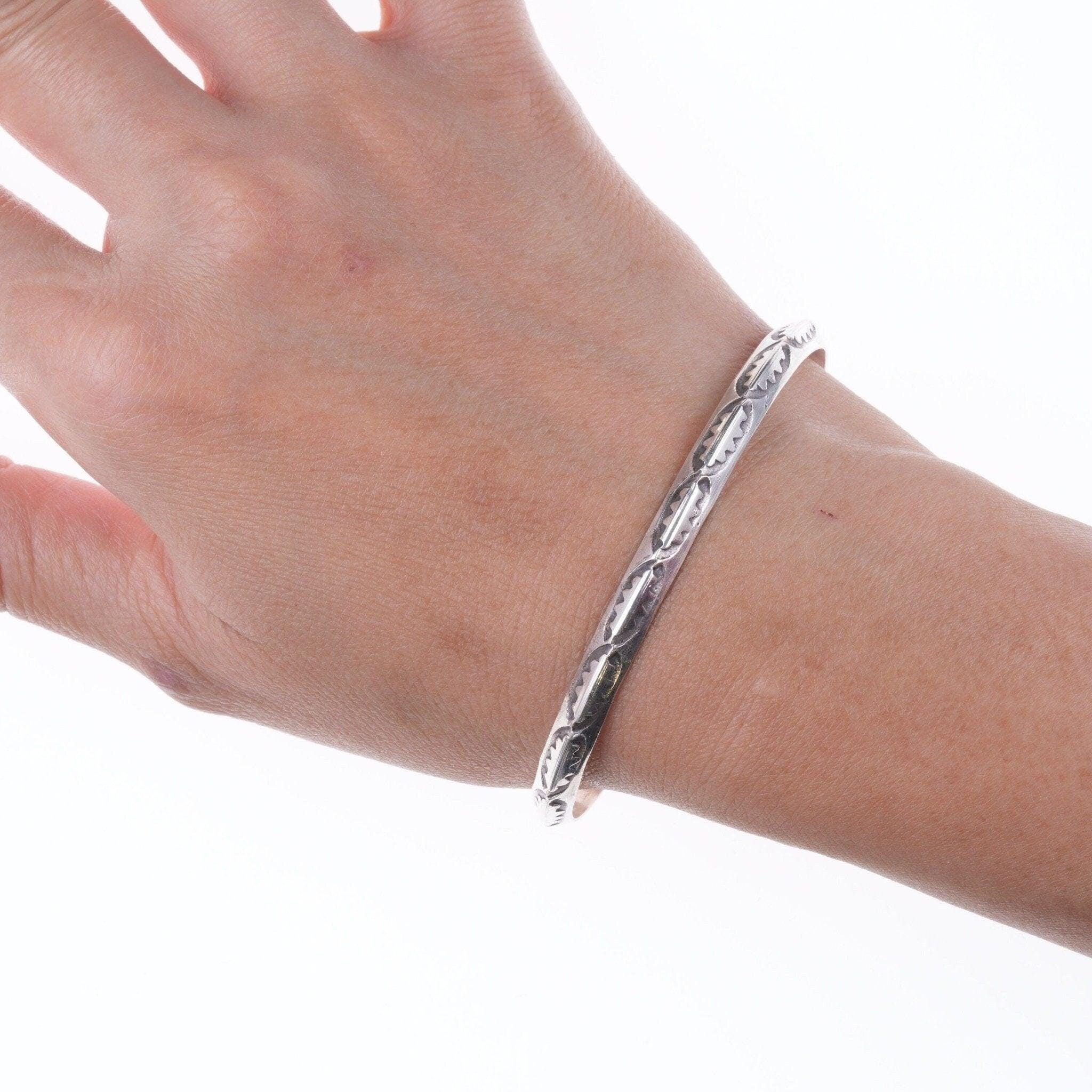6 5/8" Vintage Heavy stamped Navajo bracelet. Nice deep hand stamped silver,<br>unmarked. I'm offering one but there were two of these nearly identical<br>obviously made by the same hand from this estate, you can change the qty to buy<br>both. 12 grams.<br><br>All precious metals are tested and guaranteed, any Native American jewelry<br>referred to as Silver or Sterling is guaranteed to be a minimum of 90% (coin)<br>silver and possibly higher content. Anything marked is guaranteed to be what<br>it's marked, most bracelets are photographed on a 6" wrist (non hairy), rings<br>photographed on the appropriate sized finger when possible. With bracelets if<br>the measurement is not given in the description then inside circumference is<br>shown where the metal meets the number on the the cloth tape measure.