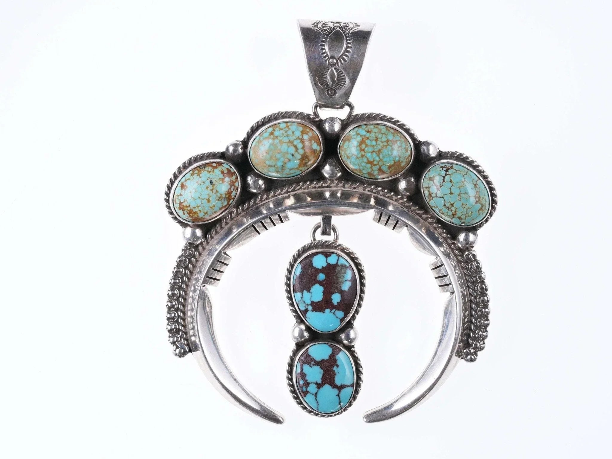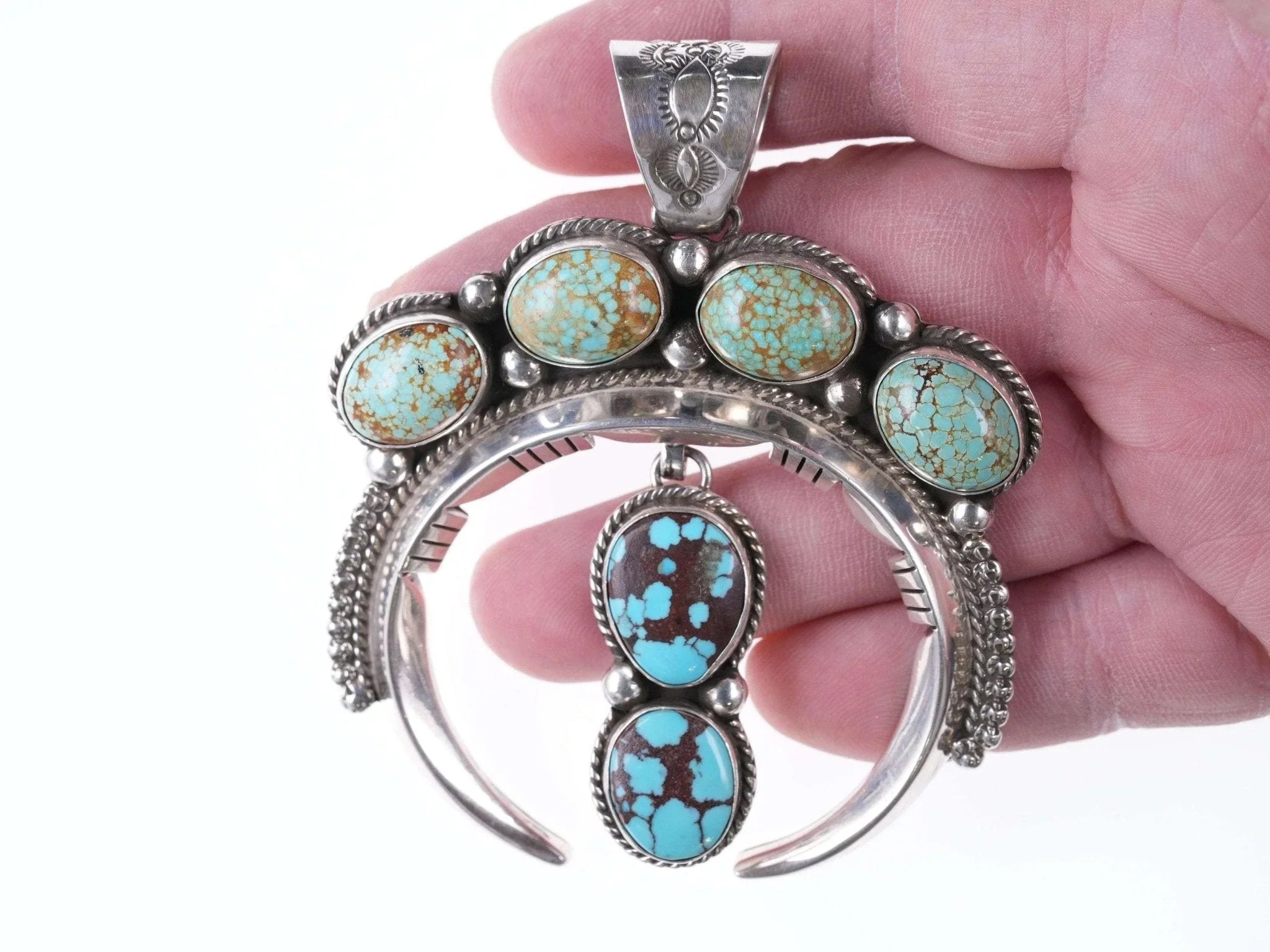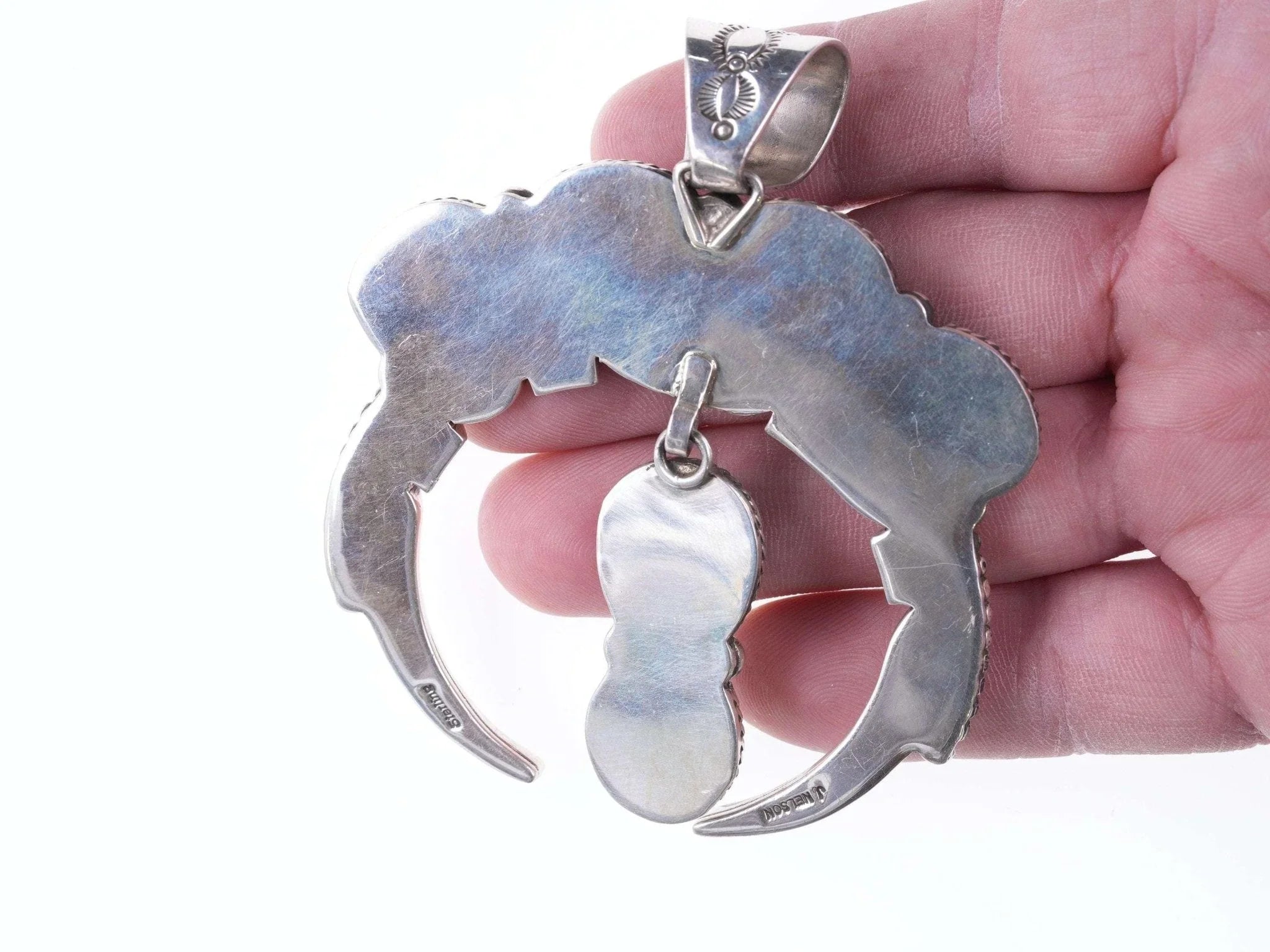 John Nelson Navajo Sterling and ber-Burnham turquoise pendant 3.5" tall x 3" wide x 84.6 grams with no issues. John Nelson is Navajo and was born in Winslow Arizona he has 2 brothers and 2 sisters. He has 3 children and 4 grand-children. He enjoys being outside and especially loves going to garage sales and the flea market. He moved to Albuquerque at a young age and later attended the Albuquerque Indian School. That’s where a good friend in high school taught him how to do silver work. He has been working with silver and turquoise since the 70’s. He’s even had some of his inlay work featured it the Arizona Highway magazine. He signs his work J Nelson. John Nelson is Navajo and was born in Winslow Arizona he has 2 brothers and 2 sisters. He has 3 children and 4 grand-children. He enjoys being outside and especially loves going to garage sales and the flea market. He has been working with silver and turquoise since the 70’s. He’s even had some of his inlay work featured in the Arizona Highway magazine. He signs his work J Nelson.