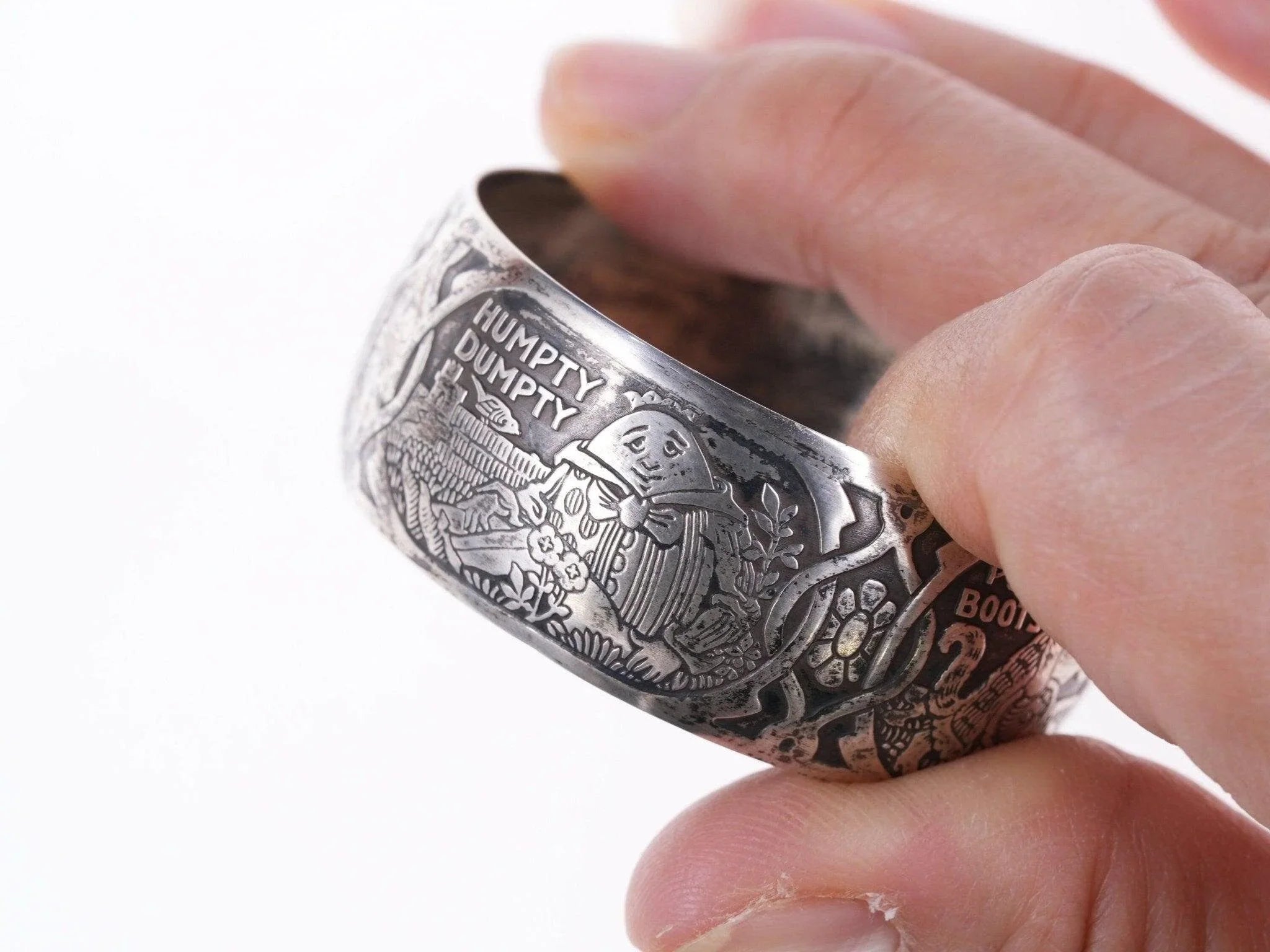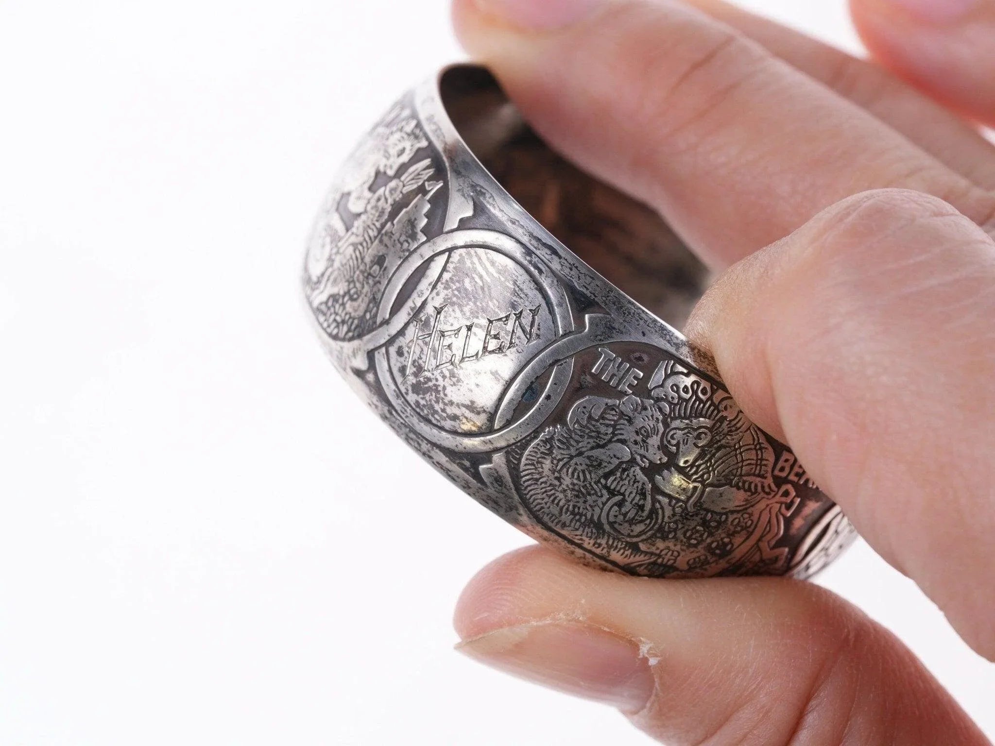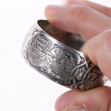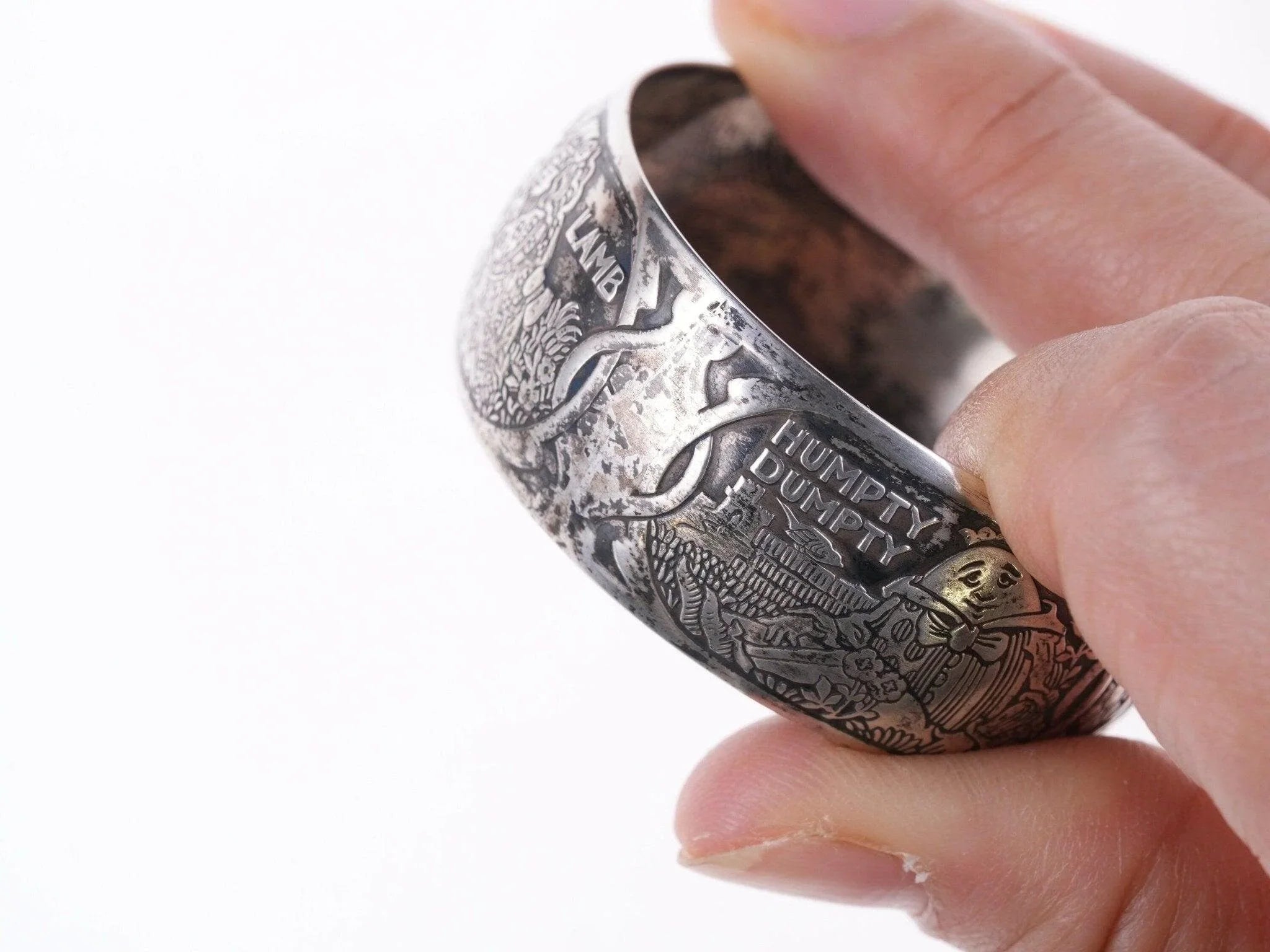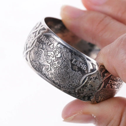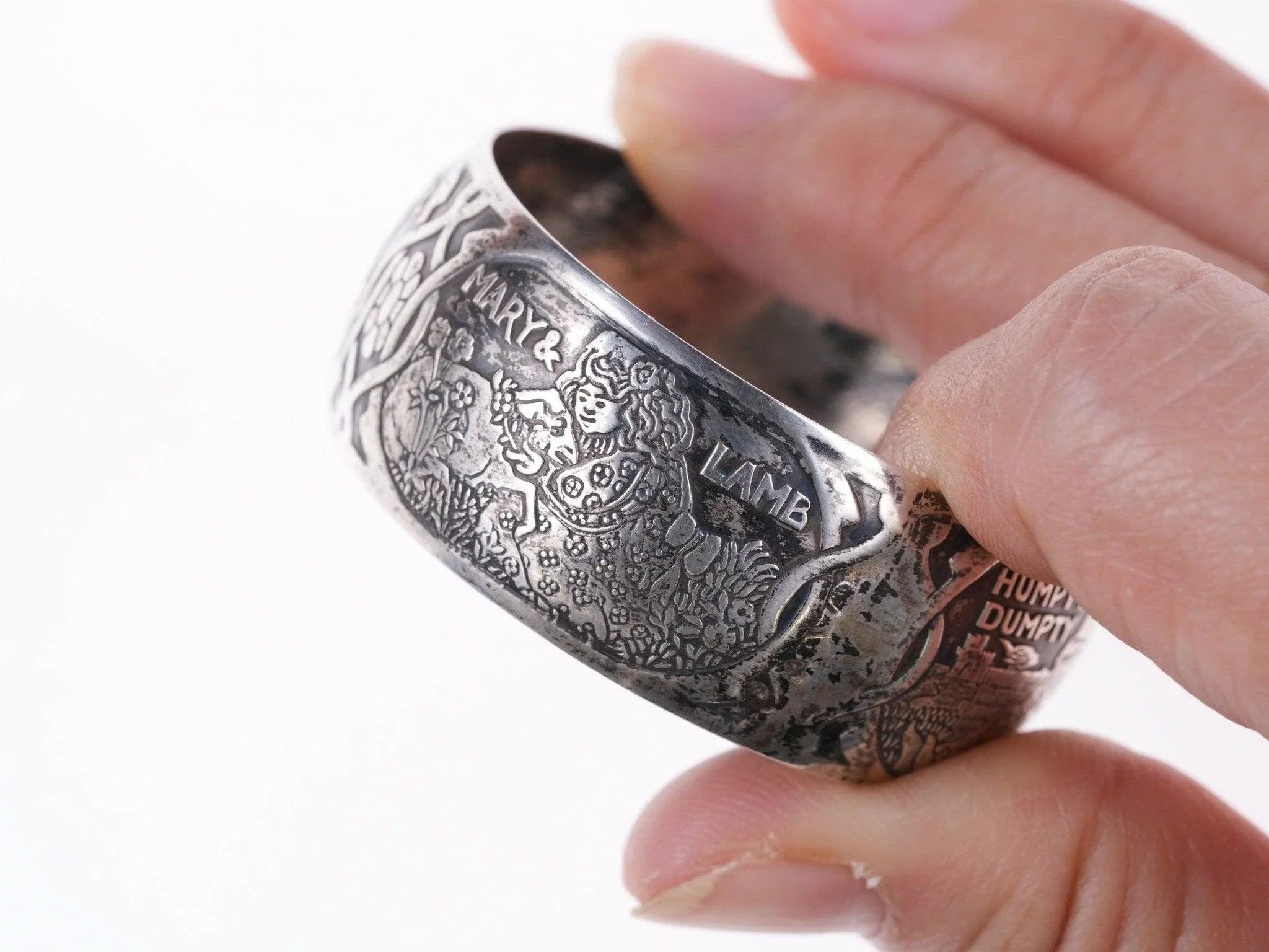 William B. Kerr sterling silver napkin ring, decorated with embossed depictions,<br>featuring different nursery rhymes: "Humpty Dumpty", "Puss In Boots", "The<br>Bears" and "Mary & Lamb". No monograms. Marked 5362.This marvelous napkin ring<br>is 1 3/4" in diameter, 11/16" wide and weighs 16.2 grams. Helen monogram shown,<br>Kerr mark obscured but that's what it is, with same numbers as others I've seen<br>in this shape with Kerr markings.<br><br>William B. Kerr Co. was a manufacturer of jewelry, flatware and hollow-ware.<br>Established in Newark, New Jersey in 1855, they are listed in the 1915 Edition<br>of the Trademarks of the Jewelry and Kindred Trades as having been located at<br>144 Orange St.<br>silverdrawer