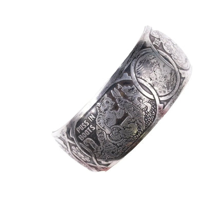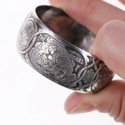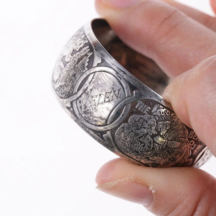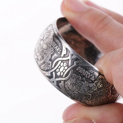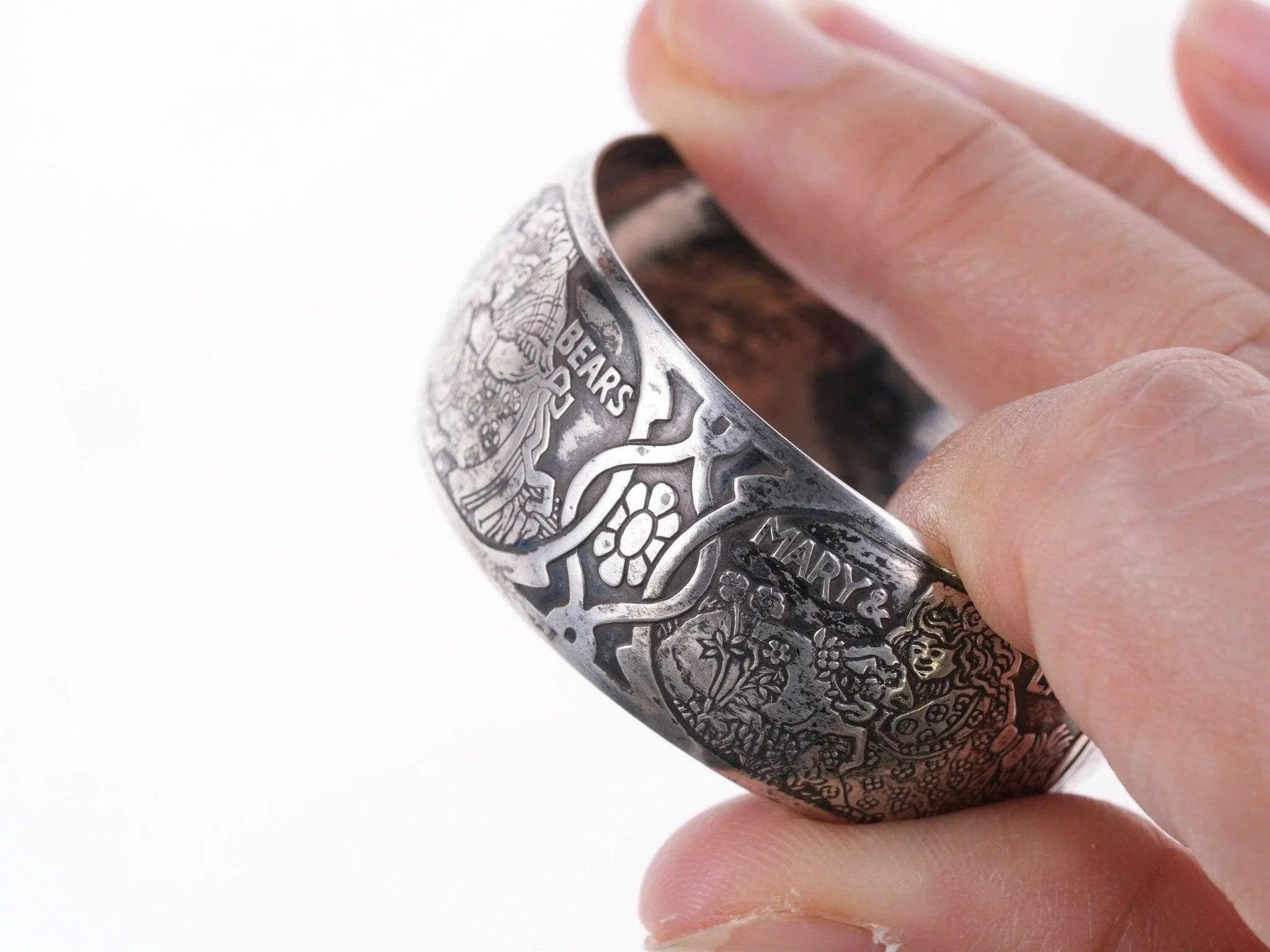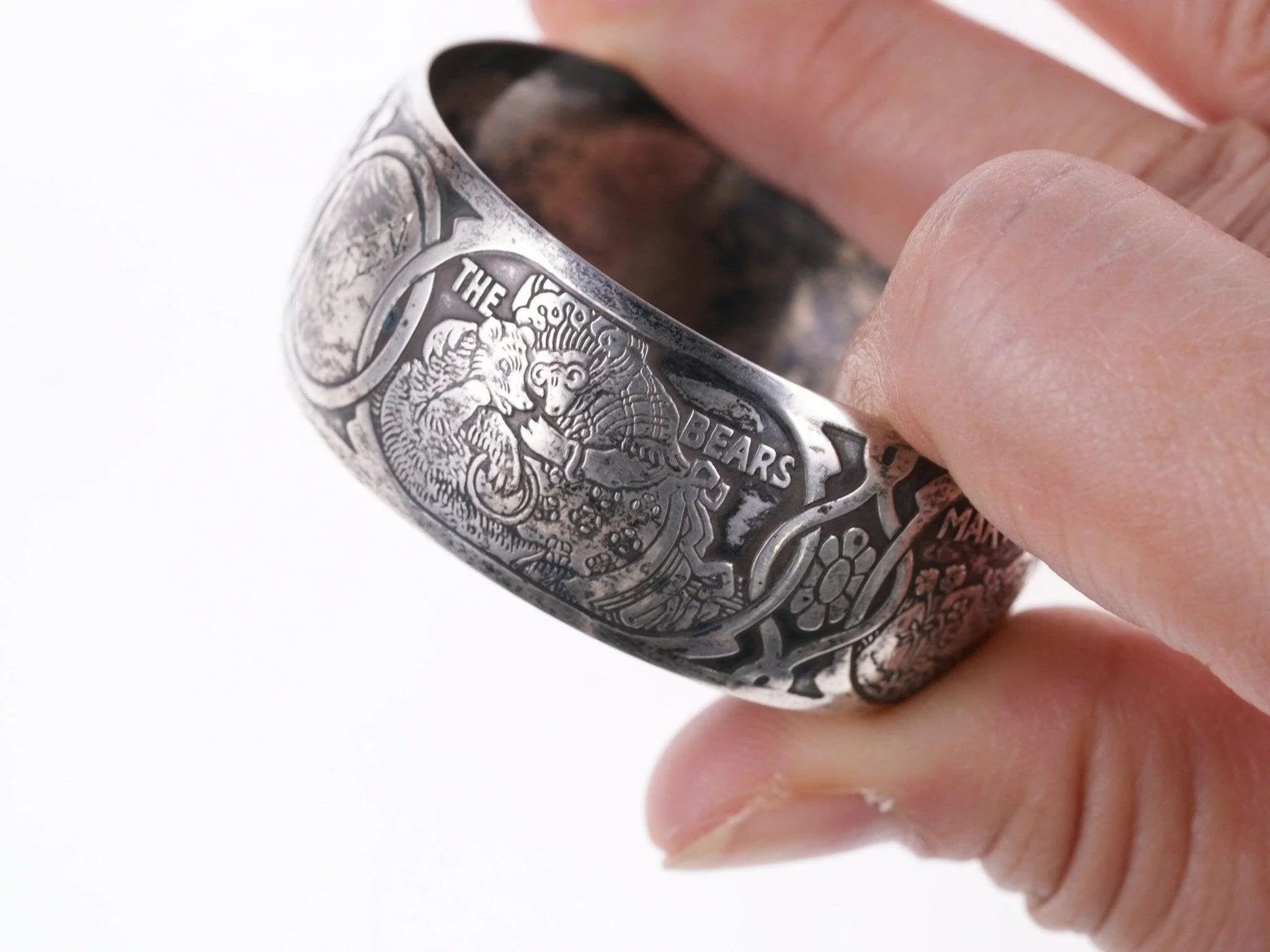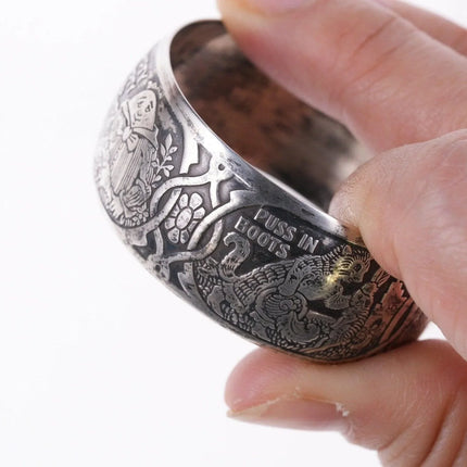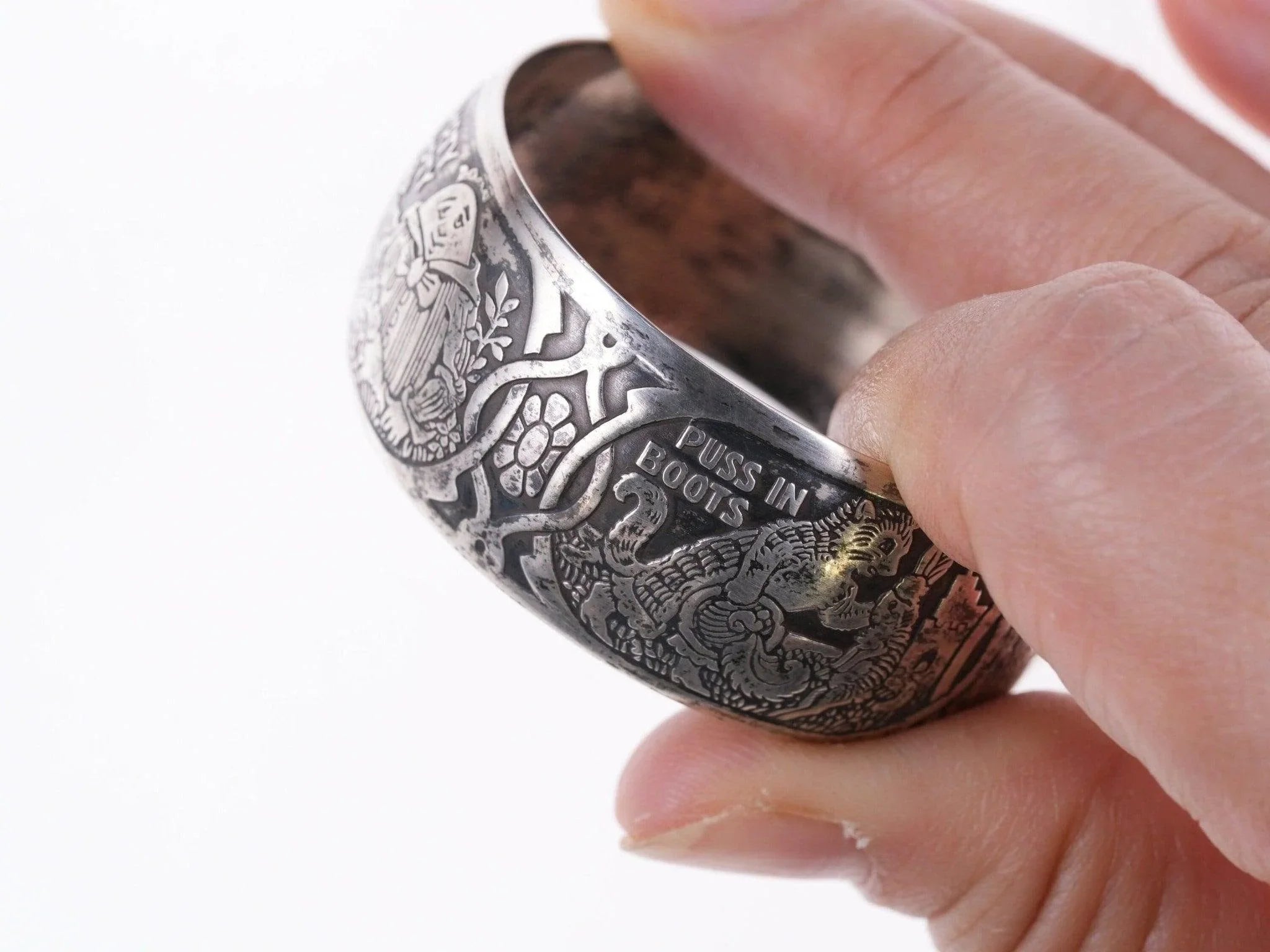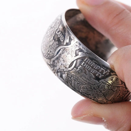 William B. Kerr sterling silver napkin ring, decorated with embossed depictions,<br>featuring different nursery rhymes: "Humpty Dumpty", "Puss In Boots", "The<br>Bears" and "Mary & Lamb". No monograms. Marked 5362.This marvelous napkin ring<br>is 1 3/4" in diameter, 11/16" wide and weighs 16.2 grams. Helen monogram shown,<br>Kerr mark obscured but that's what it is, with same numbers as others I've seen<br>in this shape with Kerr markings.<br><br>William B. Kerr Co. was a manufacturer of jewelry, flatware and hollow-ware.<br>Established in Newark, New Jersey in 1855, they are listed in the 1915 Edition<br>of the Trademarks of the Jewelry and Kindred Trades as having been located at<br>144 Orange St.<br>silverdrawer