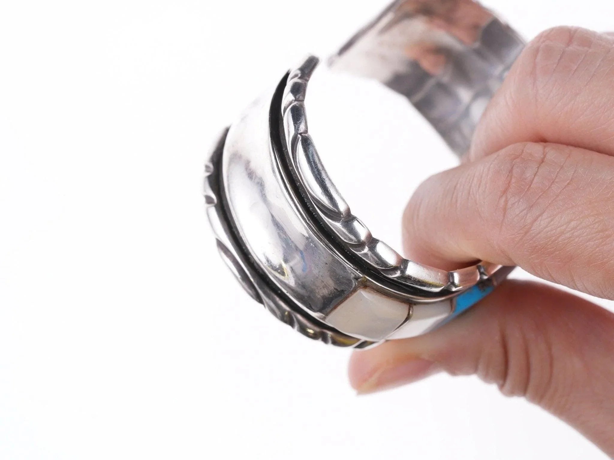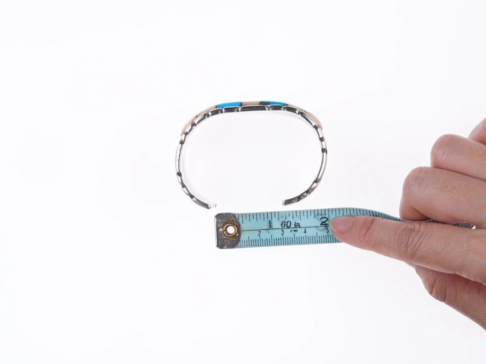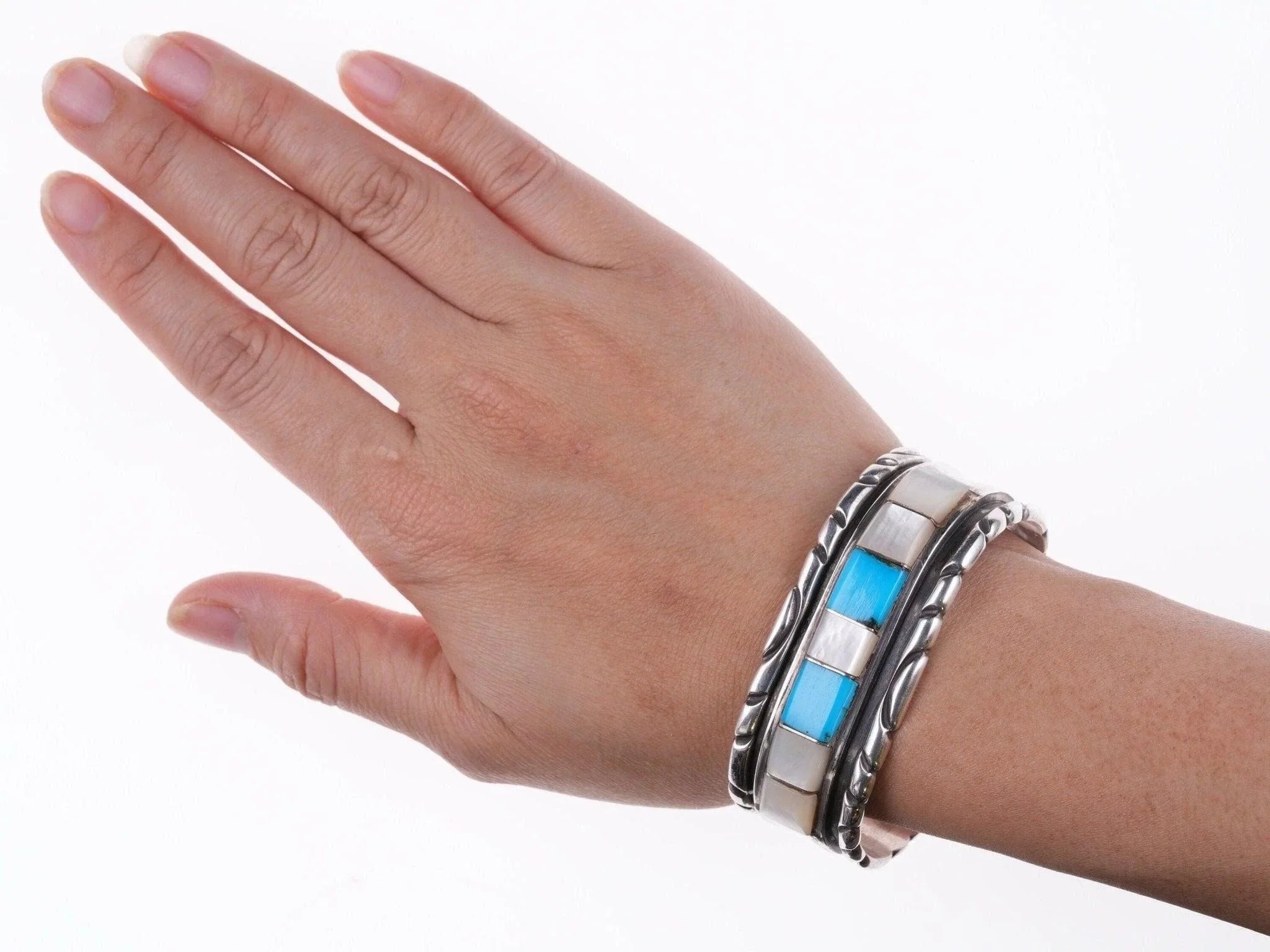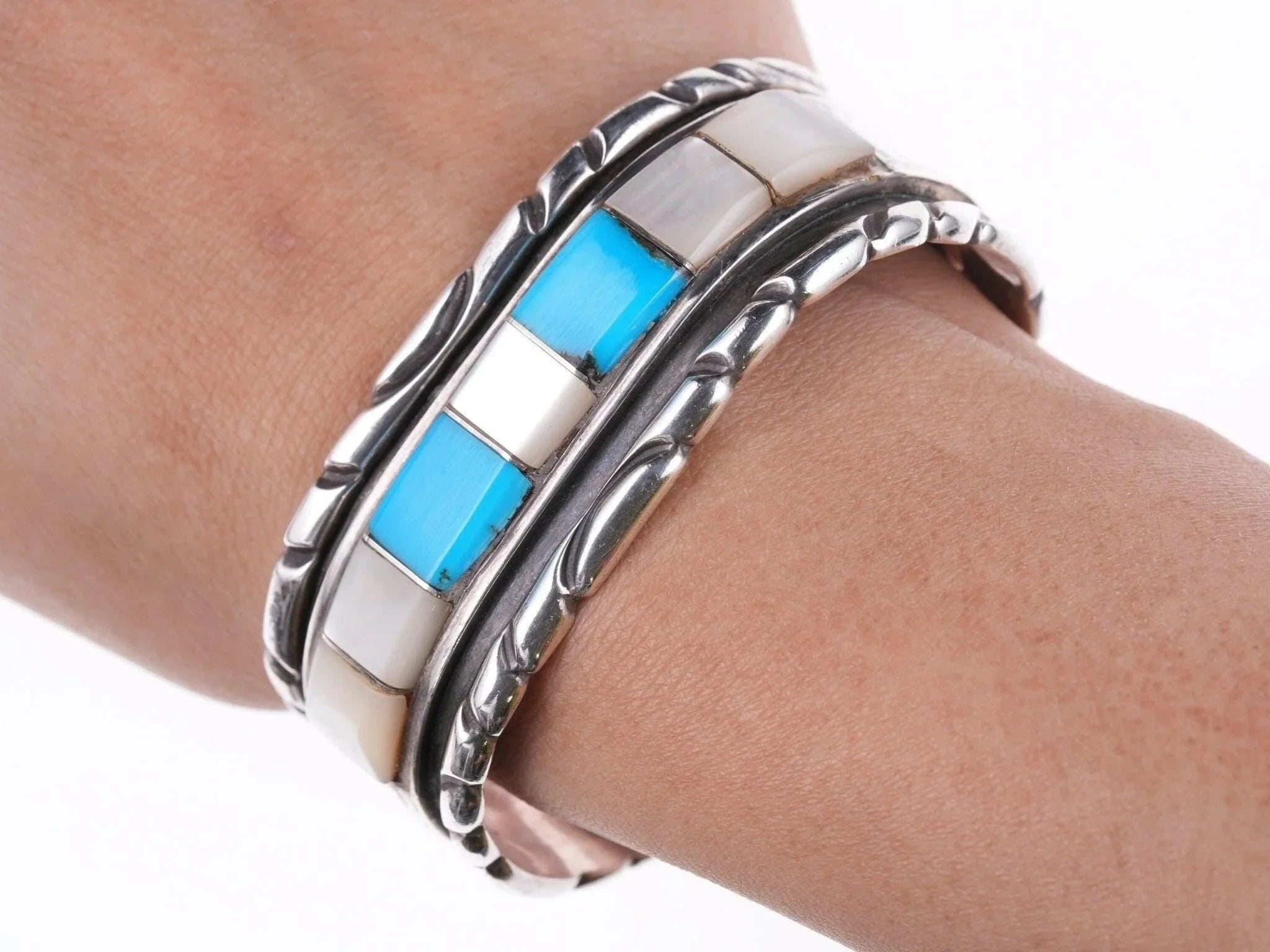 6.5" Vintage Native American silver - Turquoise and mother of pearl channel inlay bracelet. No issues, nice vintage bracelet.