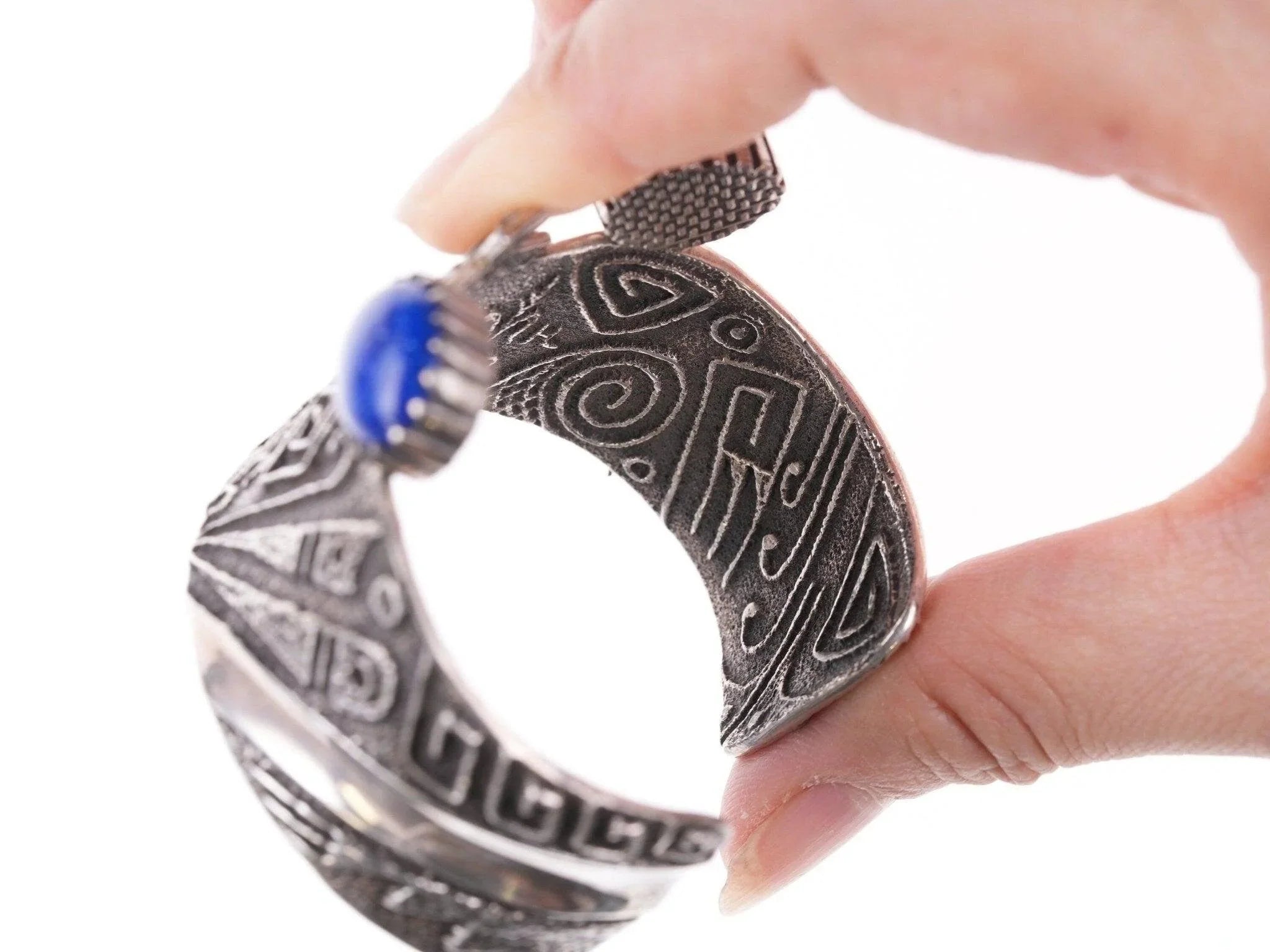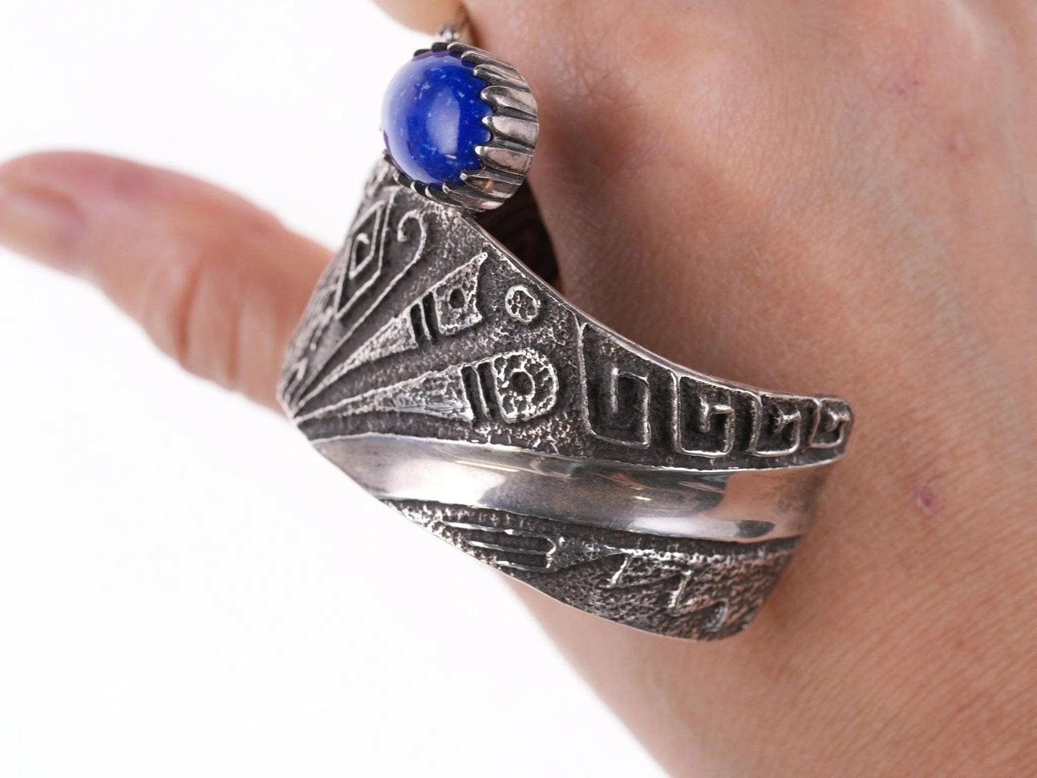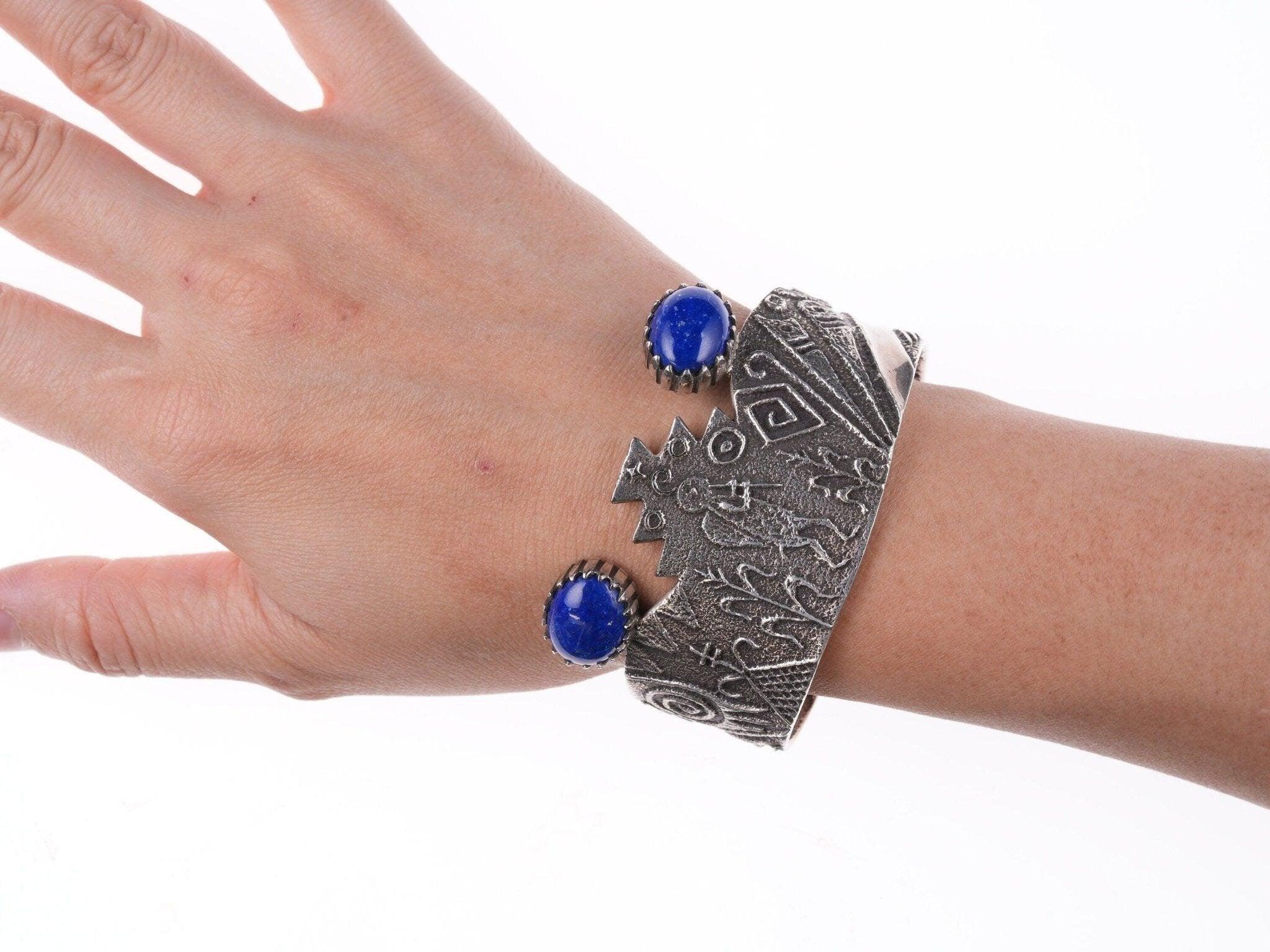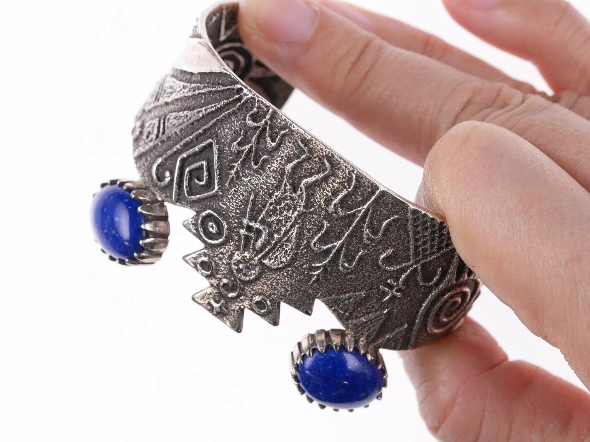 6.5" Harold Lovato (1954-1997) Kewa Tufa cast silver lapis bracelet.<br><br>Harold Lovato is highly regarded award-winning artist. Harold is Kewa (Santo<br>Domingo) Corn Clan. Born on January 2, 1954, he was making jewelry from 1970s.<br>Sadly he died in 1997. He was a grandson of Santiago Leo Coriz (one of the most<br>widely known Santo Domingo Jewelers) & Lupe Tenorio Coriz, a son of Sedelio<br>Lovato & Mary Lovato. Harold’s father Sedelio is an important figure in the<br>history of Kewa tufa cast jewelry. He learned how to cast silver from his<br>father-in -law, Leo Coriz. In 1970s, he created unique and innovative designs.<br>Harold Lovato began competing in juried art shows back in 1974 and he has<br>received top awards at Indian Market, Santa Fe. His work was also featured in<br>several publications such as: SWAIA quarterly, Indian Artist, and others. Harold<br>will long be remembered as one of the finest contemporary jewelry designers.<br><br>All precious metals are tested and guaranteed, any Native American jewelry<br>referred to as Silver or Sterling is guaranteed to be a minimum of 90% (coin)<br>silver and possibly higher content. Anything marked is guaranteed to be what<br>it's marked, most bracelets are photographed on a 6" wrist (non hairy), rings<br>photographed on the appropriate sized finger when possible. With bracelets if<br>the measurement is not given in the description then inside circumference is<br>shown where the metal meets the number on the the cloth tape measure.