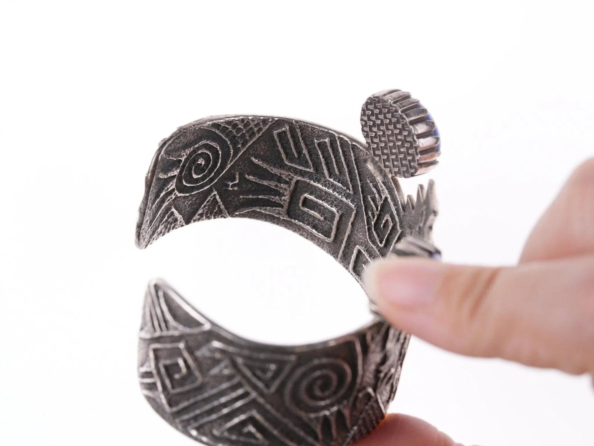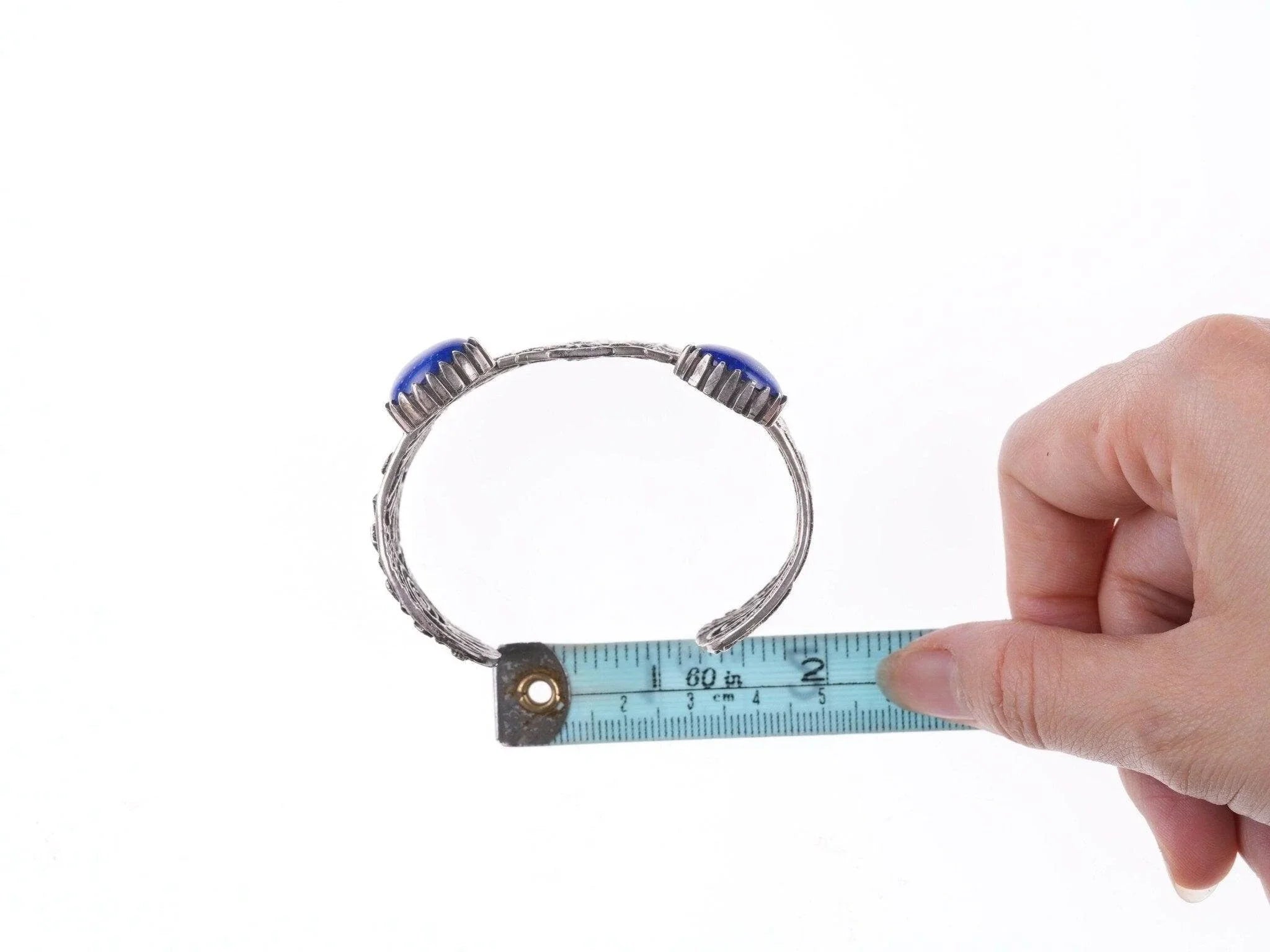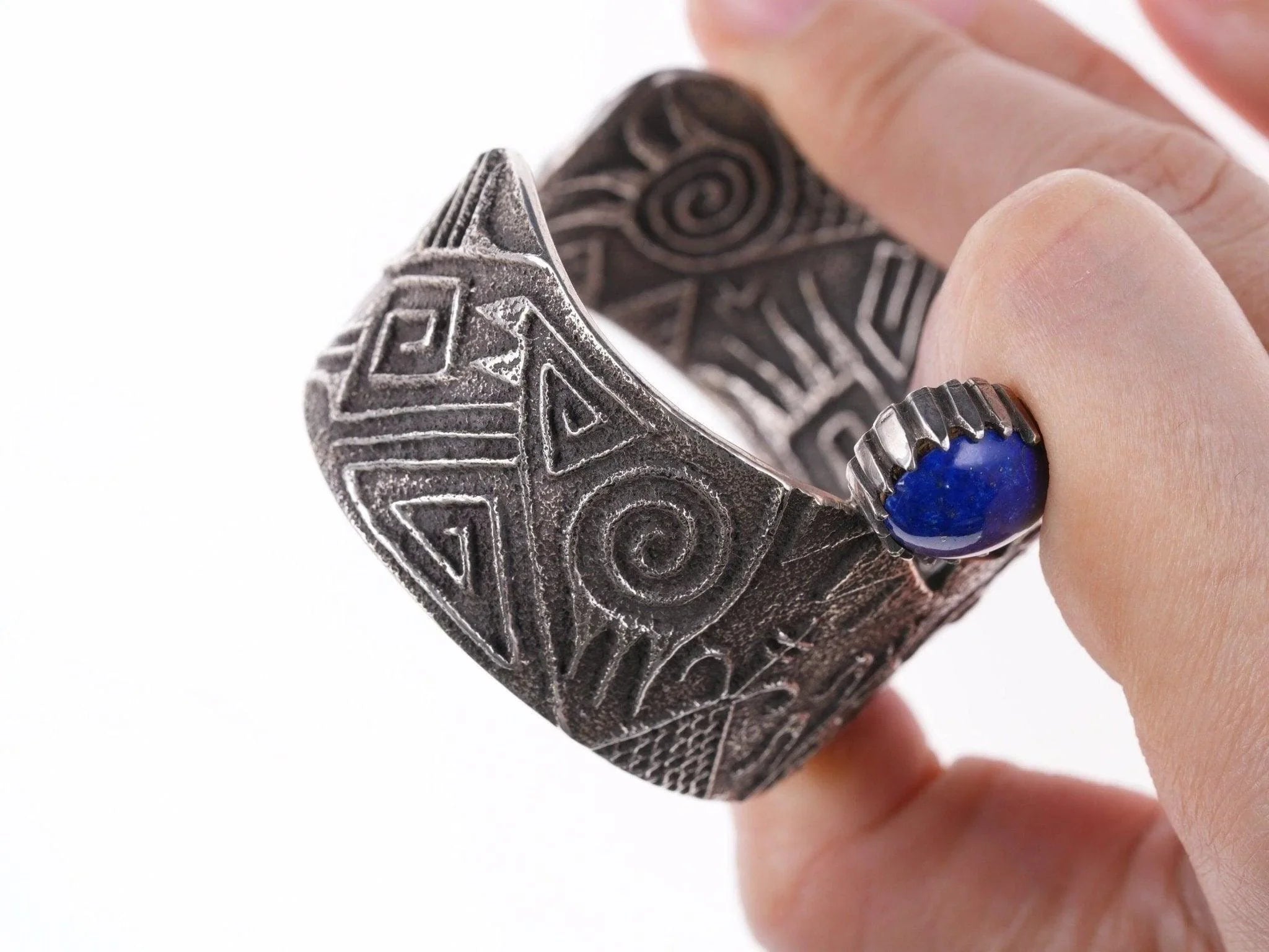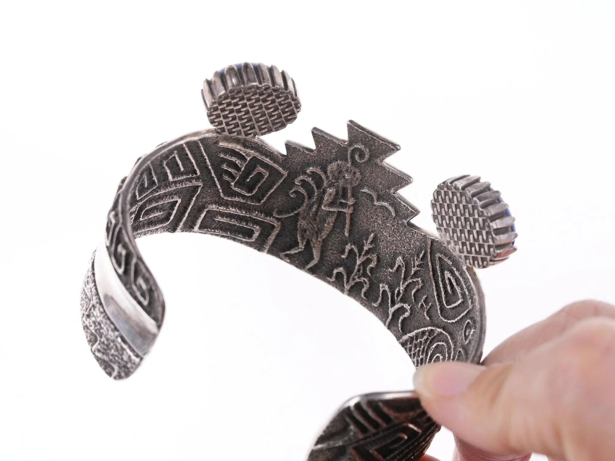 6.5" Harold Lovato (1954-1997) Kewa Tufa cast silver lapis bracelet.<br><br>Harold Lovato is highly regarded award-winning artist. Harold is Kewa (Santo<br>Domingo) Corn Clan. Born on January 2, 1954, he was making jewelry from 1970s.<br>Sadly he died in 1997. He was a grandson of Santiago Leo Coriz (one of the most<br>widely known Santo Domingo Jewelers) & Lupe Tenorio Coriz, a son of Sedelio<br>Lovato & Mary Lovato. Harold’s father Sedelio is an important figure in the<br>history of Kewa tufa cast jewelry. He learned how to cast silver from his<br>father-in -law, Leo Coriz. In 1970s, he created unique and innovative designs.<br>Harold Lovato began competing in juried art shows back in 1974 and he has<br>received top awards at Indian Market, Santa Fe. His work was also featured in<br>several publications such as: SWAIA quarterly, Indian Artist, and others. Harold<br>will long be remembered as one of the finest contemporary jewelry designers.<br><br>All precious metals are tested and guaranteed, any Native American jewelry<br>referred to as Silver or Sterling is guaranteed to be a minimum of 90% (coin)<br>silver and possibly higher content. Anything marked is guaranteed to be what<br>it's marked, most bracelets are photographed on a 6" wrist (non hairy), rings<br>photographed on the appropriate sized finger when possible. With bracelets if<br>the measurement is not given in the description then inside circumference is<br>shown where the metal meets the number on the the cloth tape measure.