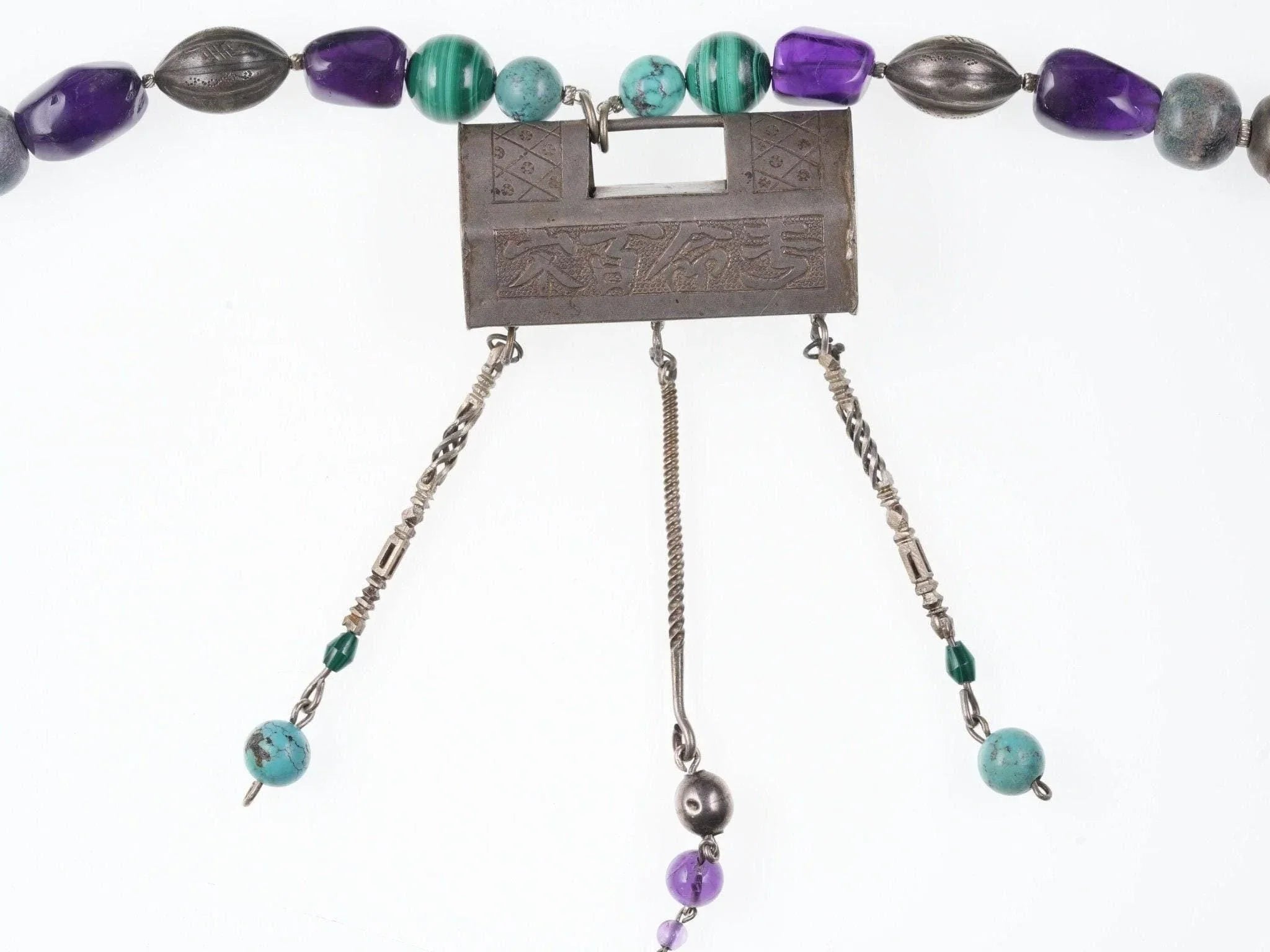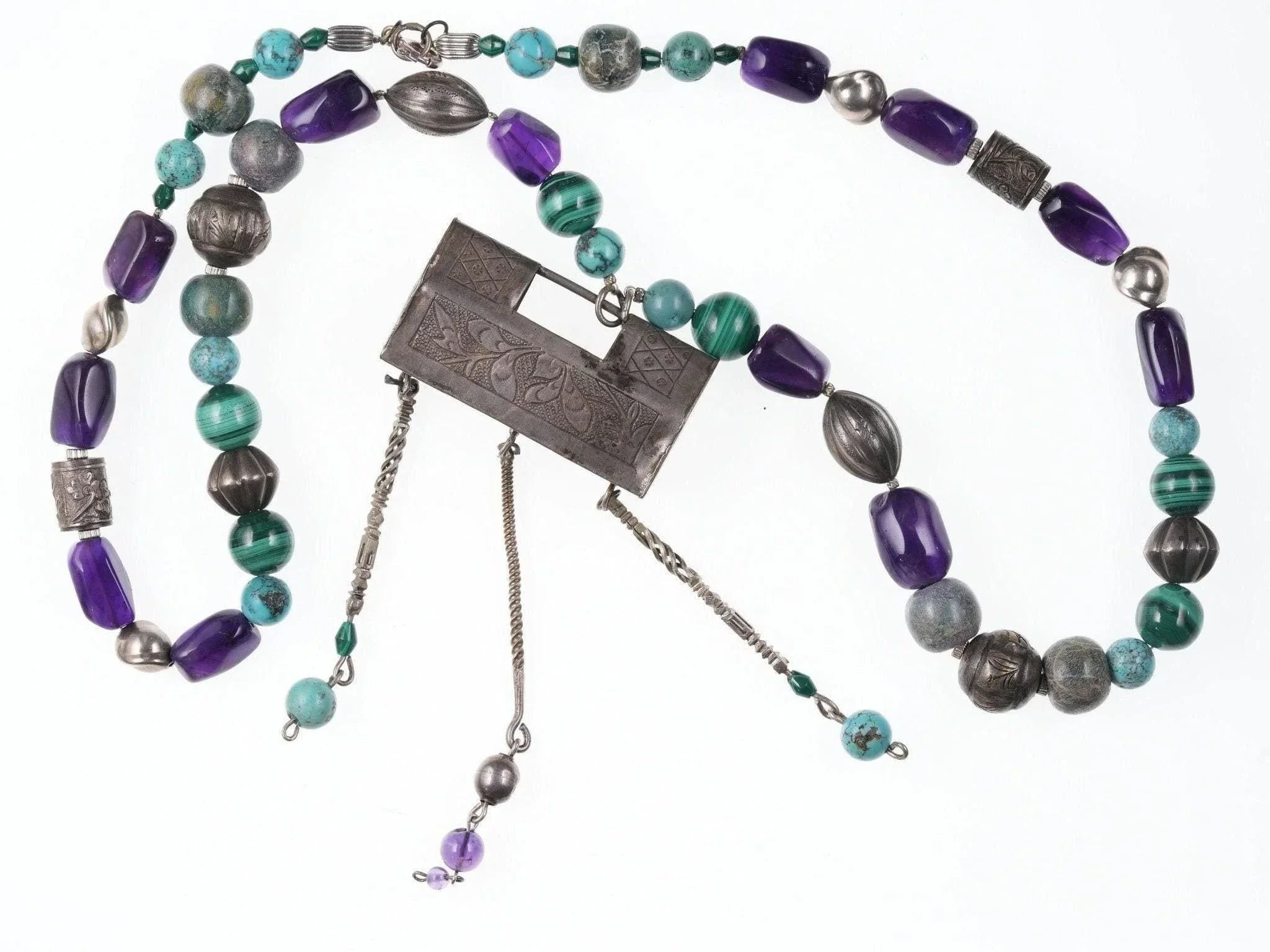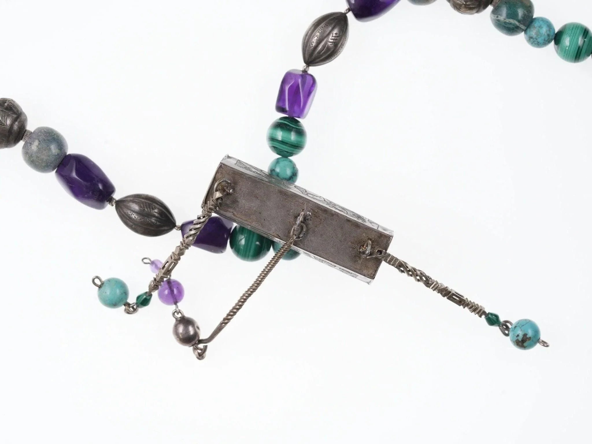 Antique Chinese silver Later beaded necklace. Necklaced last purchased in the<br>last quarter of the 20th century composed of some 19th century Chinese silver<br>pieces, bottom pendant and most of the silver beads are antique, later restrung<br>with contemporary mixed semi-precious gemstone beads. Wonderful work of art one<br>of kind necklace. Necklace 28" long, bottom pendant 5" tall x 2" wide.
