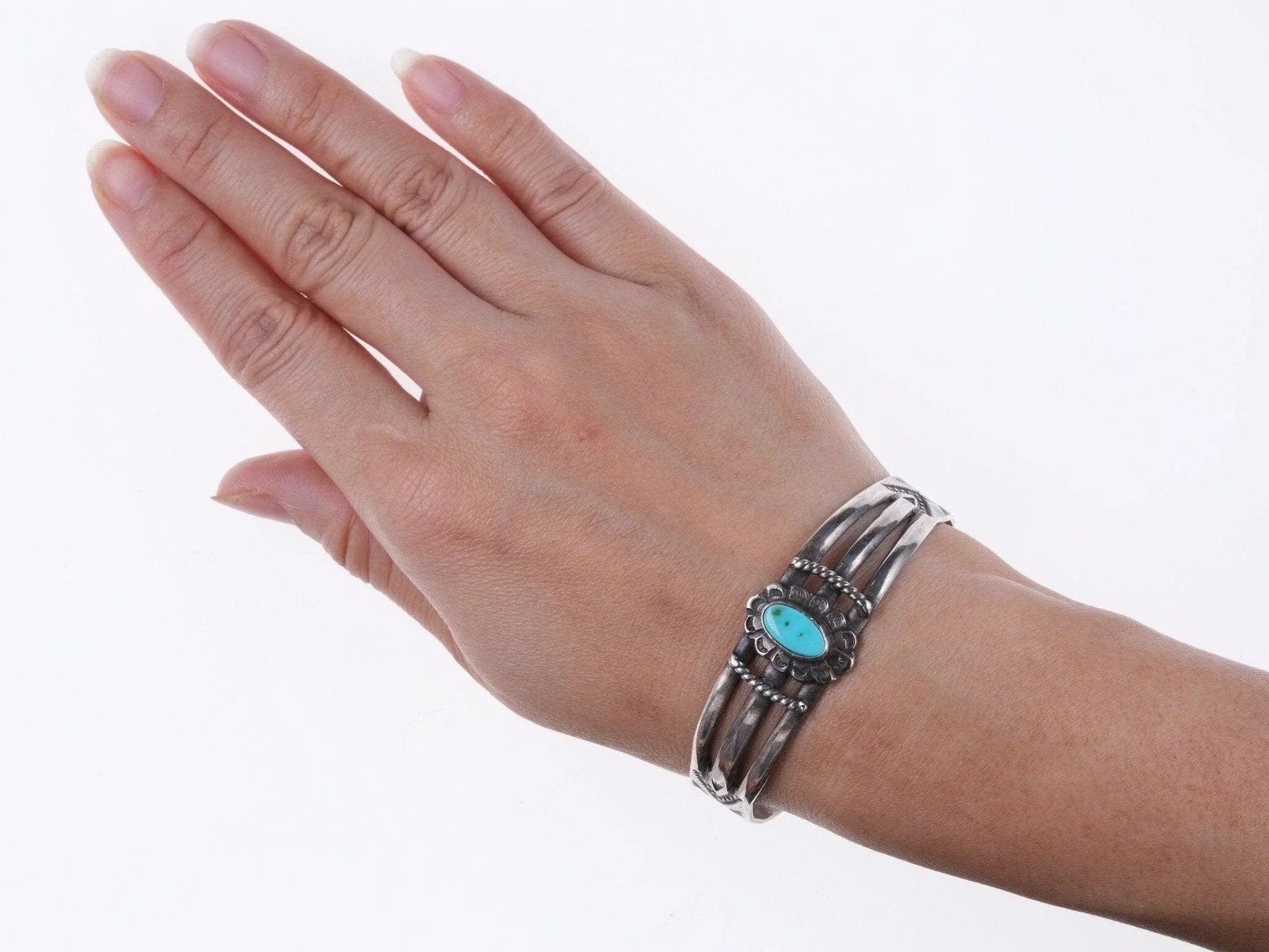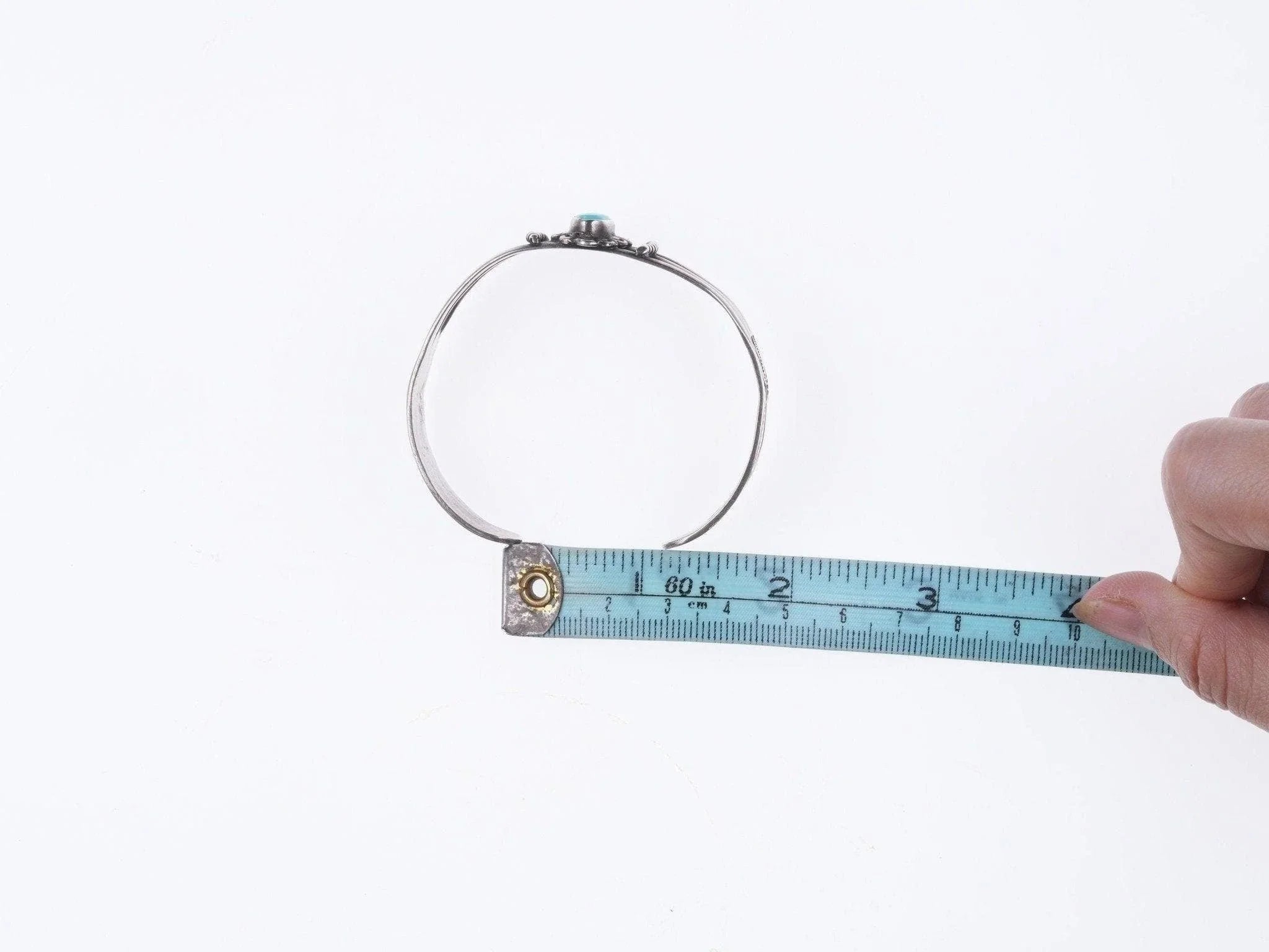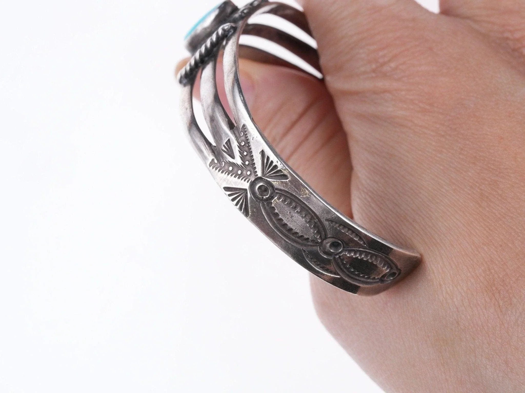 6 5/8" 30's-40's Navajo Hand stamped silver and turquoise bracelet<br><br>All precious metals are tested and guaranteed, any Native American jewelry<br>referred to as Silver or Sterling is guaranteed to be a minimum of 90% (coin)<br>silver and possibly higher content. Anything marked is guaranteed to be what<br>it's marked, most bracelets are photographed on a 6" wrist (non hairy), rings<br>photographed on the appropriate sized finger when possible. With bracelets if<br>the measurement is not given in the description then inside circumference is<br>shown where the metal meets the number on the the cloth tape measure.