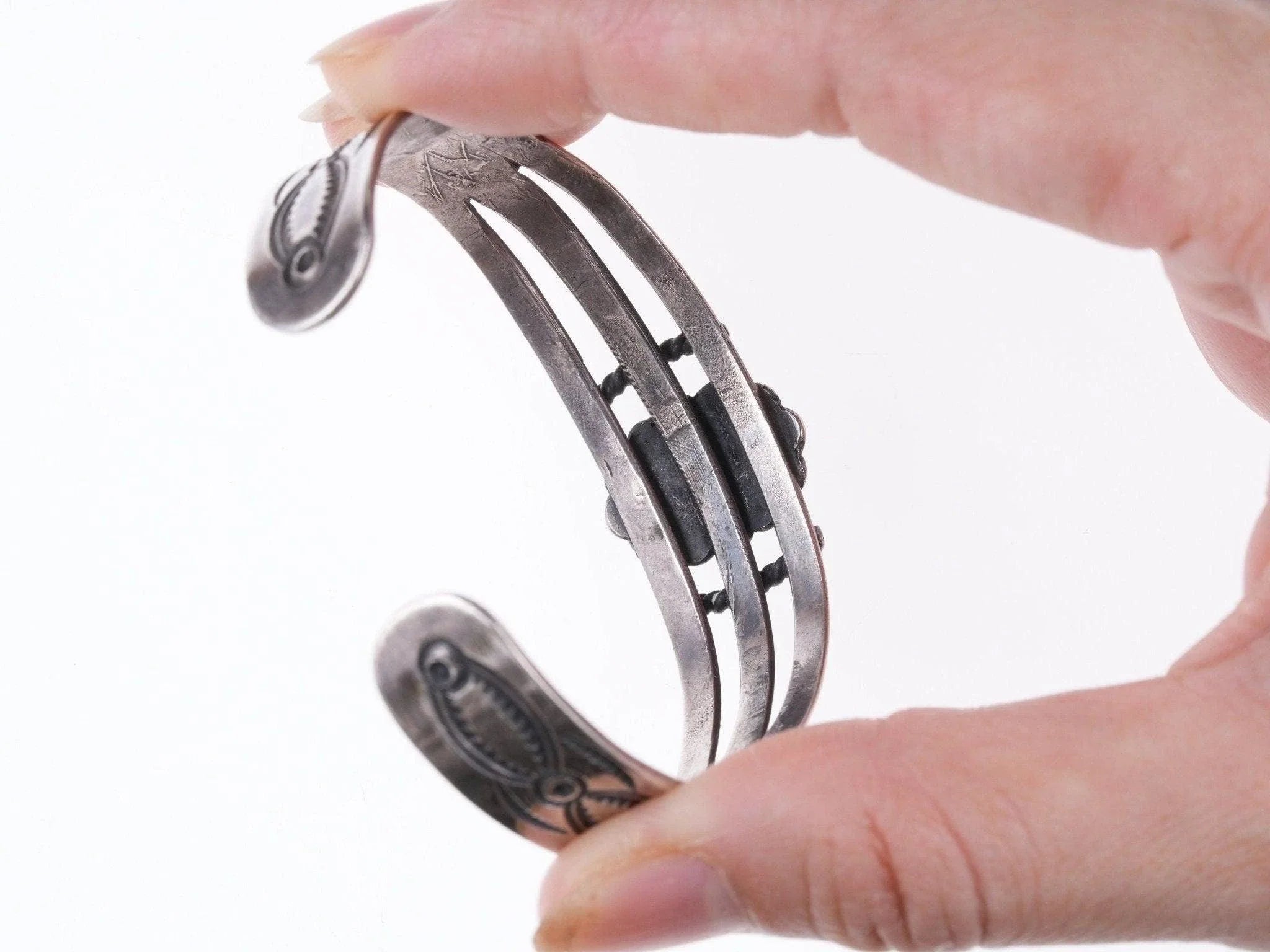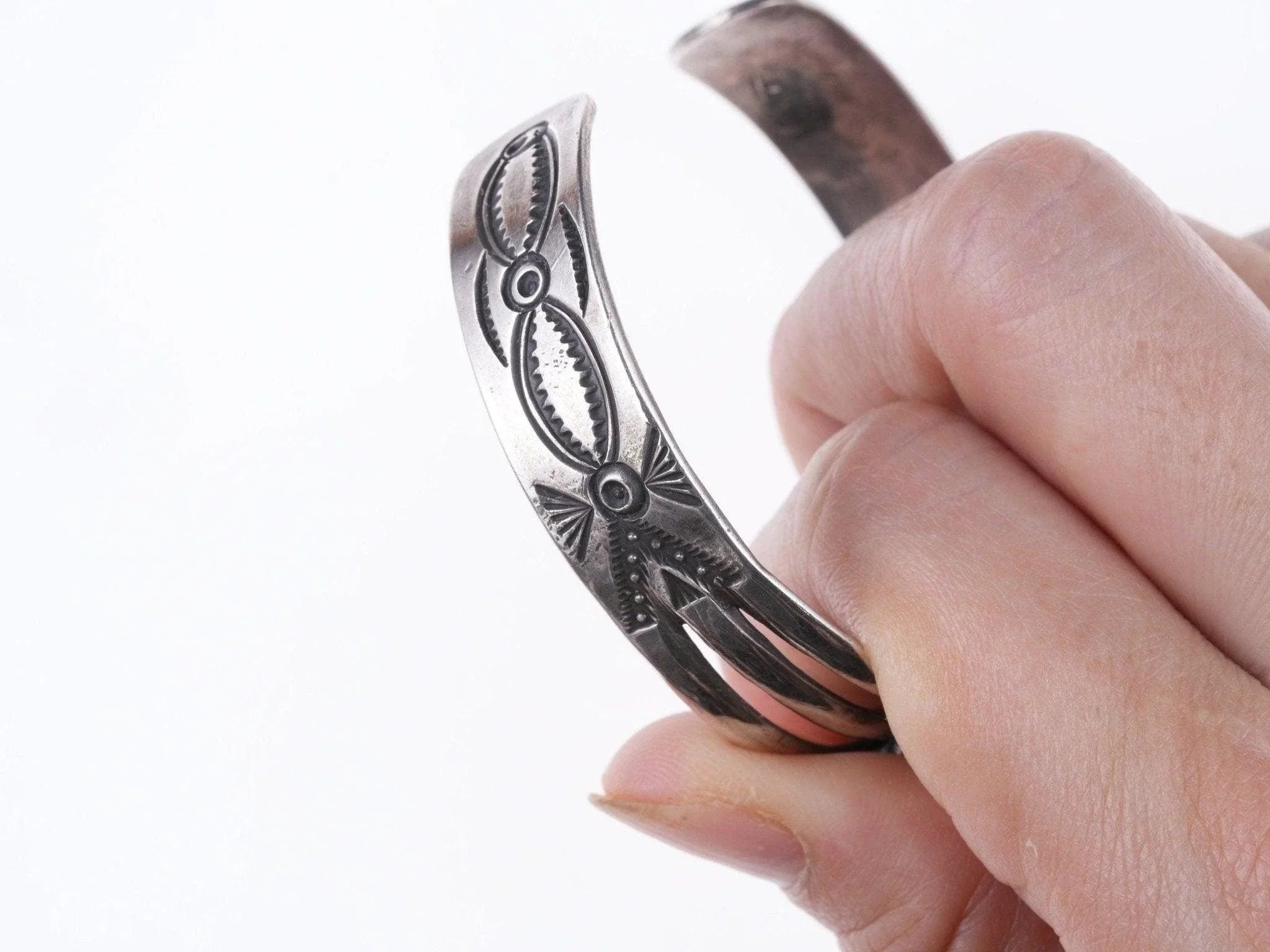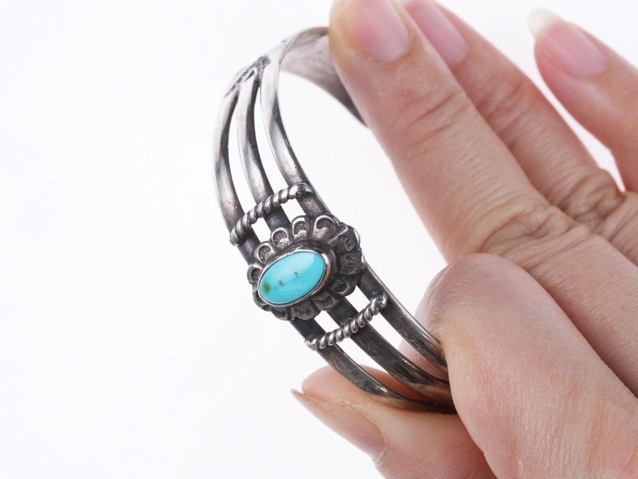 6 5/8" 30's-40's Navajo Hand stamped silver and turquoise bracelet<br><br>All precious metals are tested and guaranteed, any Native American jewelry<br>referred to as Silver or Sterling is guaranteed to be a minimum of 90% (coin)<br>silver and possibly higher content. Anything marked is guaranteed to be what<br>it's marked, most bracelets are photographed on a 6" wrist (non hairy), rings<br>photographed on the appropriate sized finger when possible. With bracelets if<br>the measurement is not given in the description then inside circumference is<br>shown where the metal meets the number on the the cloth tape measure.