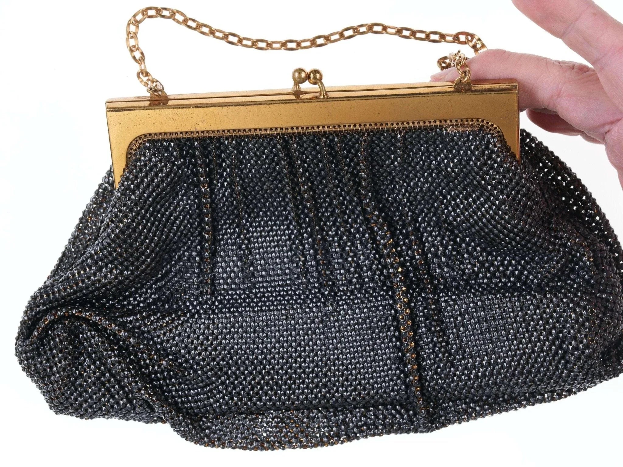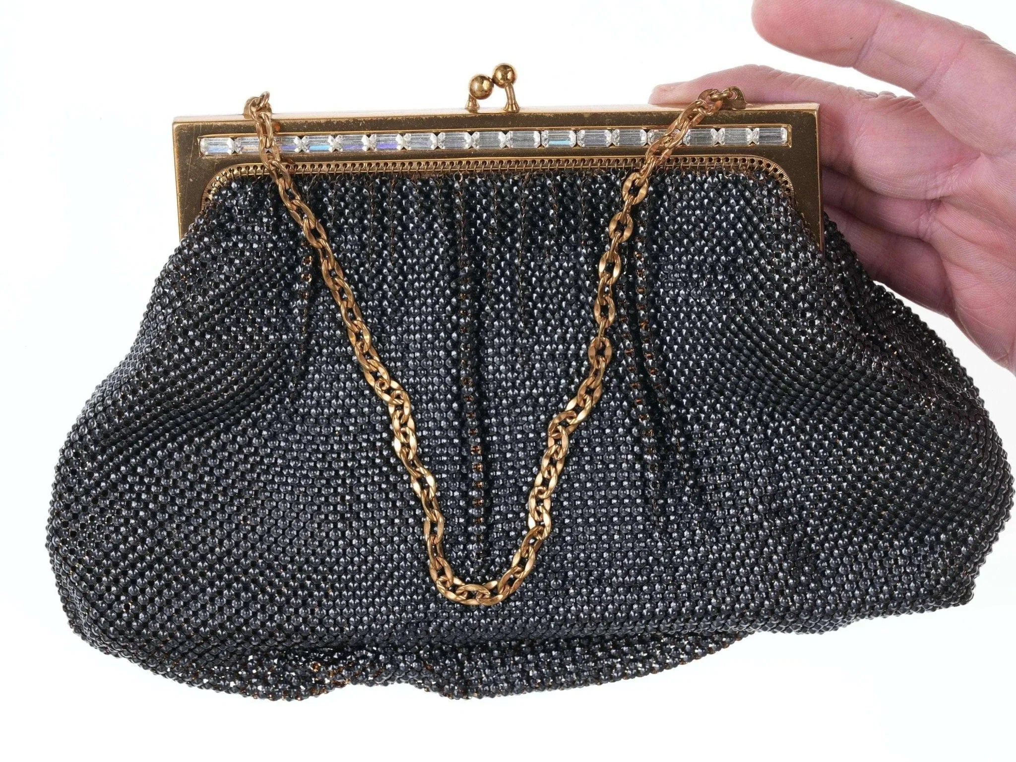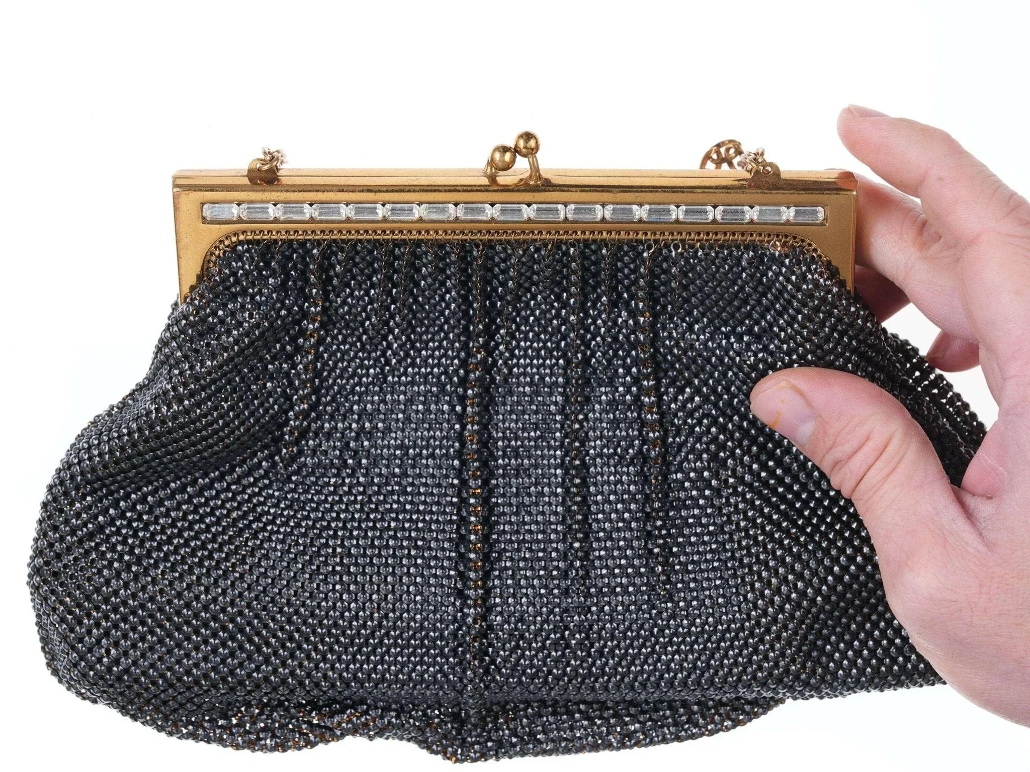 Mid Century Vintage Whiting and Davis Mesh handbag with Rhinestone top. Likely from the 50's or 60's but looks like new with no damage or detectable wear. 6" wide frame, 9.25" wide at base, nice functional size in a beautiful black enamel mesh with an uncommon rhinestone encrusted goldtone top. kitshelf