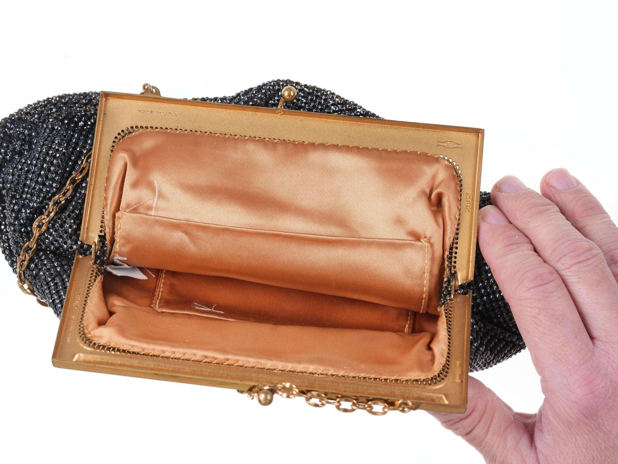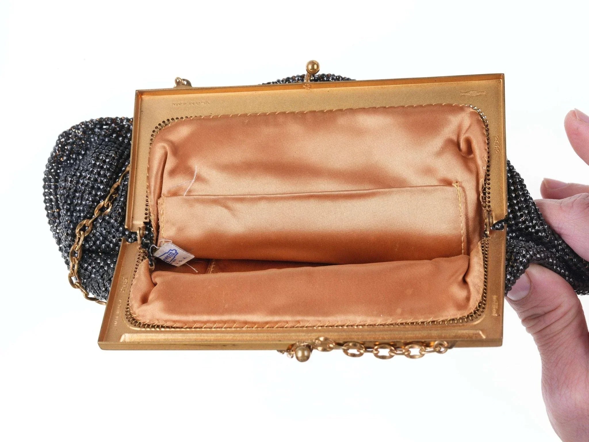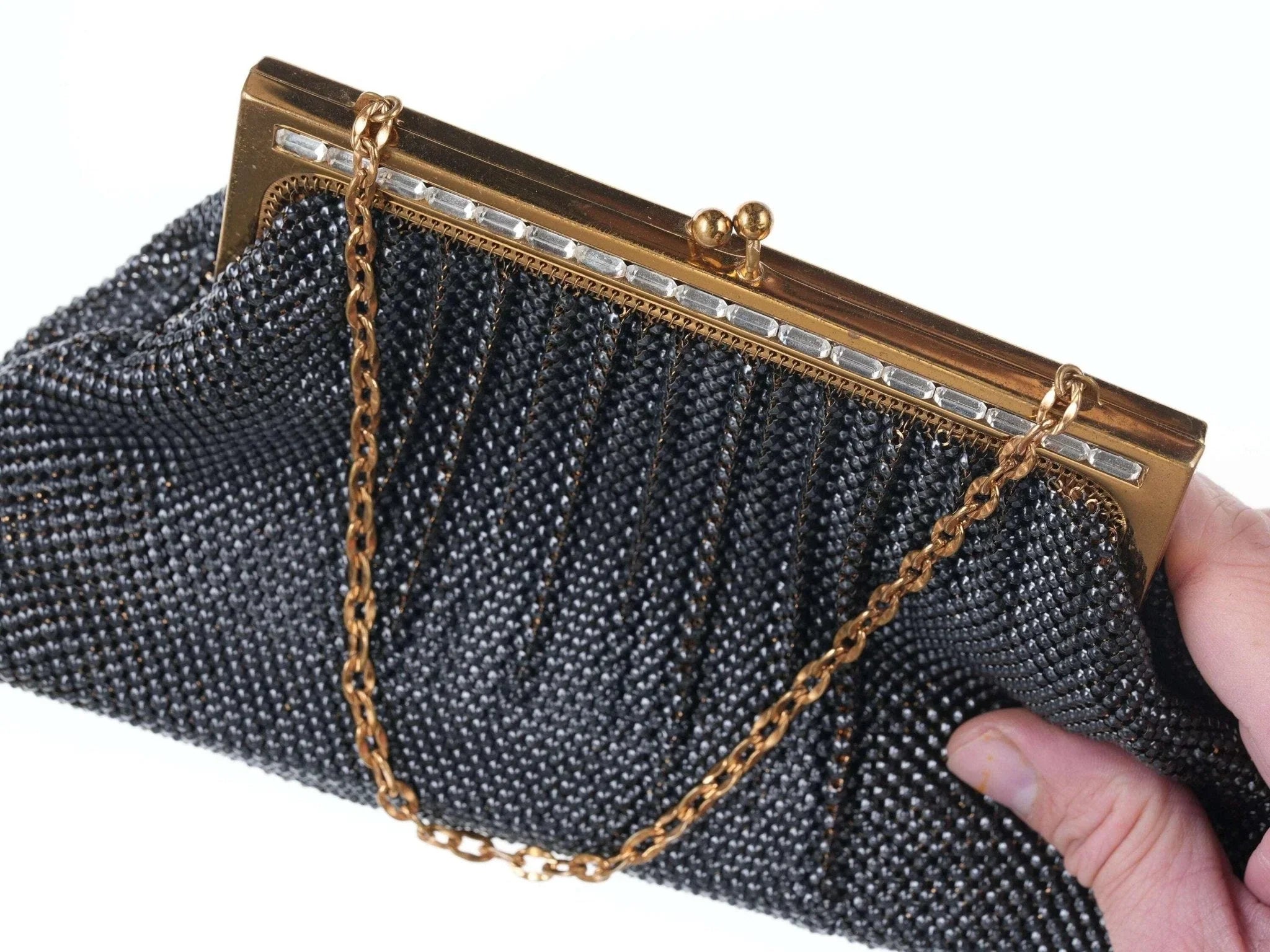 Mid Century Vintage Whiting and Davis Mesh handbag with Rhinestone top. Likely from the 50's or 60's but looks like new with no damage or detectable wear. 6" wide frame, 9.25" wide at base, nice functional size in a beautiful black enamel mesh with an uncommon rhinestone encrusted goldtone top. kitshelf