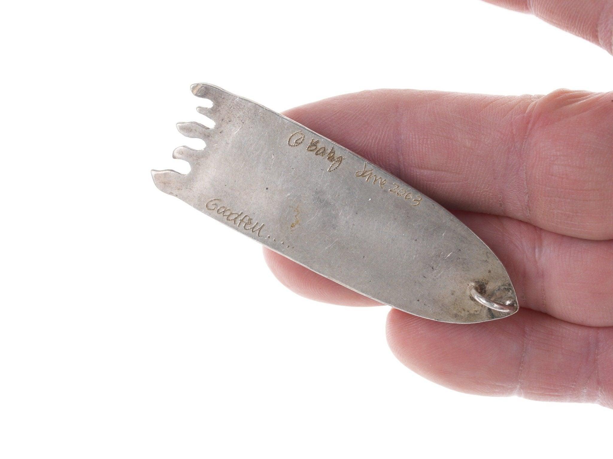 2003 Sterling Baby Jane Goodfell pendant. 2.75" tall x 7/8" wide x 18 grams, tested sterling. Made by the artist Stephanie Lindsay from Austin, Texas. She signed her works Baby Jane as a tribute to her mother, Betsy Jane Sands. This artist used vintage linen postcards in her jewelry and encapsulated them in sterling silver bezel setting, then she finished the pieces with a resin filling to protect the image and create a clear, glassy surface.