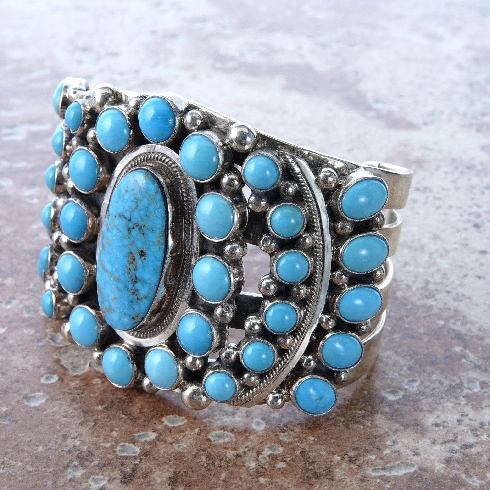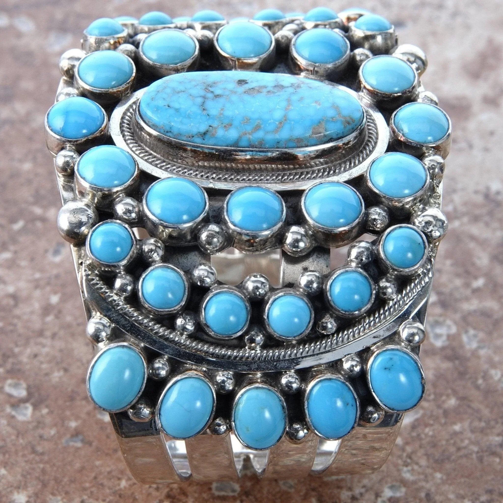 Measures 2 inches wide in the center and tapers at the opening. This piece has<br>the Sleeping Beauty Turquoise stones throughout. The center stone is Oval and<br>the accent cabochon pieces are meticulously hand set with hand made rain drop<br>beads. Inside measures 5.5 inches plus a gap of 1 inch. It could possibly be<br>sized by a professional. Stamped Sterling and Signed "Kathleen Chavez". Weighs<br>105.8 Grams. Native American, Navajo, Southwestern Indian Jewelry.Kathleen<br>Livingston Chavez was born in Church Rock, New Mexico, December 17, 1958. Today,<br>Kathleen lives in Church Rock with her husband Lorenzo Juan, and works out of<br>Gallup, New Mexico. She started to silversmith in 1974, making earrings, rings,<br>and ‘slave bracelets’. In 1994, she began to challenge herself to create<br>higher-end jewelry, which she says is “much more fun to make, because of the<br>amount of thought and imagination that goes into it.”