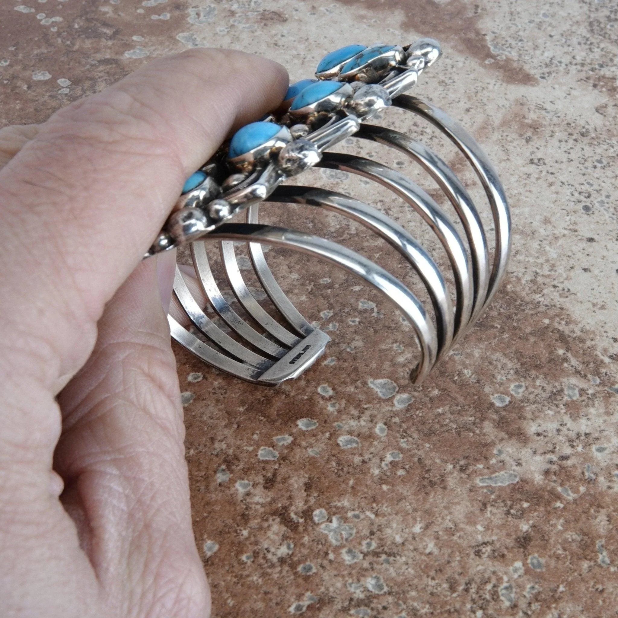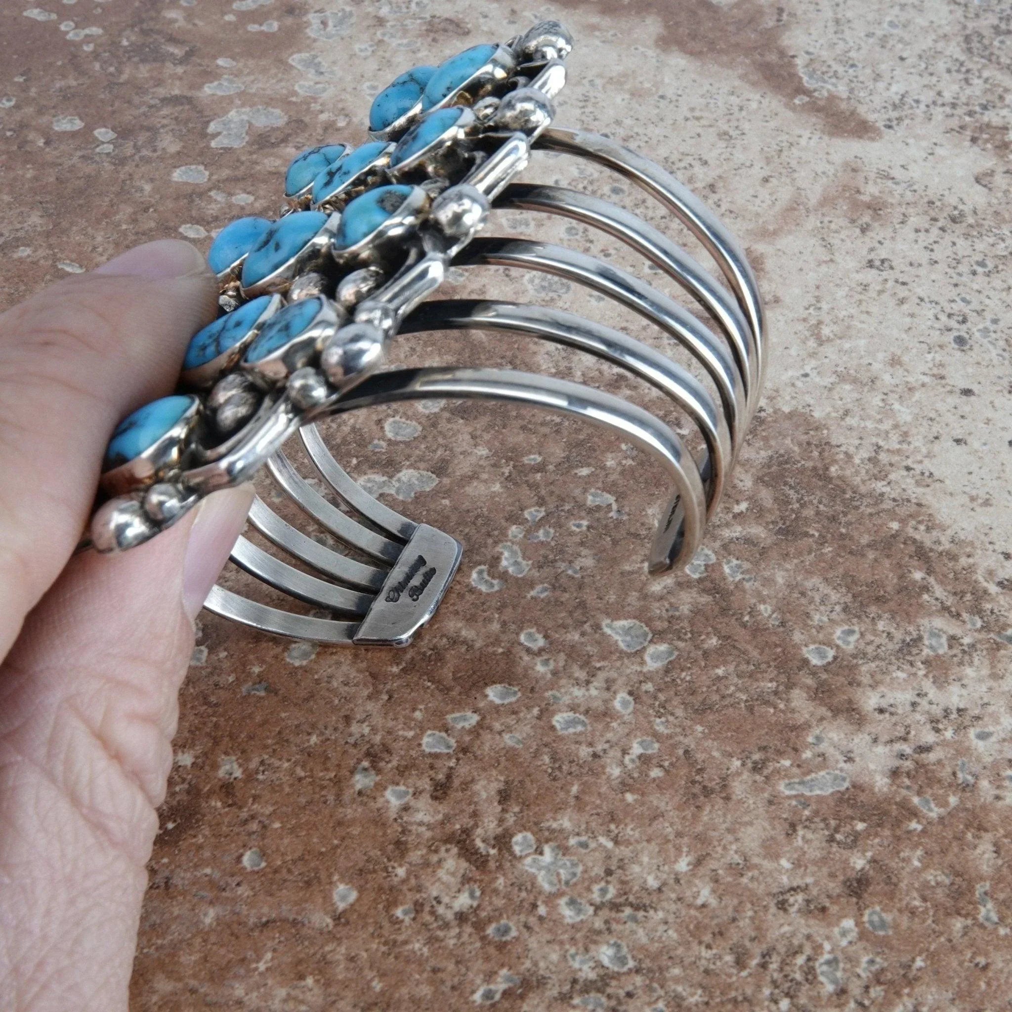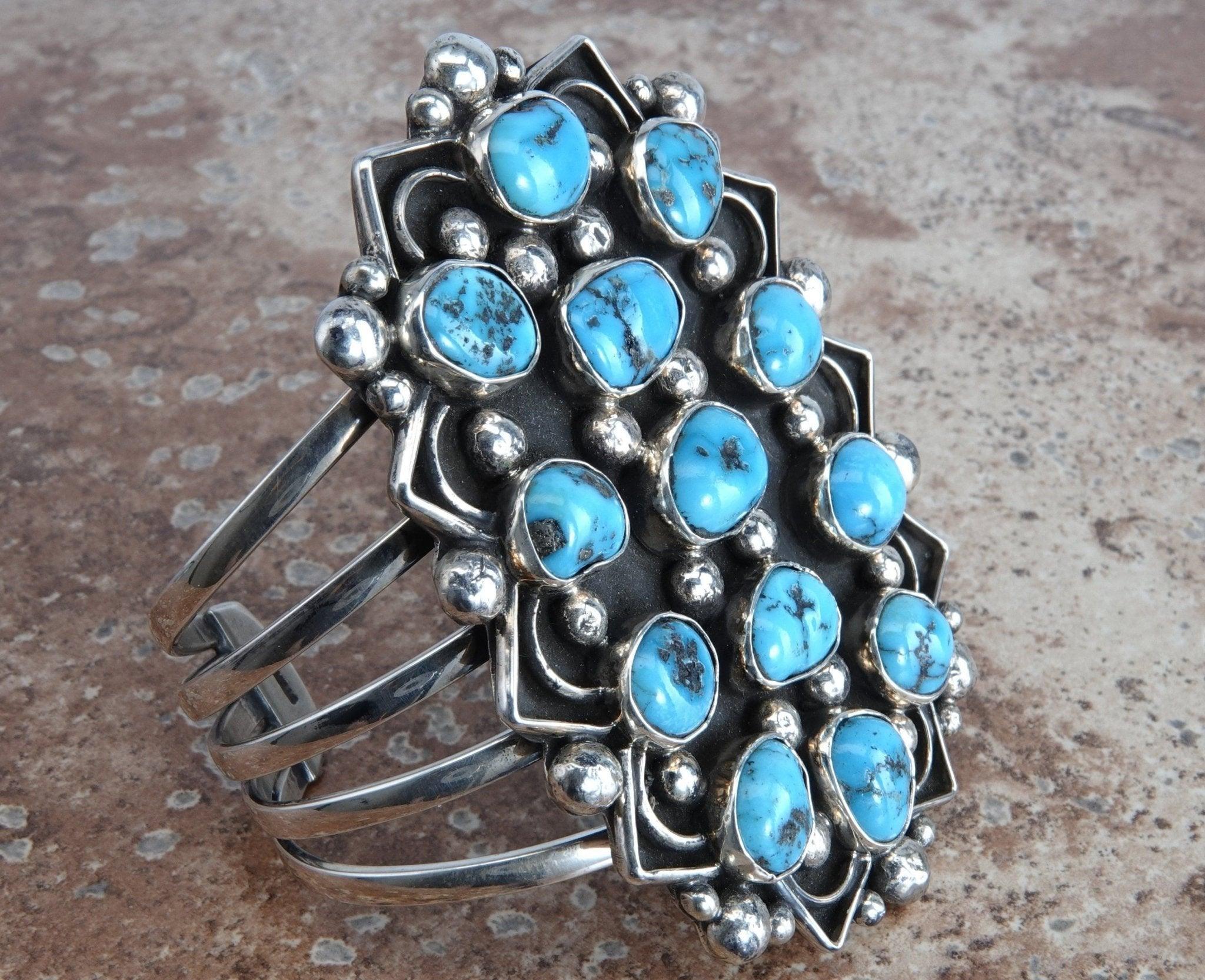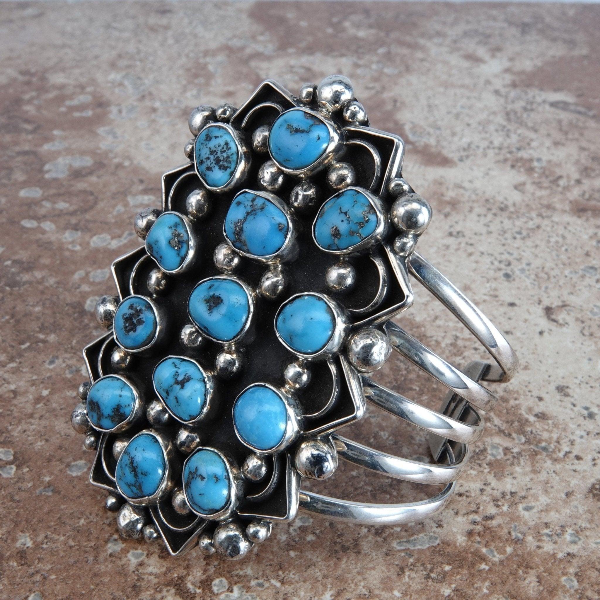 Measuring 3.25 inches long this bracelet has Bright Blue Morenci Turquoise stones that are randomly bezel set with Shiny Sterling beads on a black background. The piece has a zig-zag edge to further enhance the look and a 5 way split band. Inside measures 5.25 inches plus a gap of 1.25 inches. Stamped Sterling and Signed by the artist Chimney Butte. Weighs 104.2 Grams. Chimney Butte, a famous Native American artist originally from Arizona, who now lives in New Mexico. He was introduced to pottery, carving and jewelry making as he was growing up in Arizona, and that is where the seed of self expression was first planted. Chimney Butte uses his art as a his own personal method of self expression, inspired by the things in his past and the love he feels for his family.