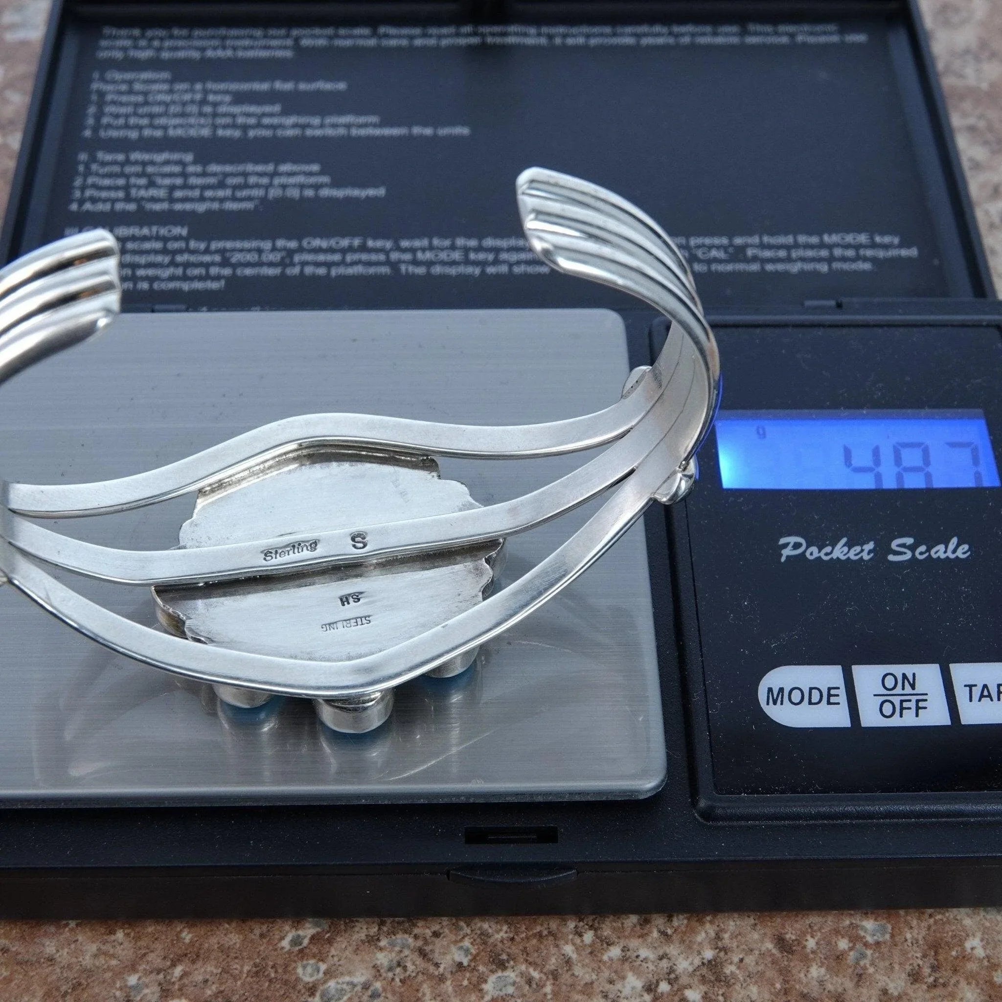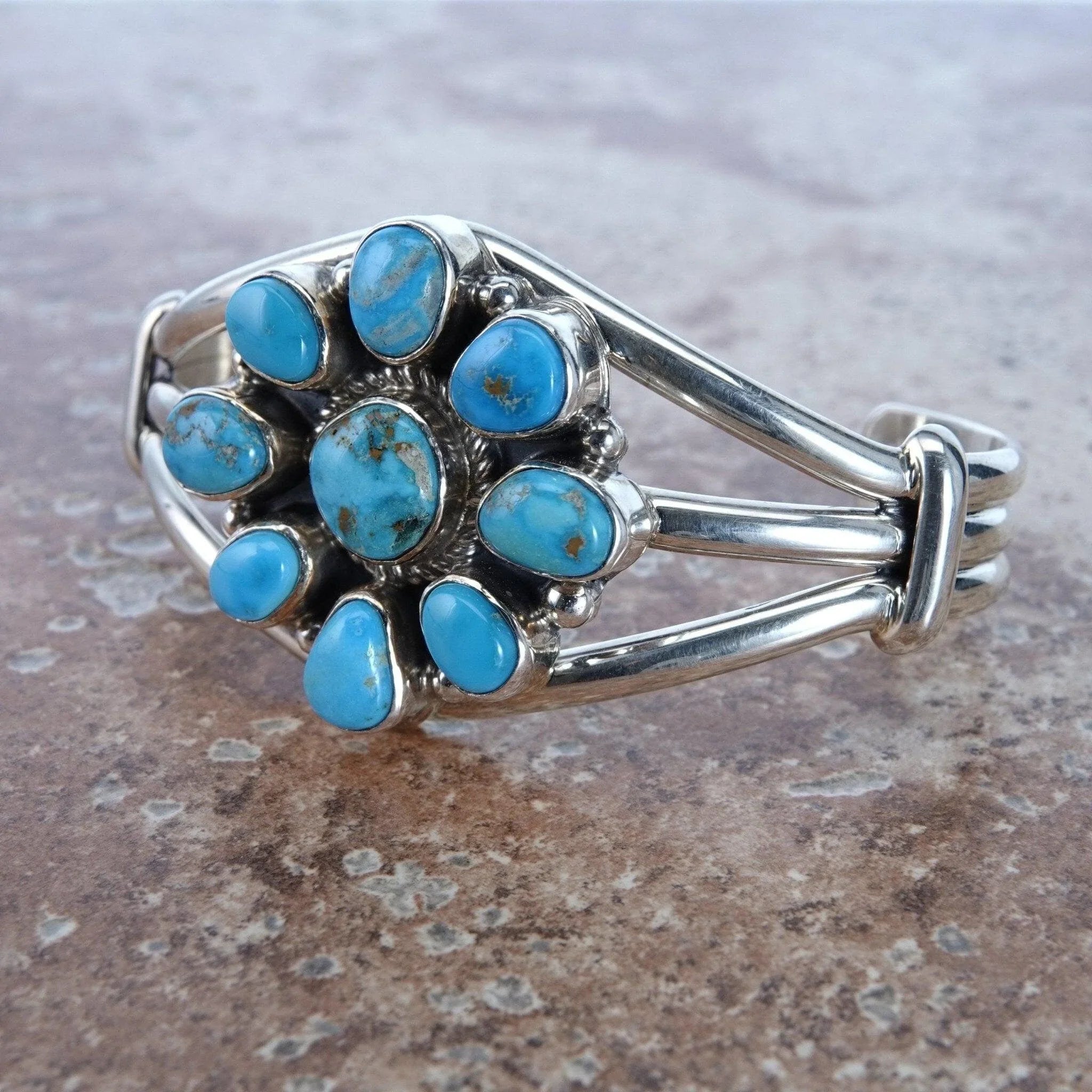 Measures 1.5 inches wide this piece has the Vibrant blue Golden Hills Turquoise<br>for a center that is done in a flower design. The bracelet has 9 Natural<br>Turquoise pieces accented with sterling rain drop beads. Inside measures 5.25<br>inches plus a gap of 1.25 inches. Stamped Sterling and Hallmarked "SH". Weighs<br>48.7 Grams. Native American, Navajo, Southwestern Indian Jewelry.