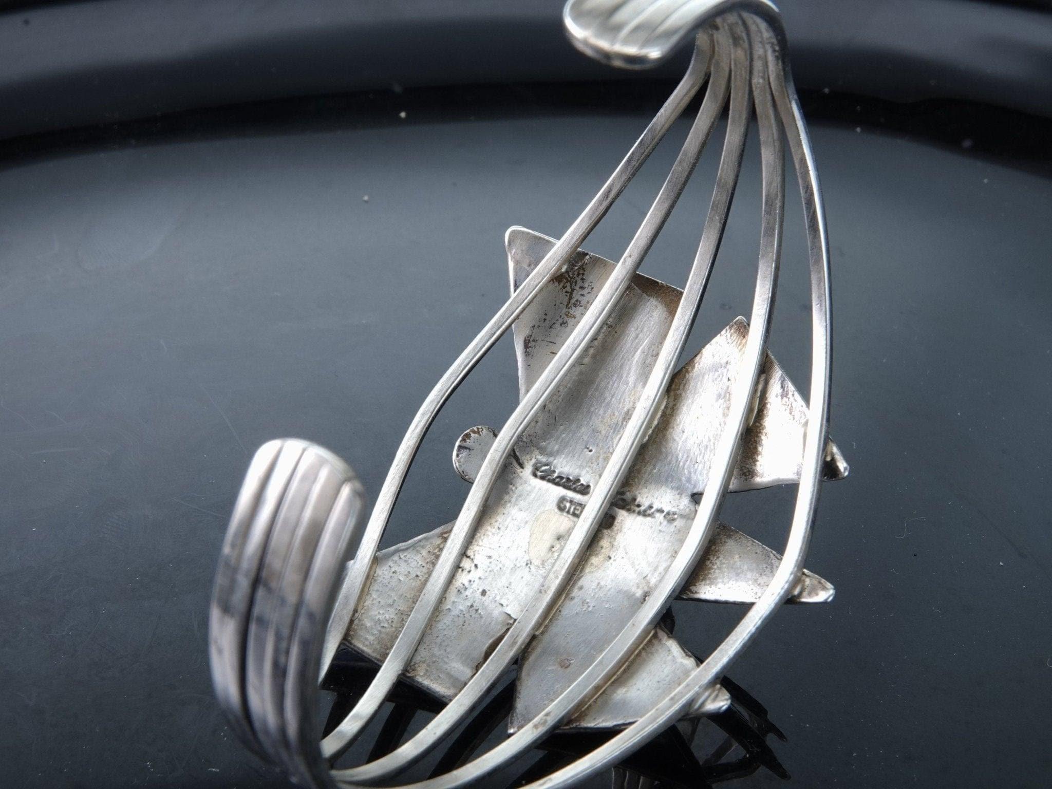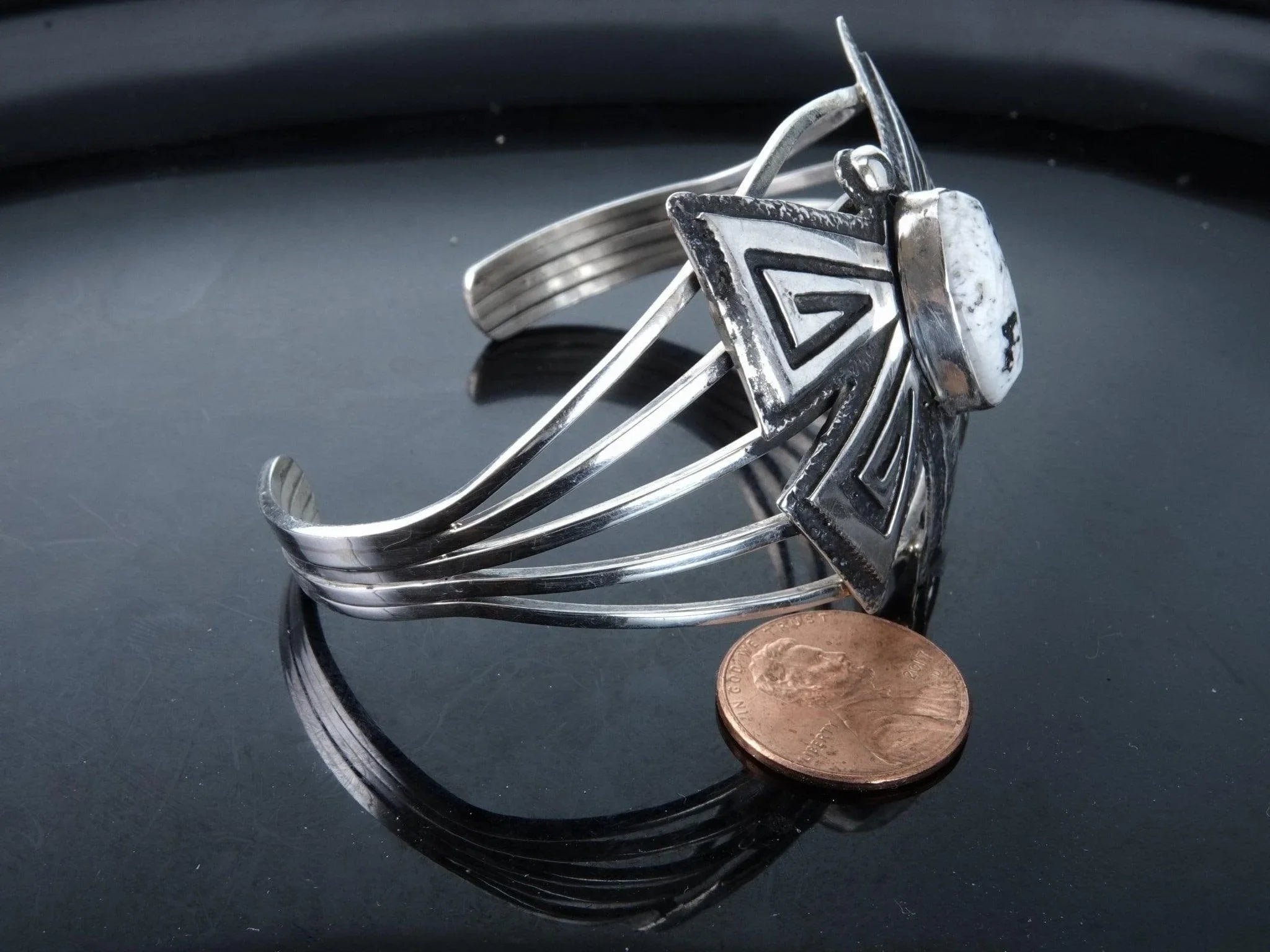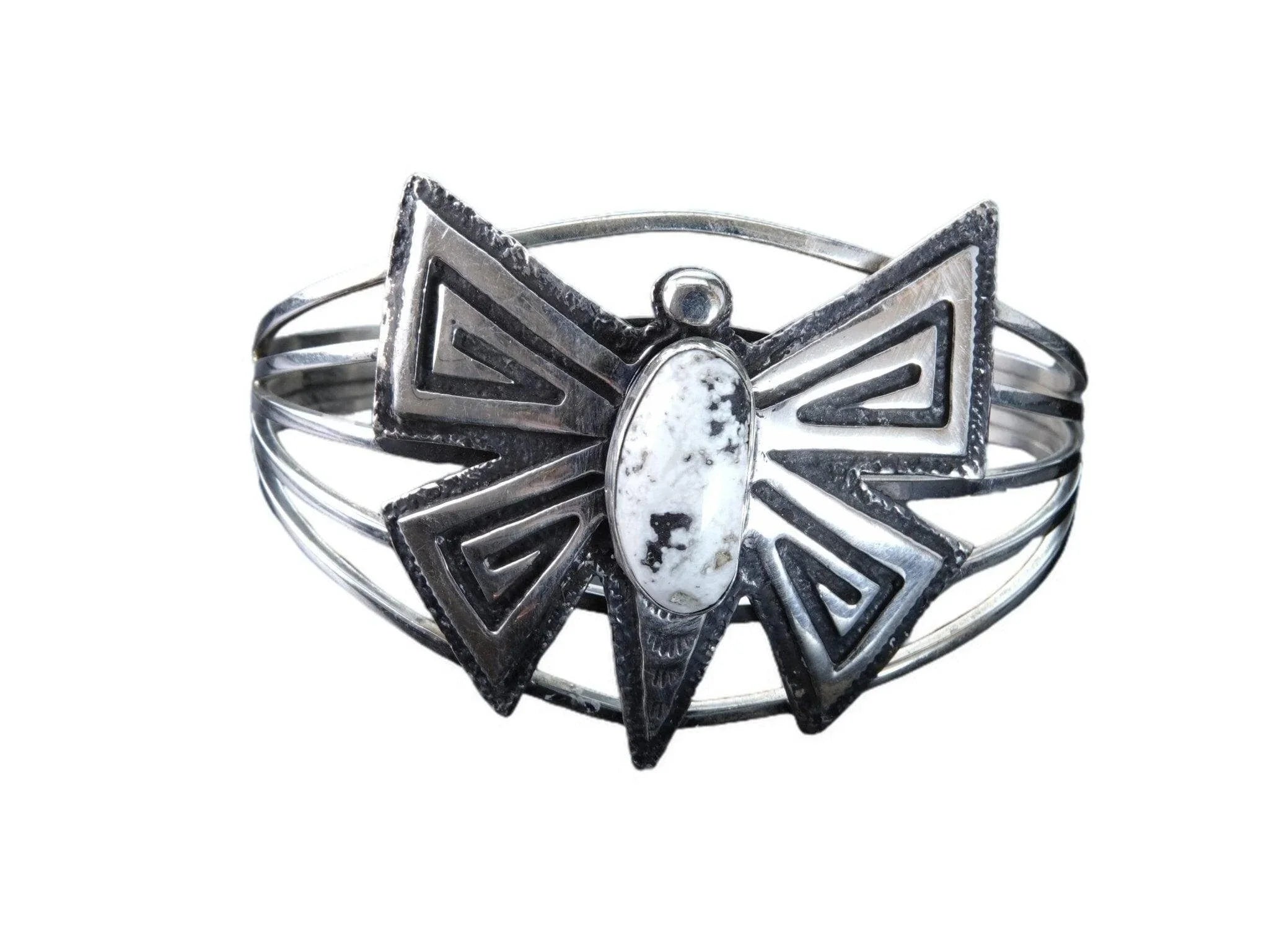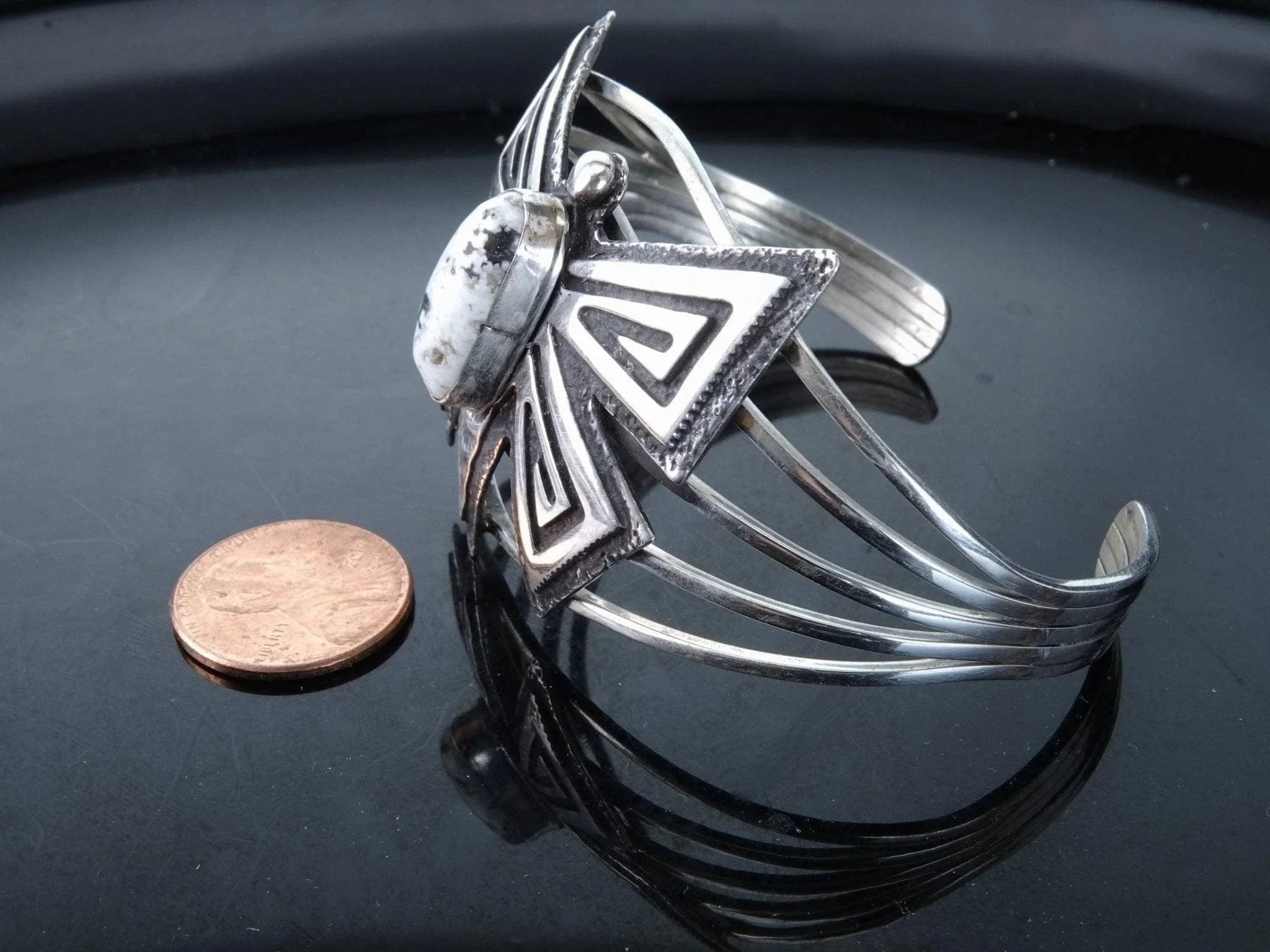 Charles Johnson White Buffalo Overlay Butterfly Bracelet. Weight:34.5 Grams, |<br>Dimensions: Bracelet: 5.75" inner, 1.25" gap, 7" total, 1.5" face width. No<br>issues.Charles was taught silversmithing from his parents at about the age of<br>15, and continued to learn on his own during the summers. His parents are<br>lifetime silversmith’s with his mother’s family having 5 generations, and his<br>father’s family with 2 generations. Charles has worked full-time as a<br>silversmith since the age of 20. He first started inlaying at the age of 13 for<br>a few years while learning both.Starting with traditional Navajo jewelry,<br>Charles then went into Navajo contemporary jewelry, then onto the Western style<br>with swirl design cutouts. The majority of his jewelry are cutout overlay on<br>bracelets, and buckles with Petroglyph designs (Anasazi drawings). He also<br>enjoys bracelet overlay with Western style and swirl design. Charles’ clans are<br>Ashii (Salt People) and Todich’ii’nii (Bitter Water Clan).