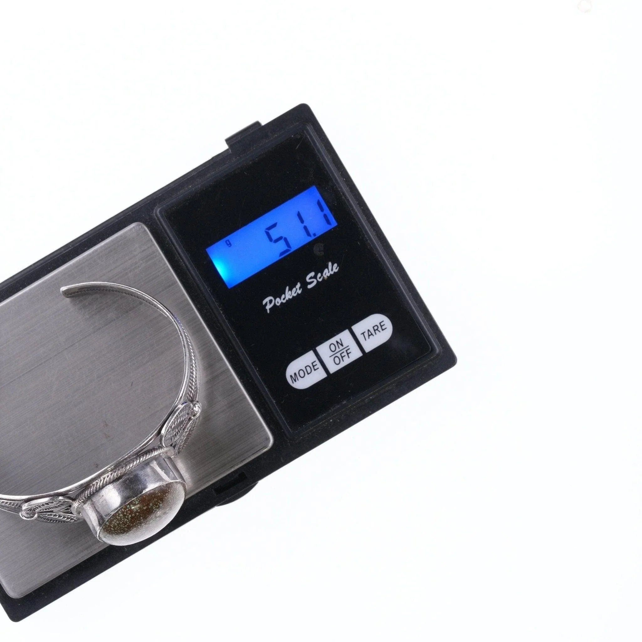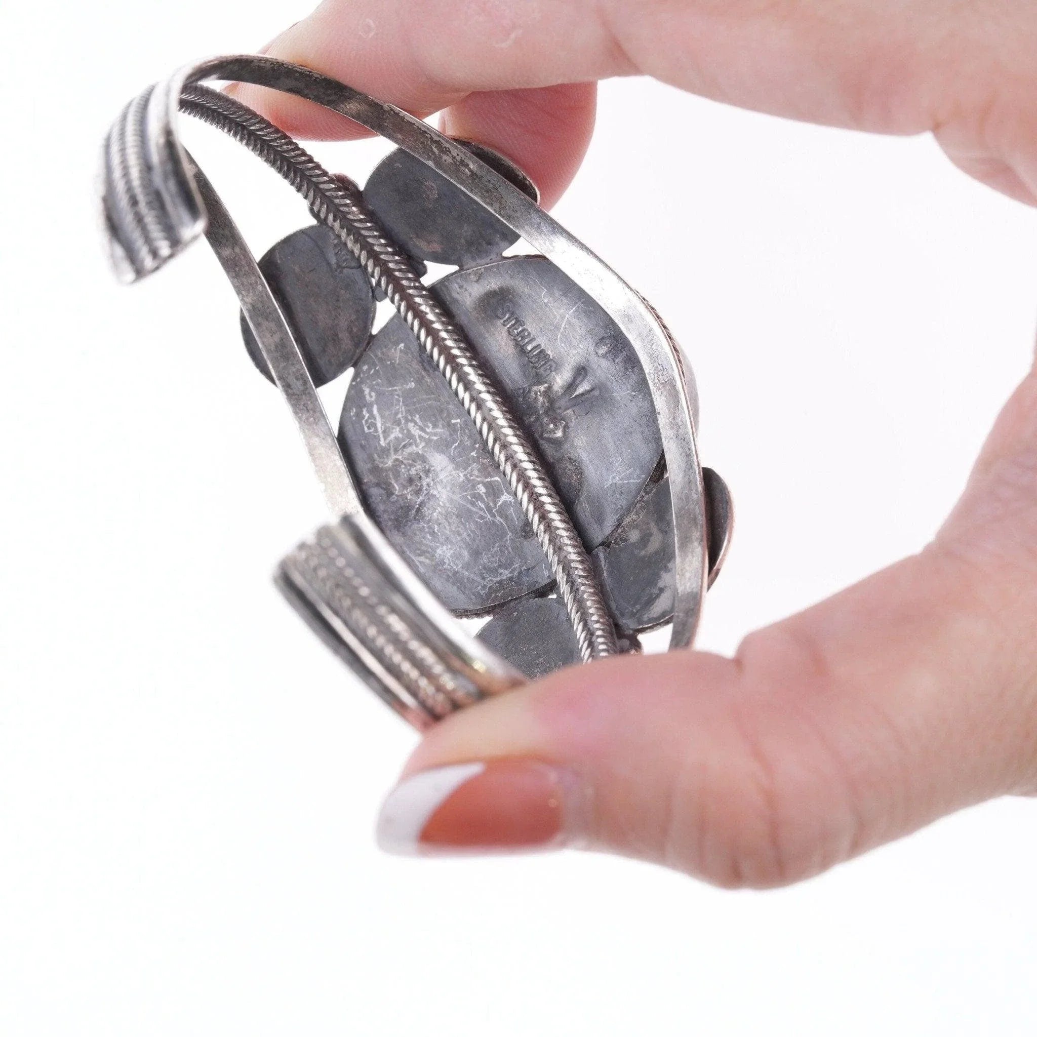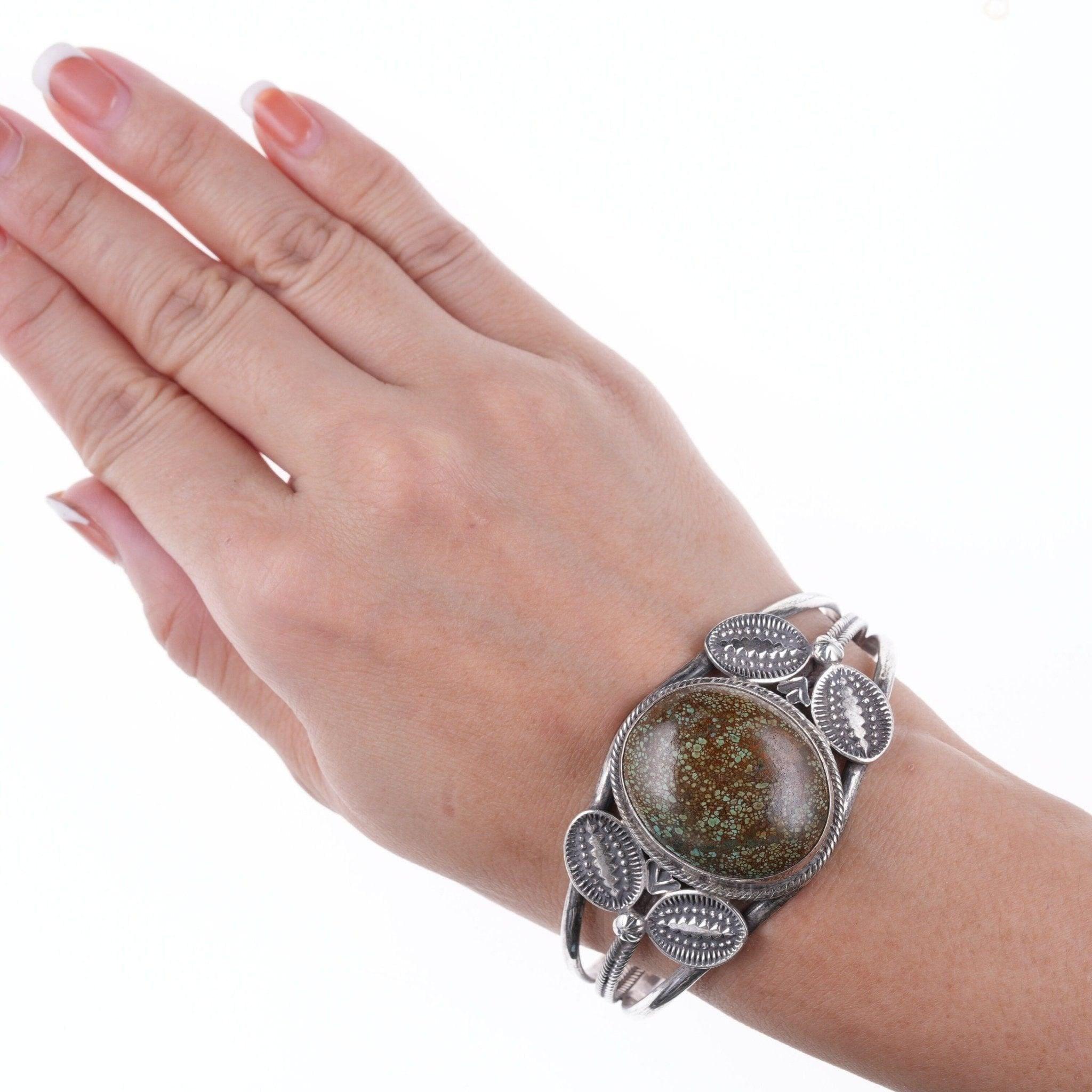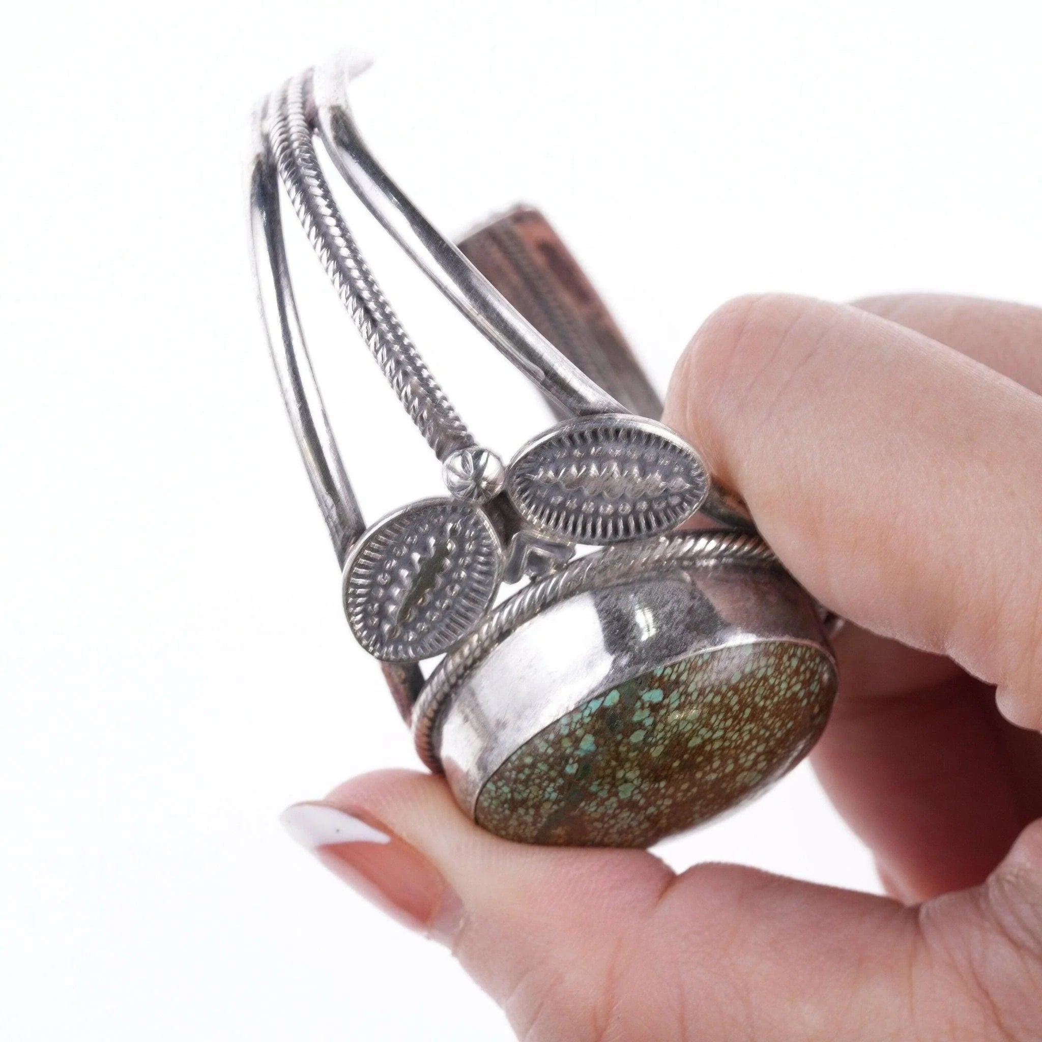 7" Vintage Heavy stamped silver green spiderweb turquoise bracelet. 36mm wide in<br>center.<br><br>All precious metals are tested and guaranteed, any Native American jewelry<br>referred to as Silver or Sterling is guaranteed to be a minimum of 90% (coin)<br>silver and possibly higher content. Anything marked is guaranteed to be what<br>it's marked, most bracelets are photographed on a 6" wrist (non hairy), rings<br>photographed on the appropriate sized finger when possible. With bracelets if<br>the measurement is not given in the description then inside circumference is<br>shown where the metal meets the number on the the cloth tape measure.