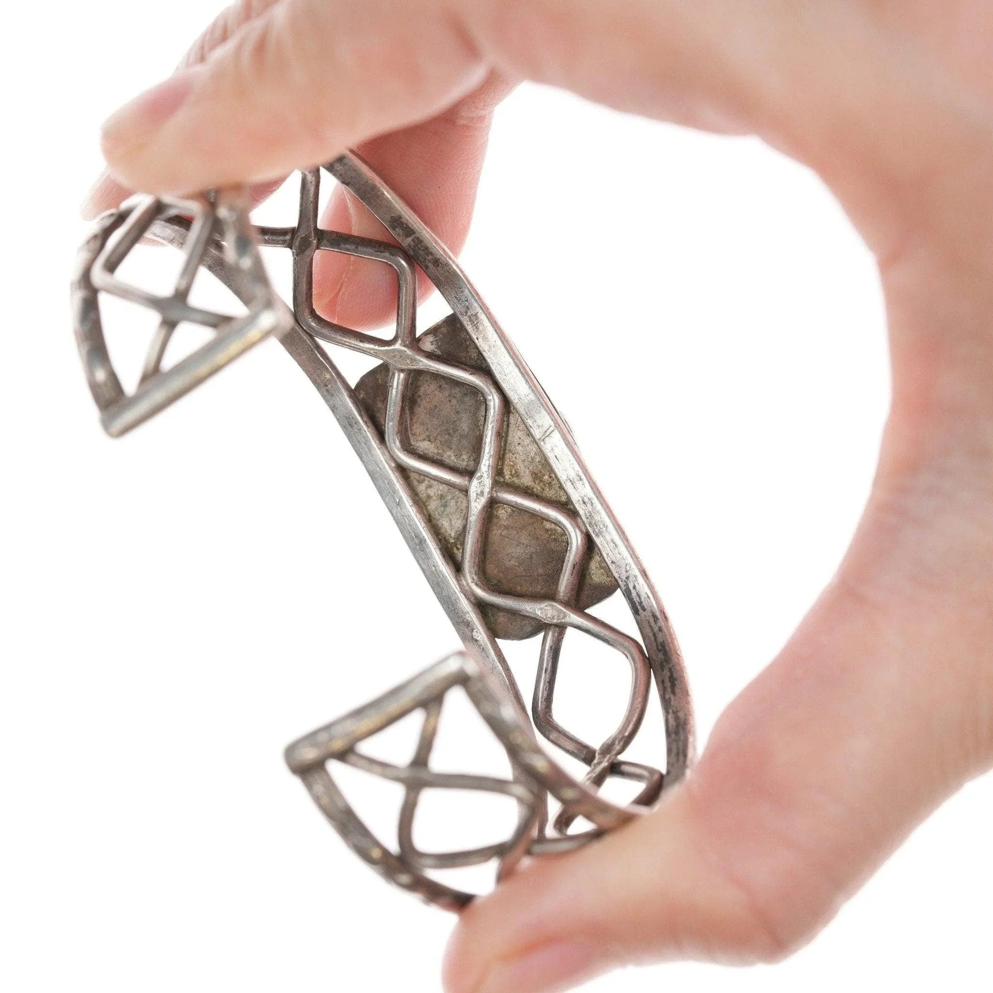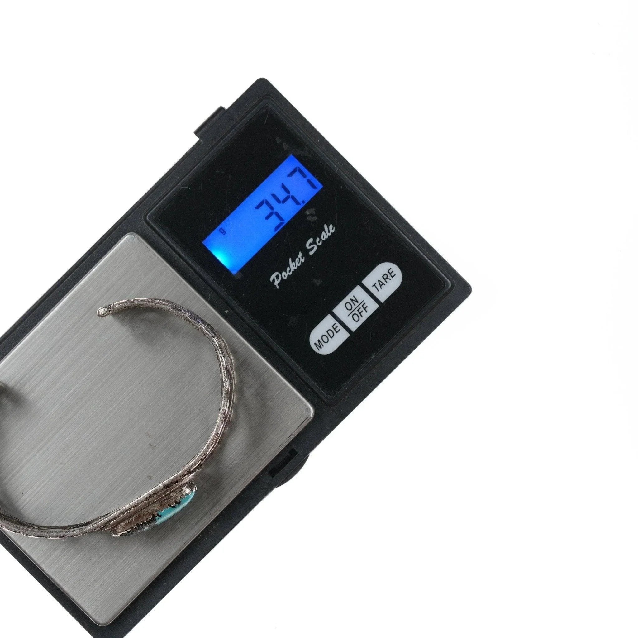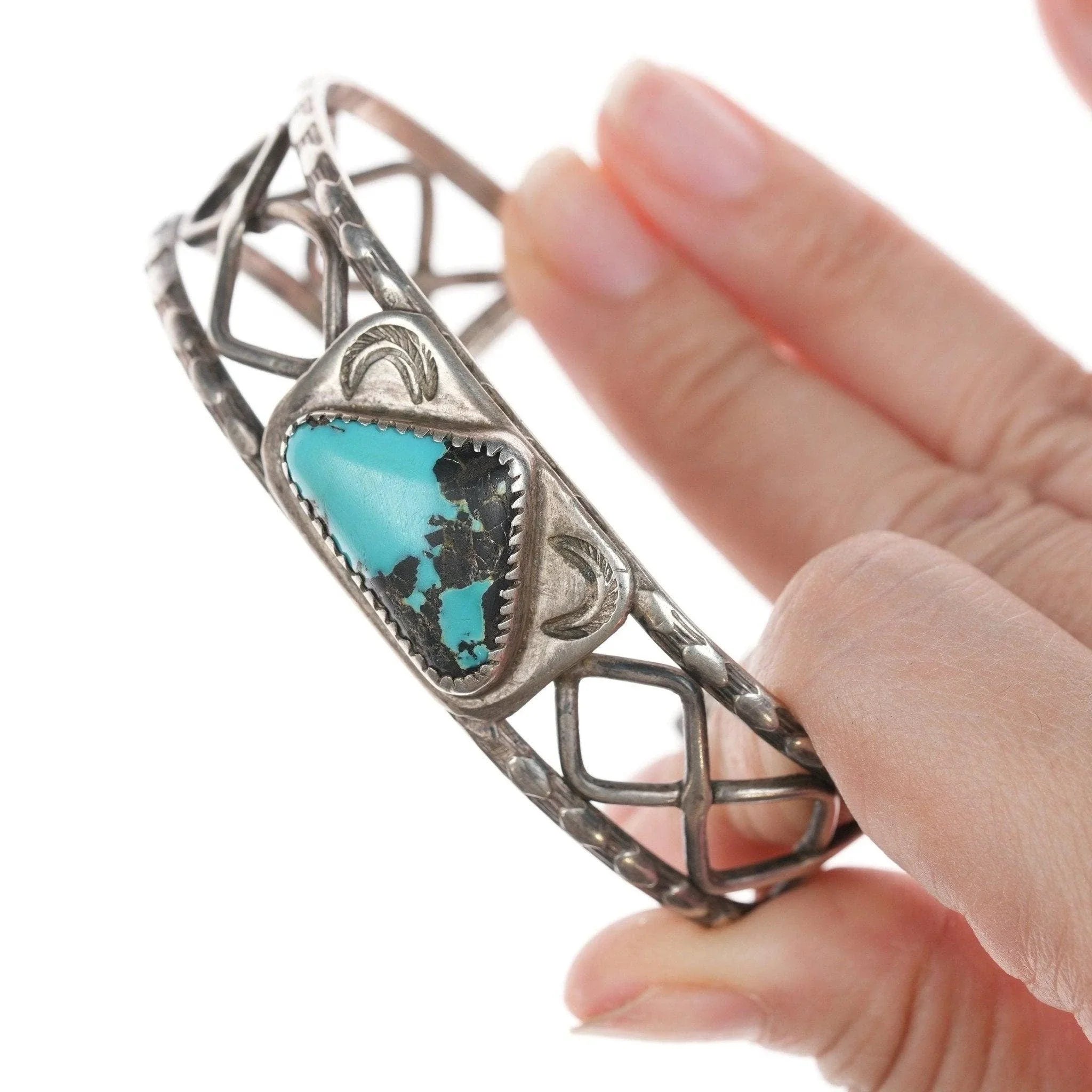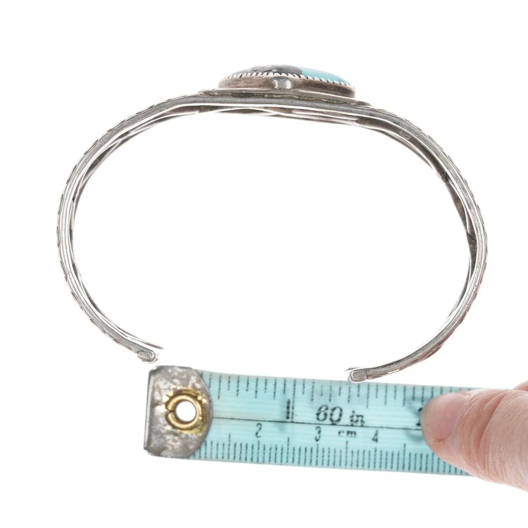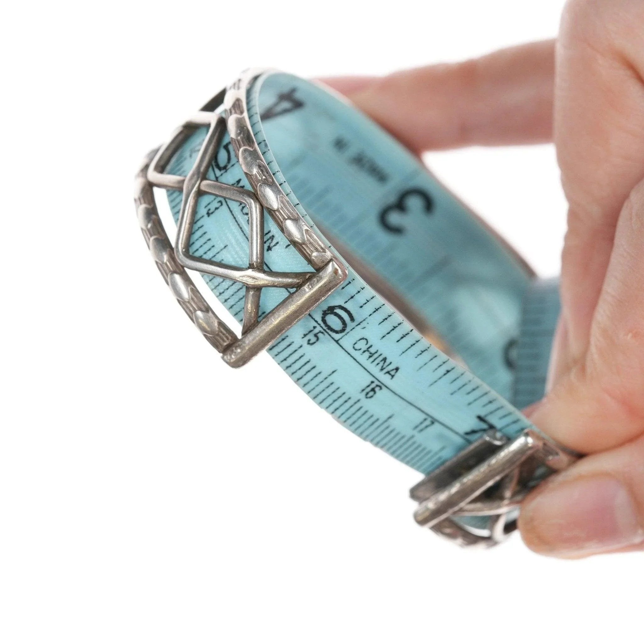 6 1/8" 40's-50's Navajo stamped silver and turquoise bracelet 37mm wide.<br><br>All precious metals are tested and guaranteed, any Native American jewelry<br>referred to as Silver or Sterling is guaranteed to be a minimum of 90% (coin)<br>silver and possibly higher content. Most cuff bracelets are shown photographed<br>on a 6" woman's wrist and will include a photo showing the inside circumference<br>where the metal tip meets the number on the tape measure.