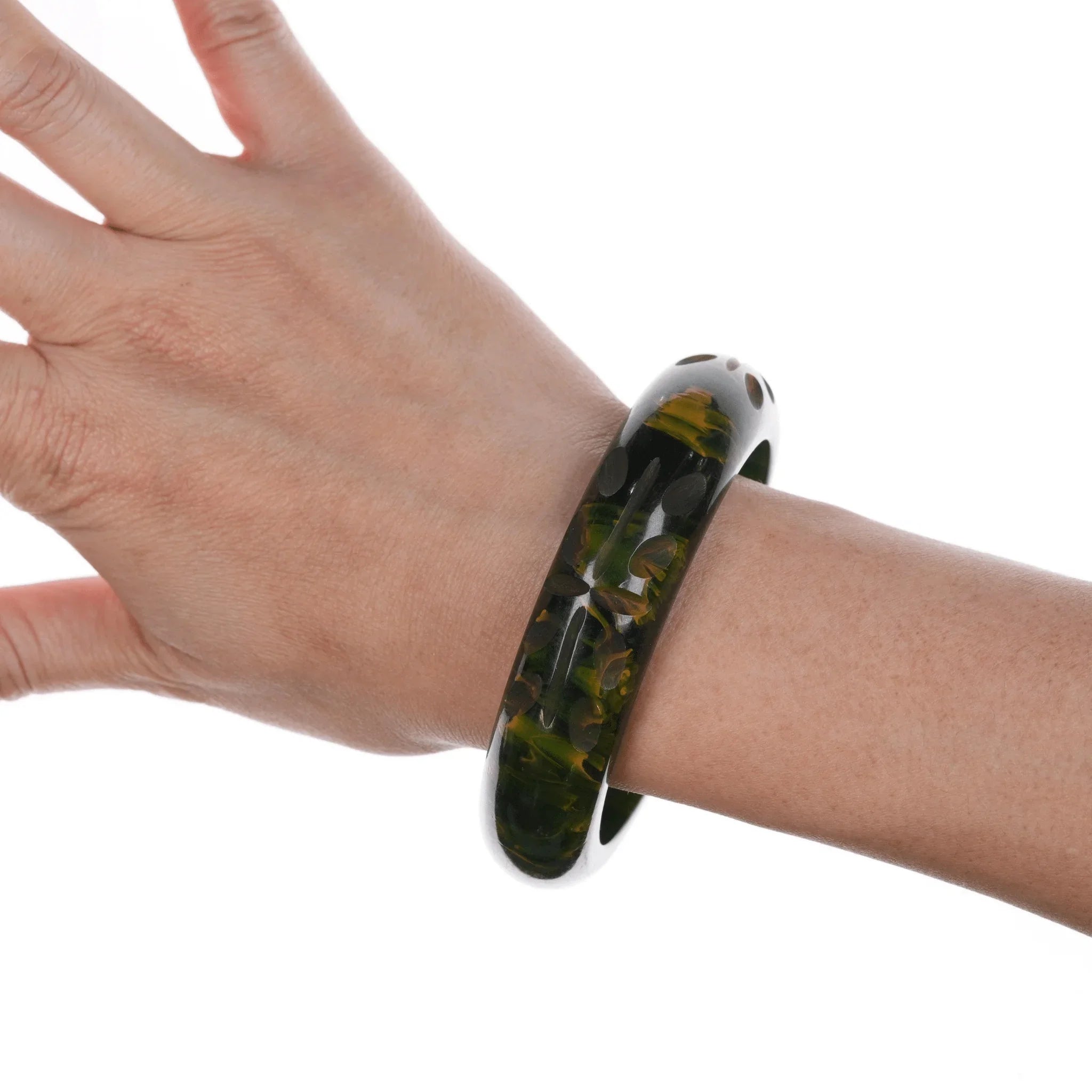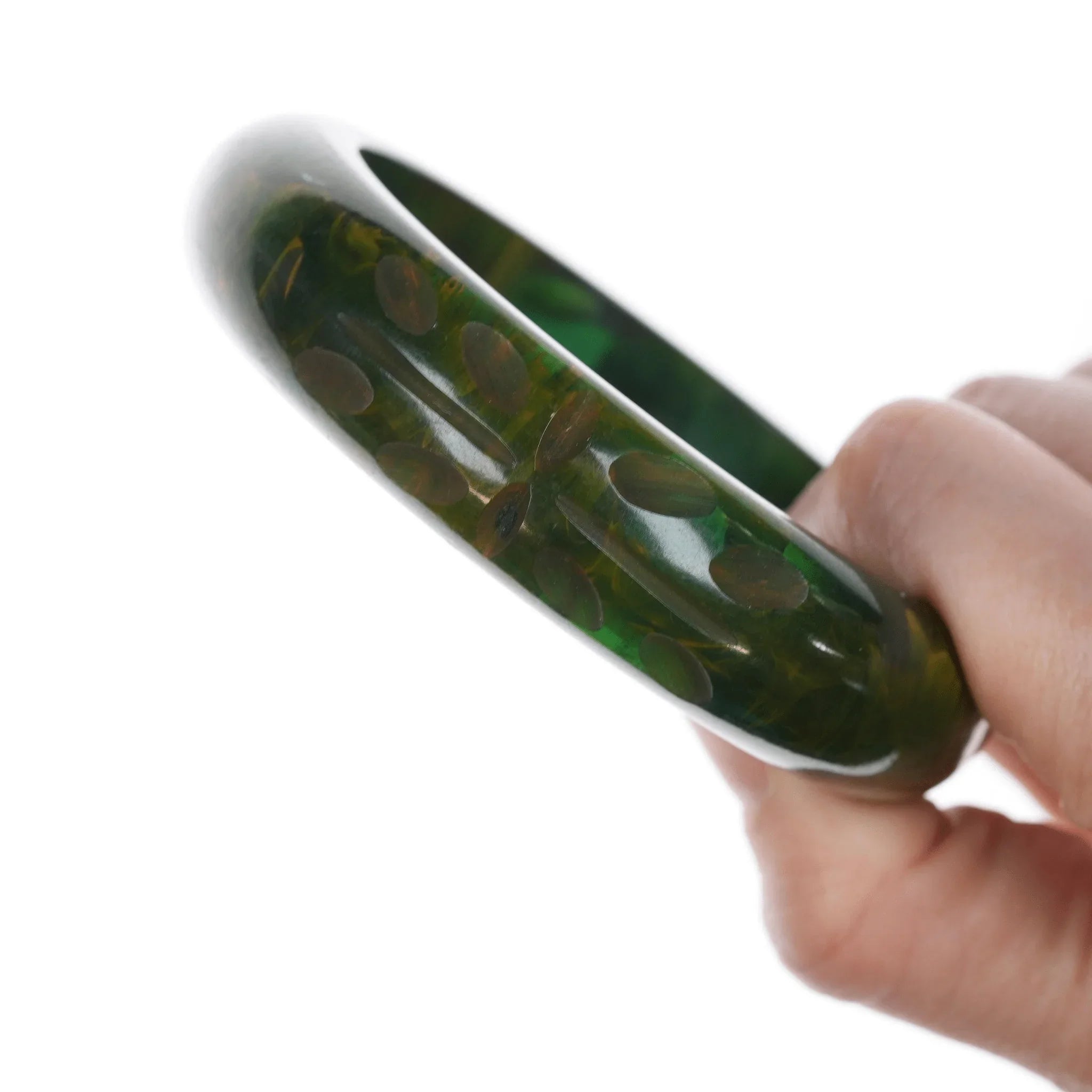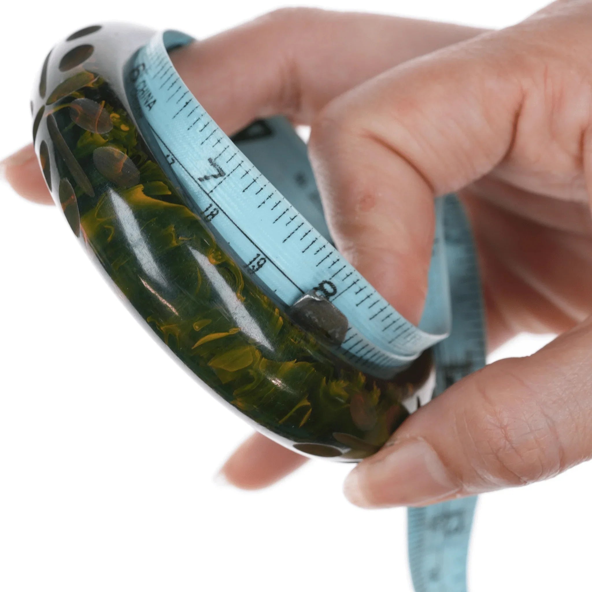 Gelang Bakelite Marlbelized Hijau Berukir tahun 8" c1940. Sedikit lebih ringan dari yang digambarkan dalam gambar, menyenangkan tanpa masalah. Barang asli yang terawat dengan sangat baik dari koleksi lama yang dikumpulkan pada kuartal terakhir abad ke-20. Ditampilkan pada ukuran 6" pergelangan tangan wanita. Pengukuran dalam foto.