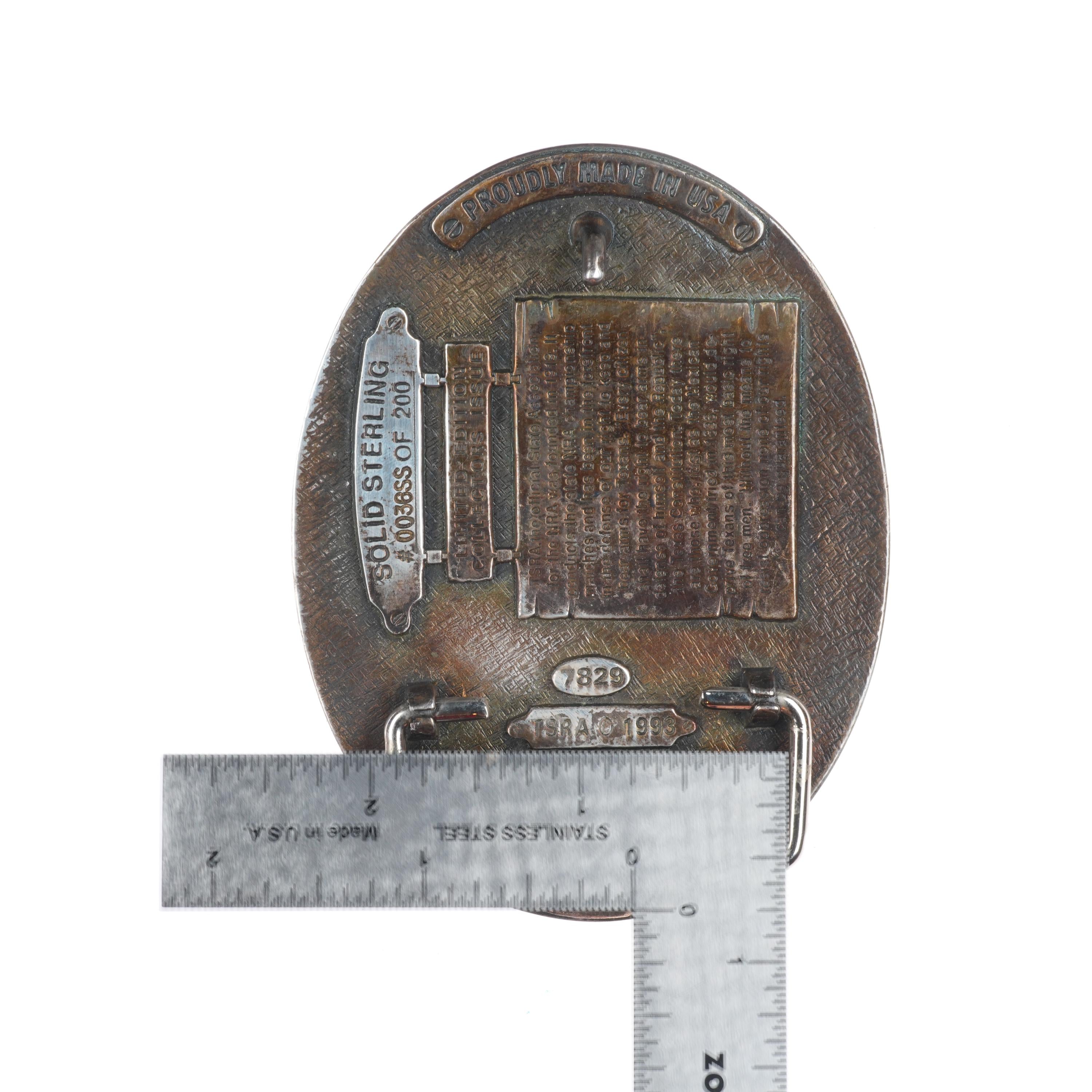 Heavy Sterling silver Texas State Rife Association belt buckle 1993. Tested and guaranteed solid sterling silver with weight and measurements in pictures with some expected wear, fully functional. Fits up to a 1.75" belt.