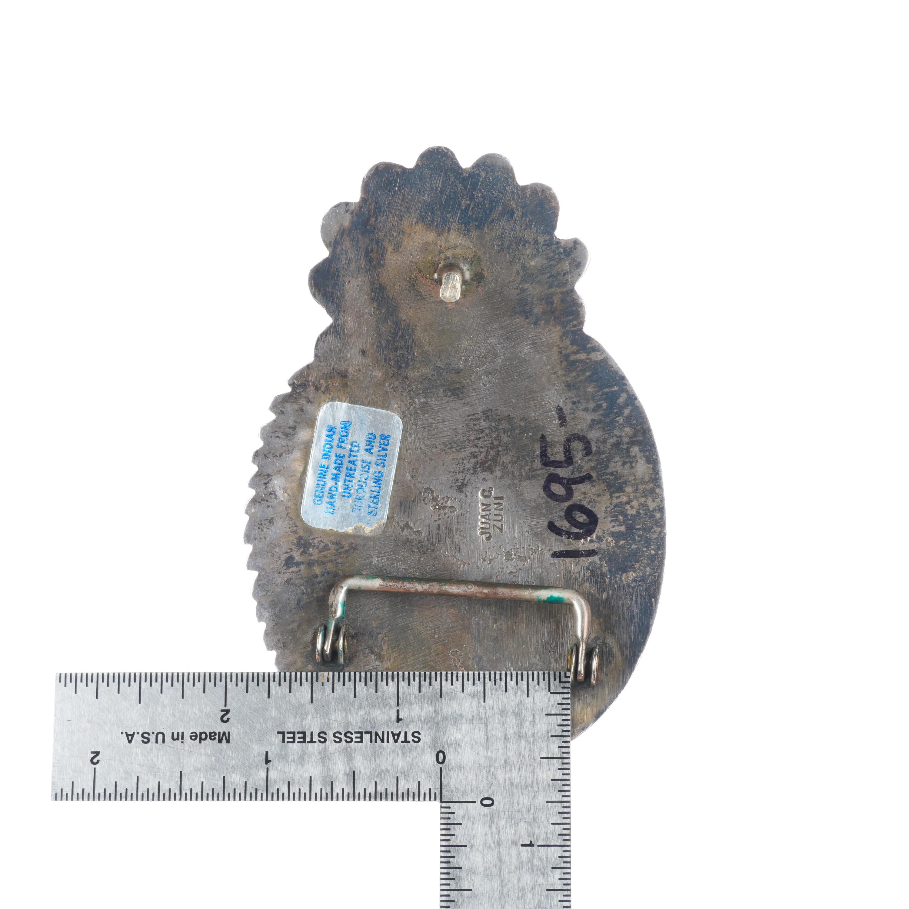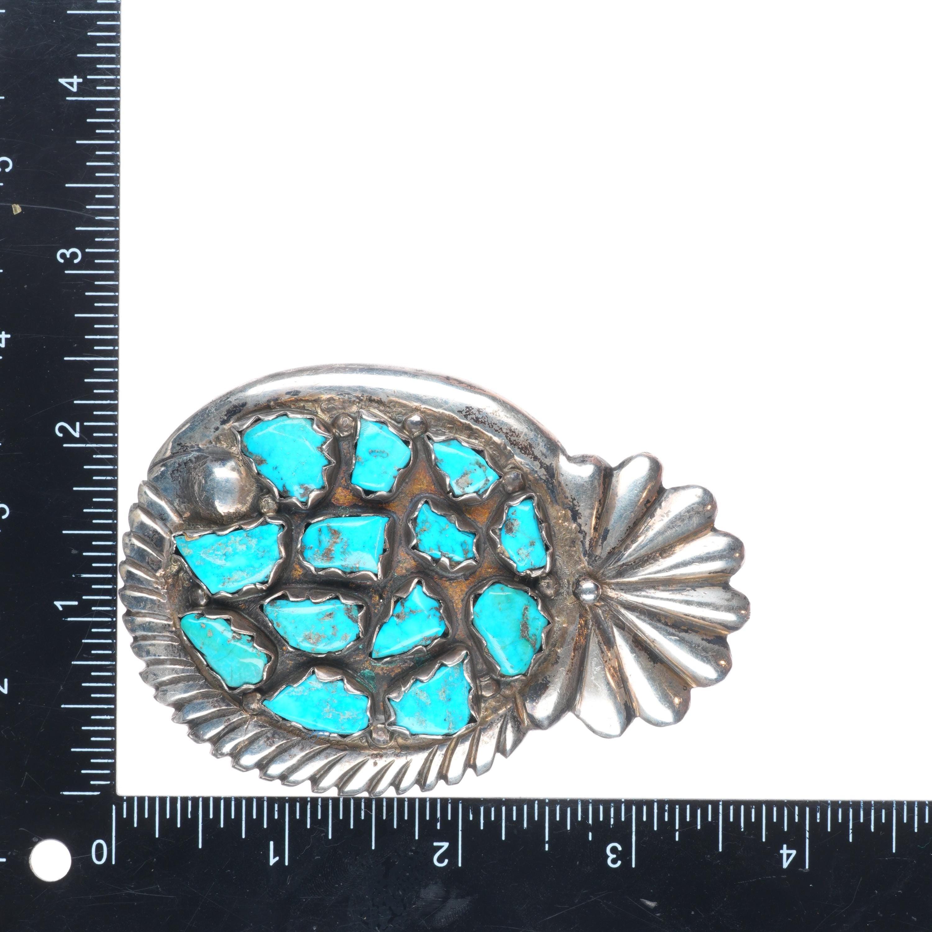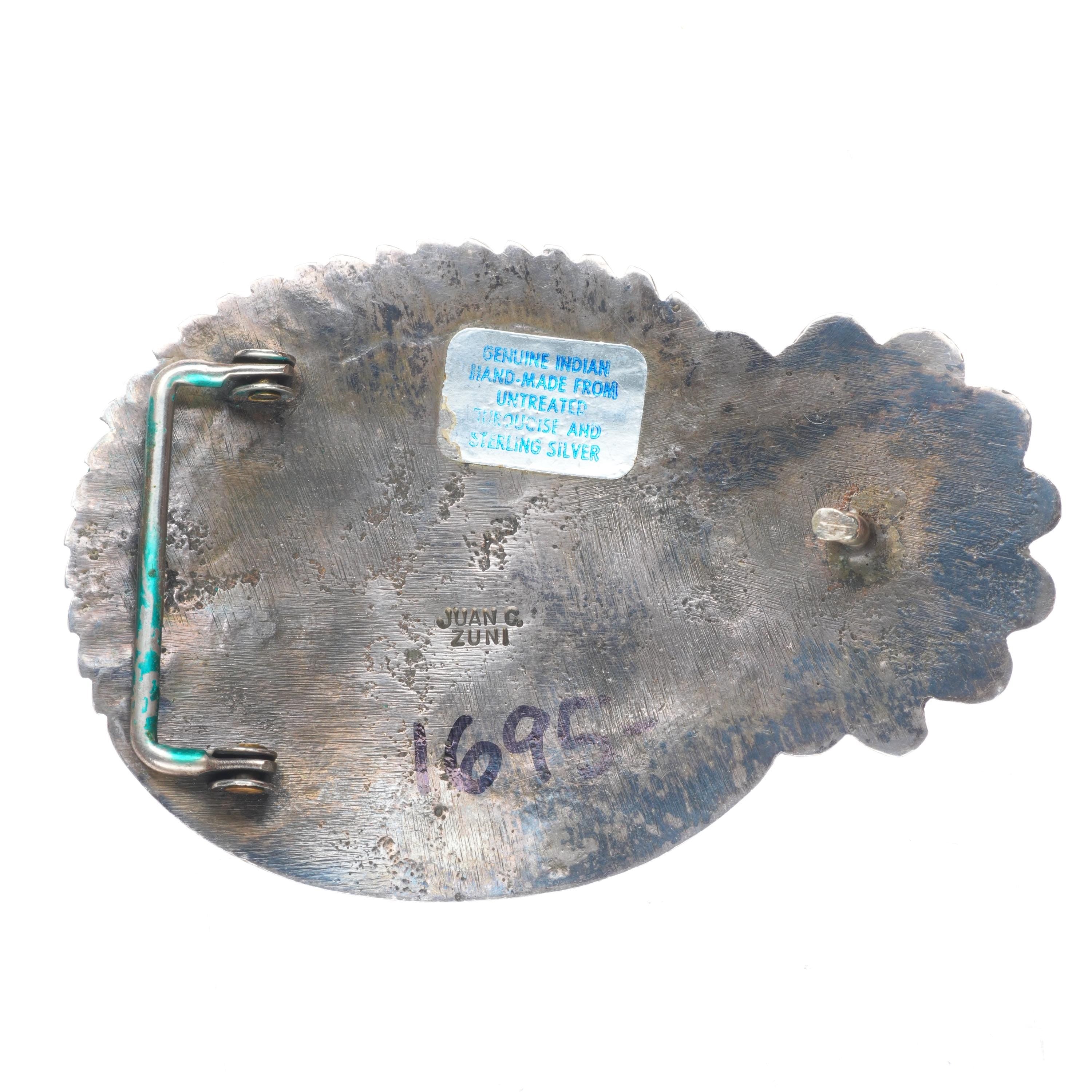 Juan Calavaza Zuni cast sterling silver turquoise nugget cluster belt buckle. Tested and guaranteed solid sterling silver weight and measurements in pictures, Circa third quarter of the 20th century. Fits a 1.25" belt. Functional with age appropriate wear.