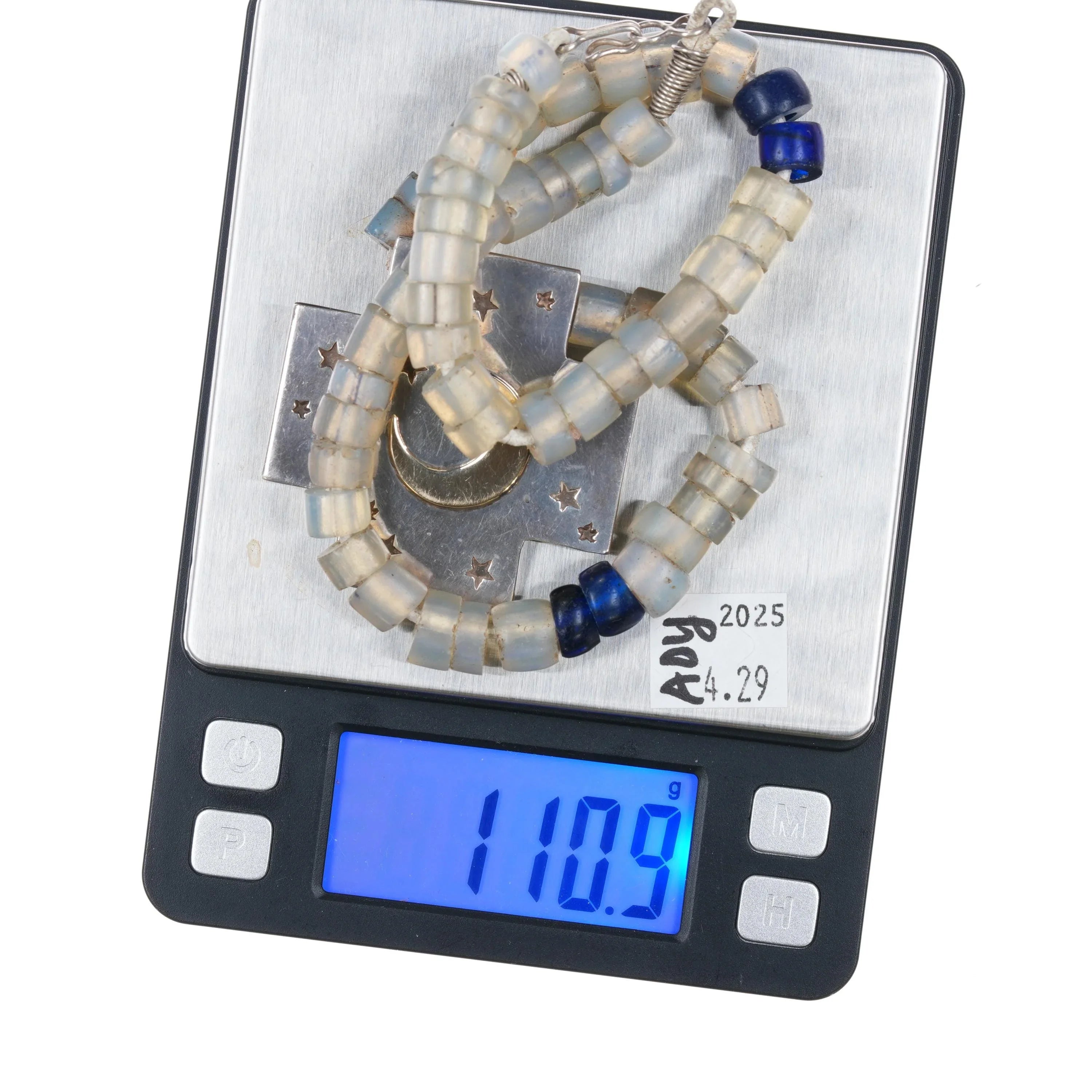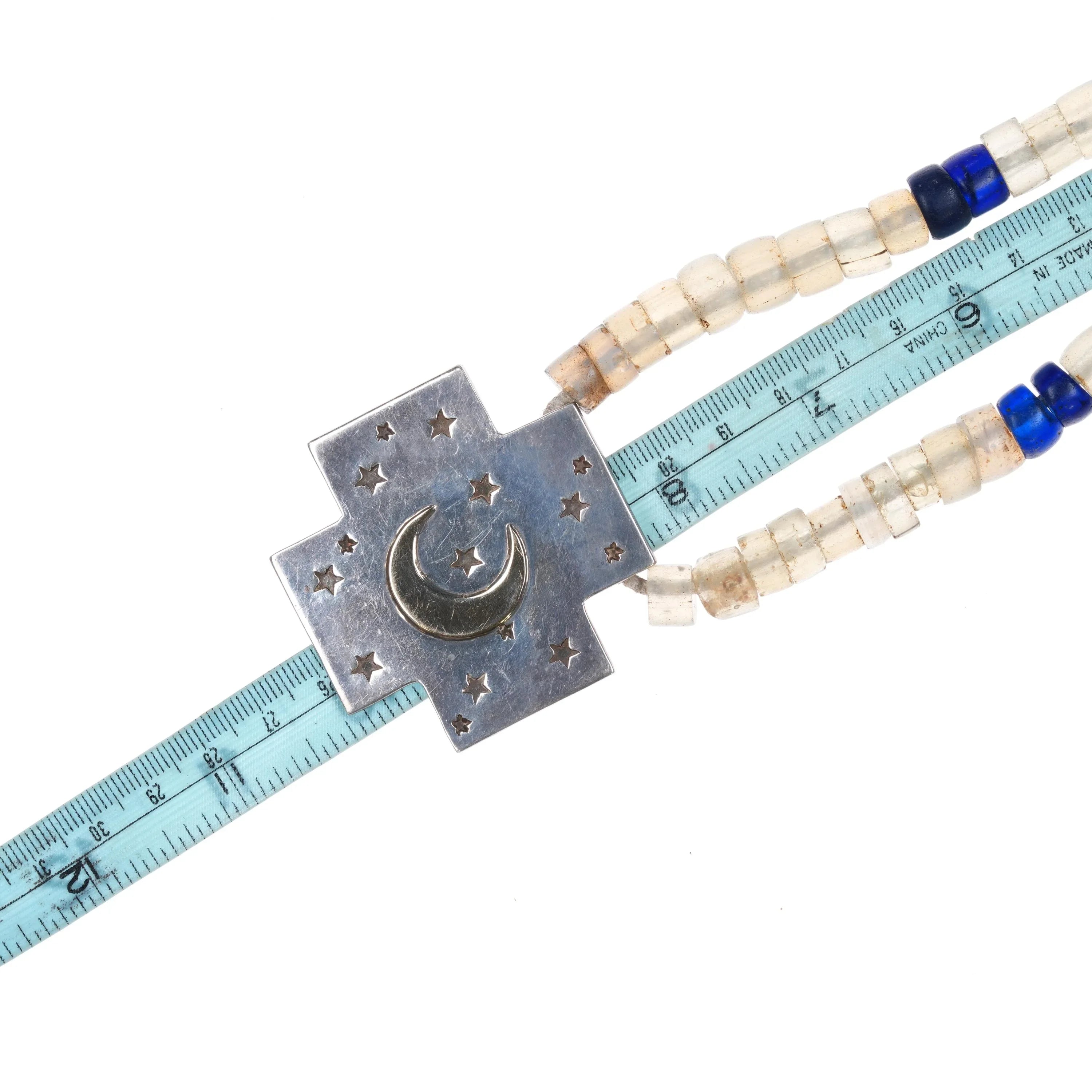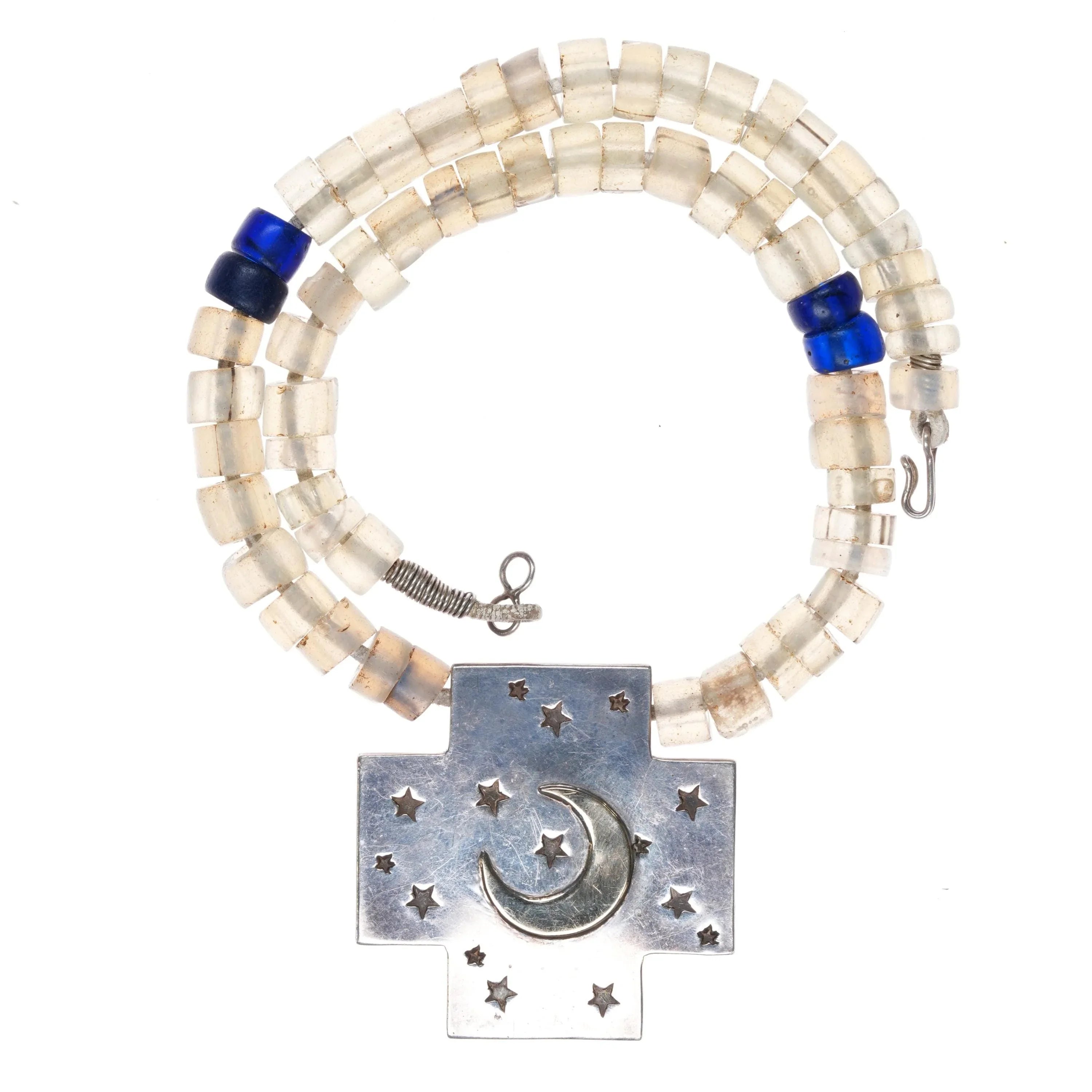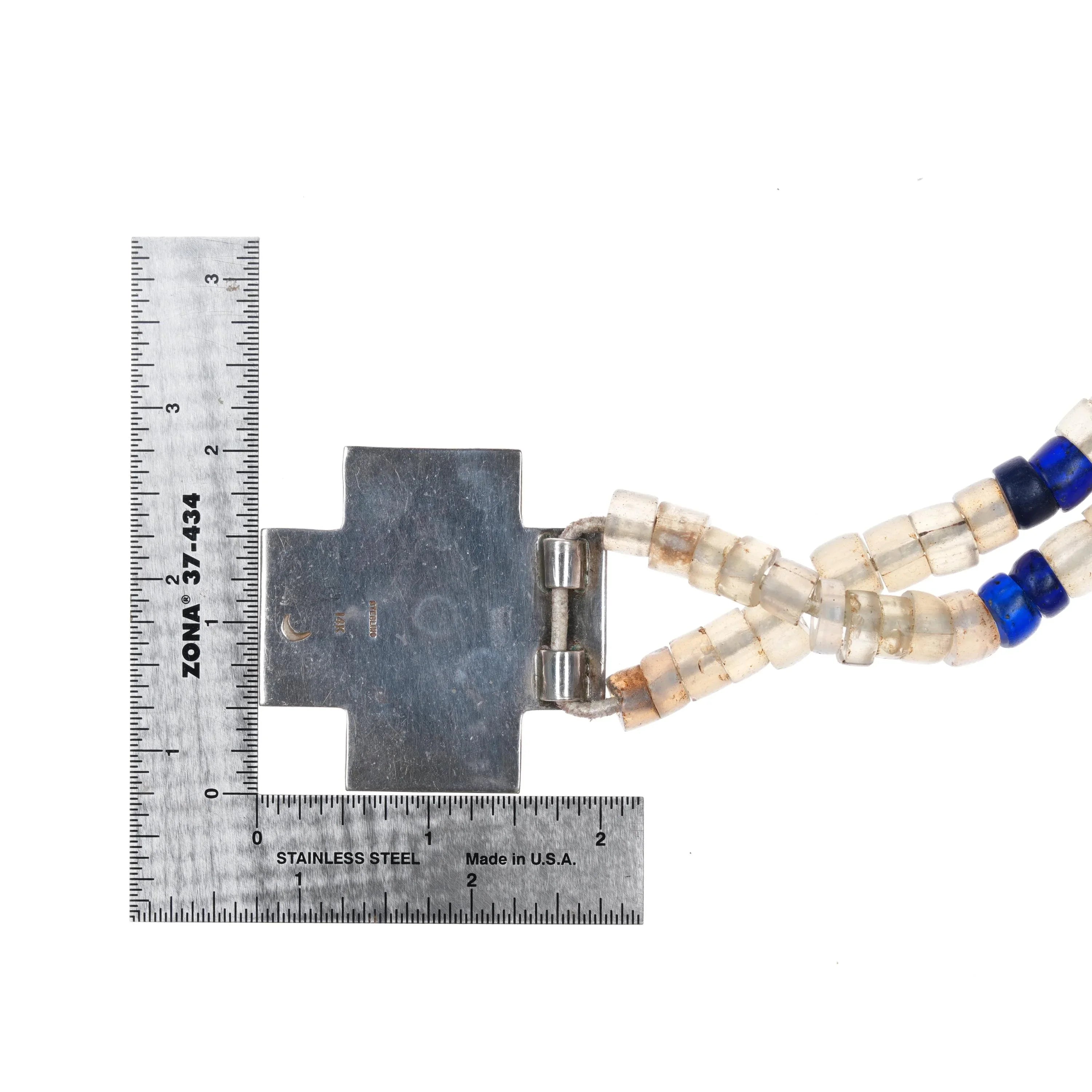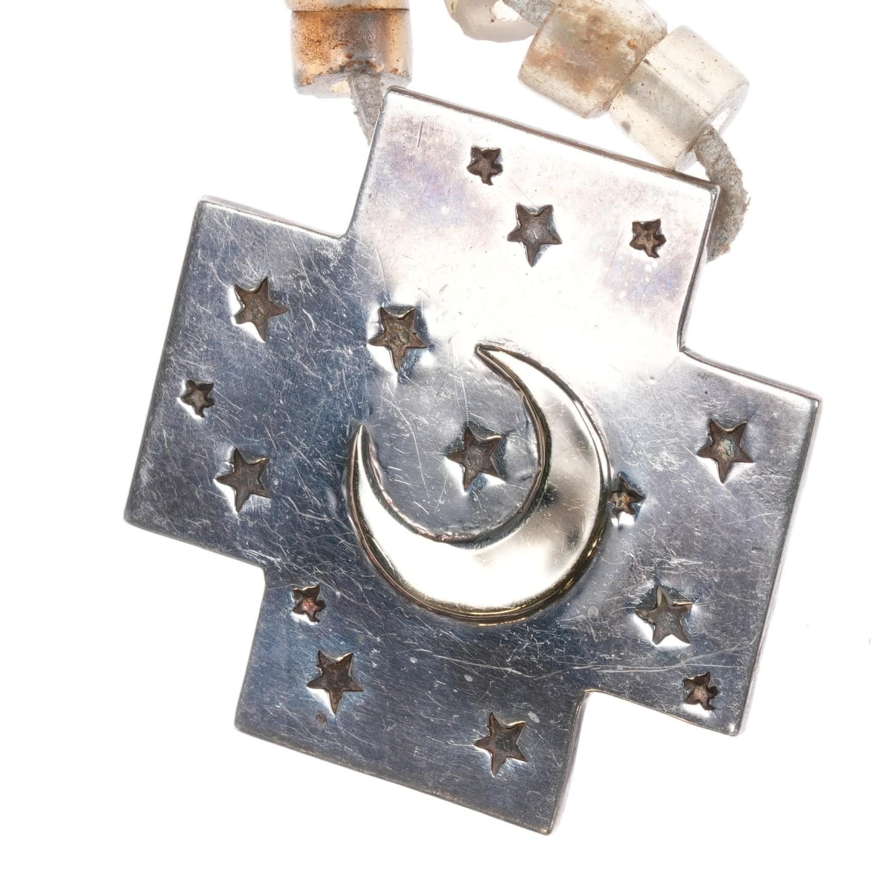 Large 90‘s Santa Fe 14k/ sterling silver cross pendant glass handmade beads Weight and measurements in pics, all solid sterling. NO issues. Unresearched by me artists signatures, incredible piece 18" long necklace. Very high quality piece from an extremely high quality collection put together in the 90‘s. I didn‘t have time to try to idenify much of it as there just is no time, but the pieces I did recognize were all from very high end mostly Santa Fe, New Mexico artists. It was all collected on trips to Santa Fe in the 90‘s.