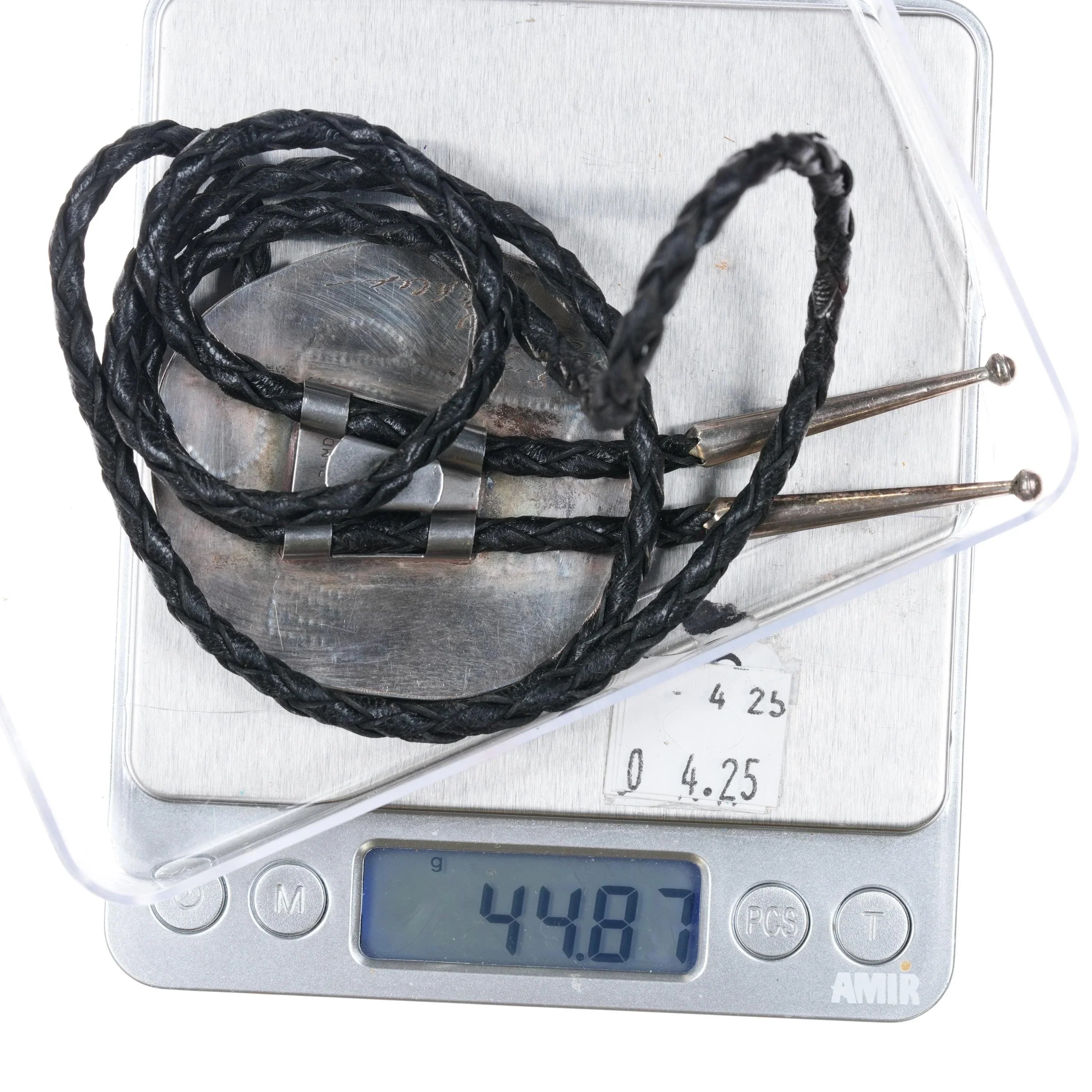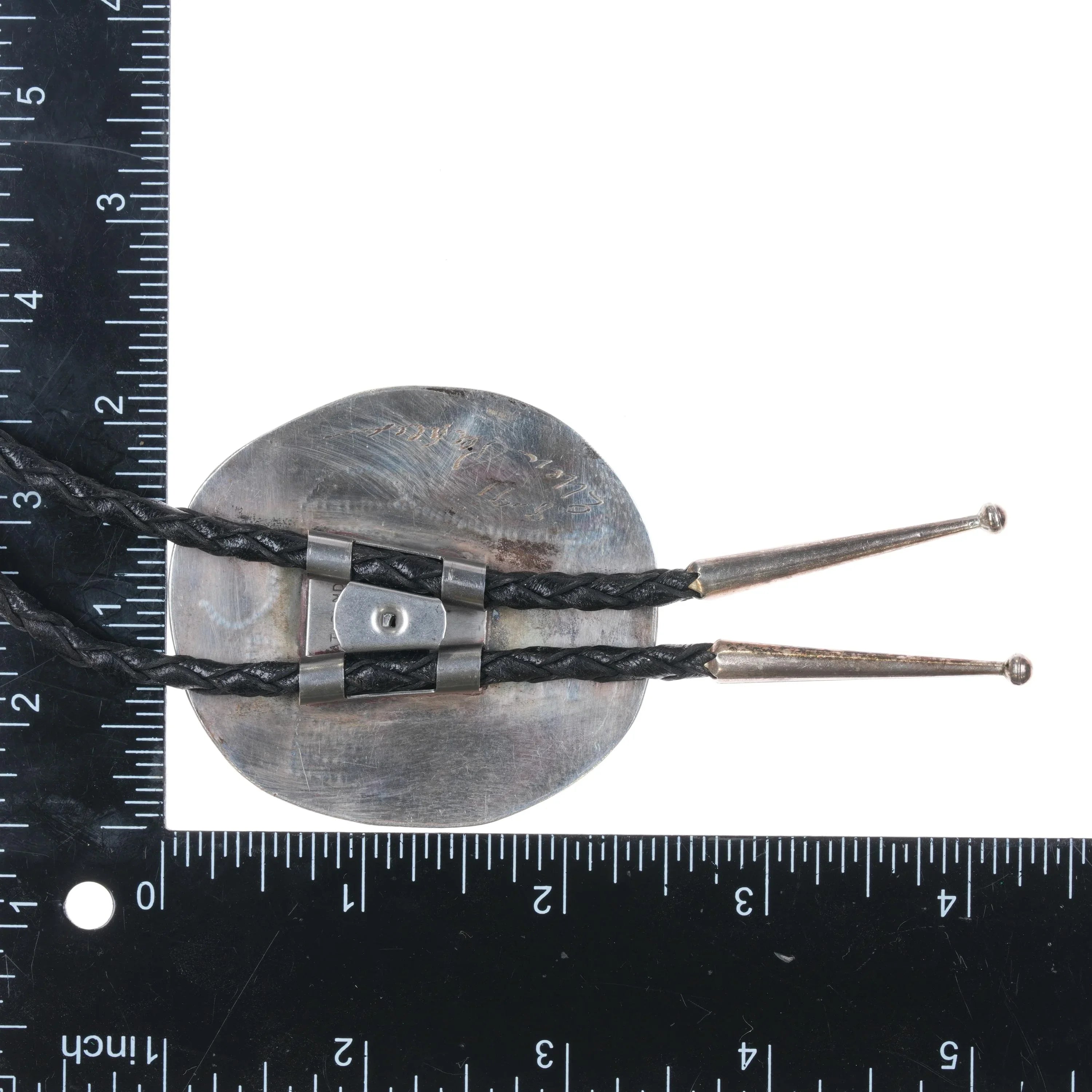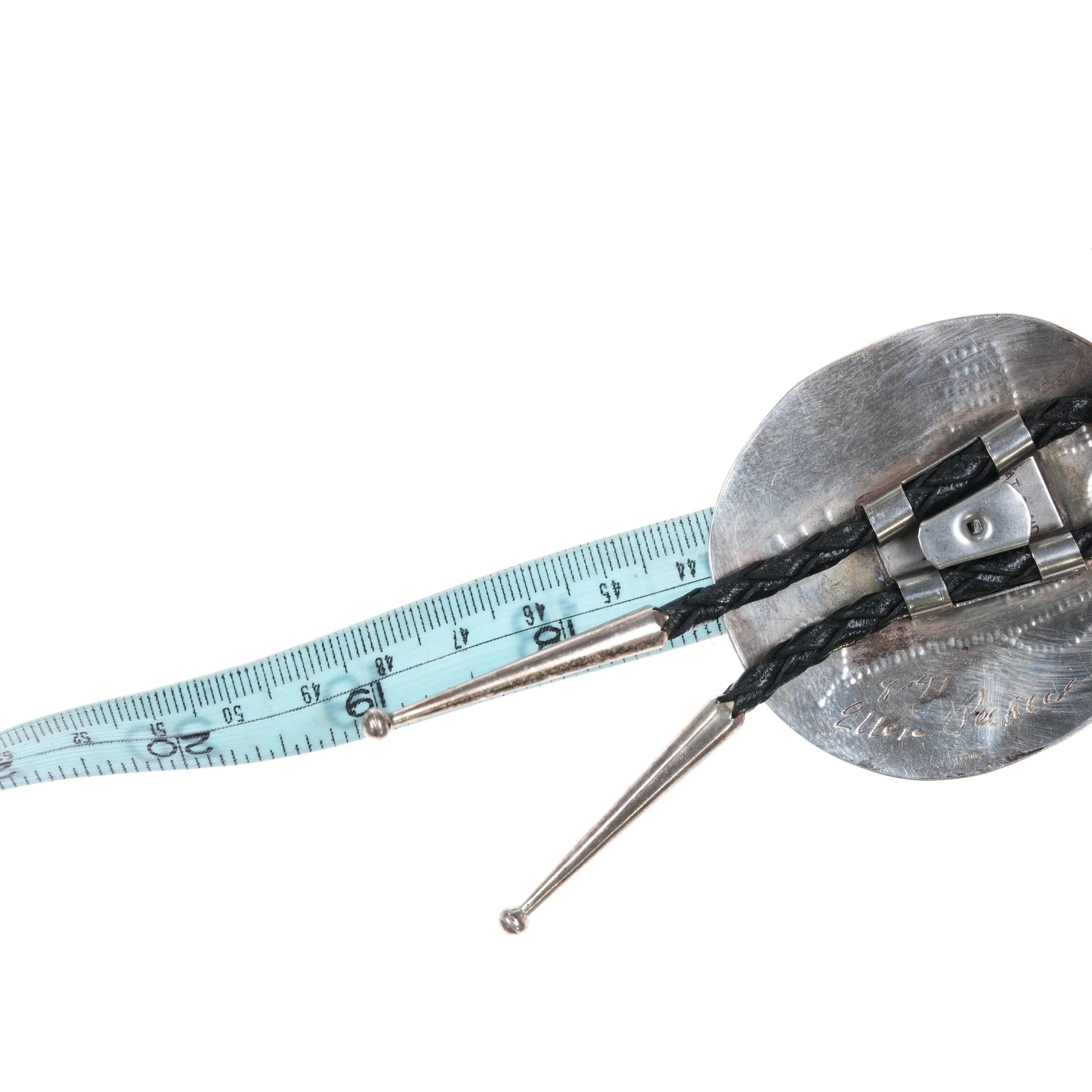 Large Ellen ? Southwestern sterling silver bolo tie. Solid sterling silver slide and tips. Weight and measurements in pics. 38" long. Expected wear with no apparent damage. Weight shown is just the entire bolo, if there is a tray pictured it will be tared out of course. Nice bolo from the last quarter of the 20th century. Illegible to me last name of artist.