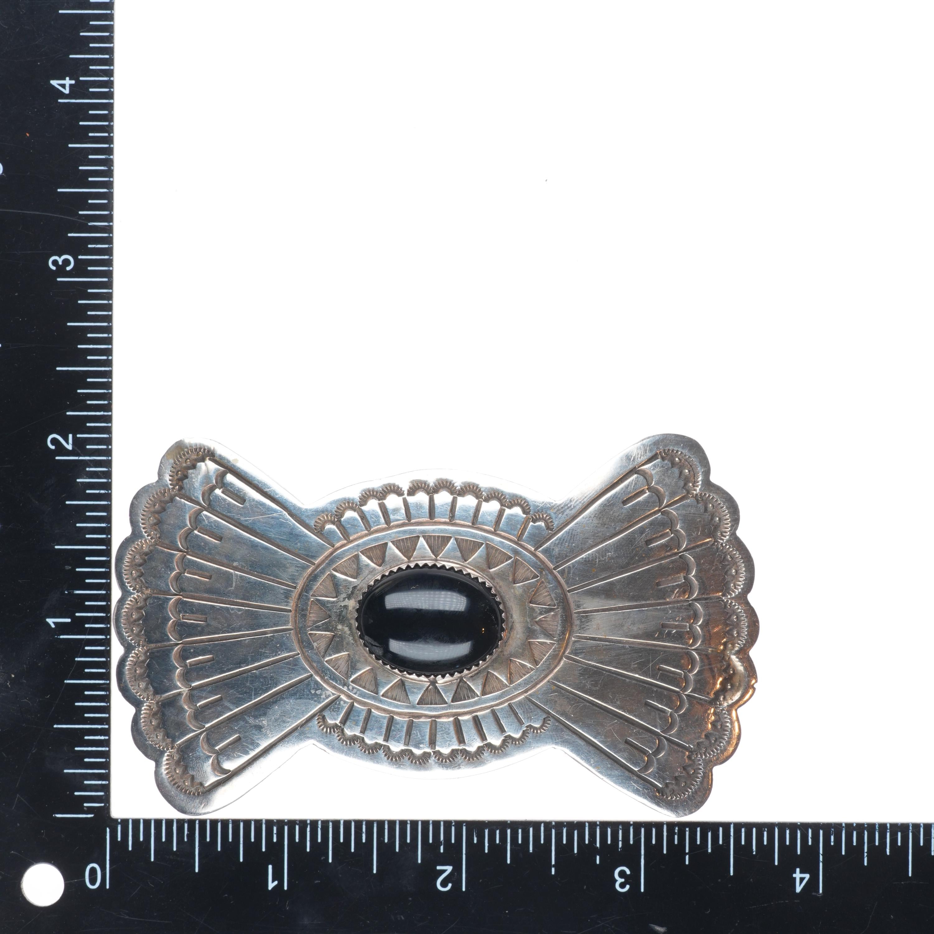 Large Vintage Navajo nicely stamped sterling silver onyx barrette/hair clip