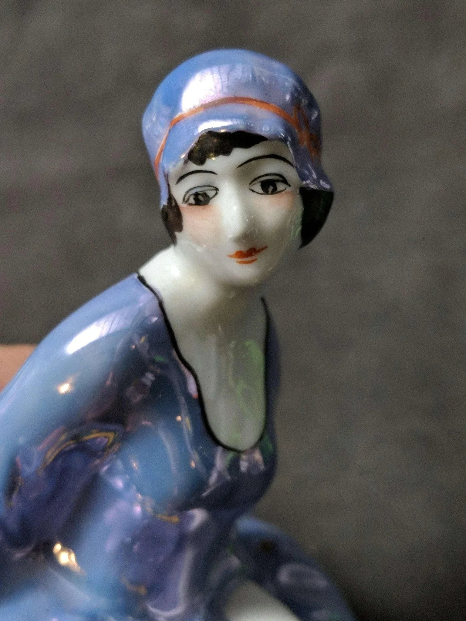 Lid Noritake Art Deco Powder Jar Woman Flapper Blue Lustre Butterflies. Selling<br>only the lid with no wear, no chips, cracks, or restorations. The base it goes<br>in will measureapproximately 3.25" front to back and 3.75" side to side.<br>Guarantee noritake.