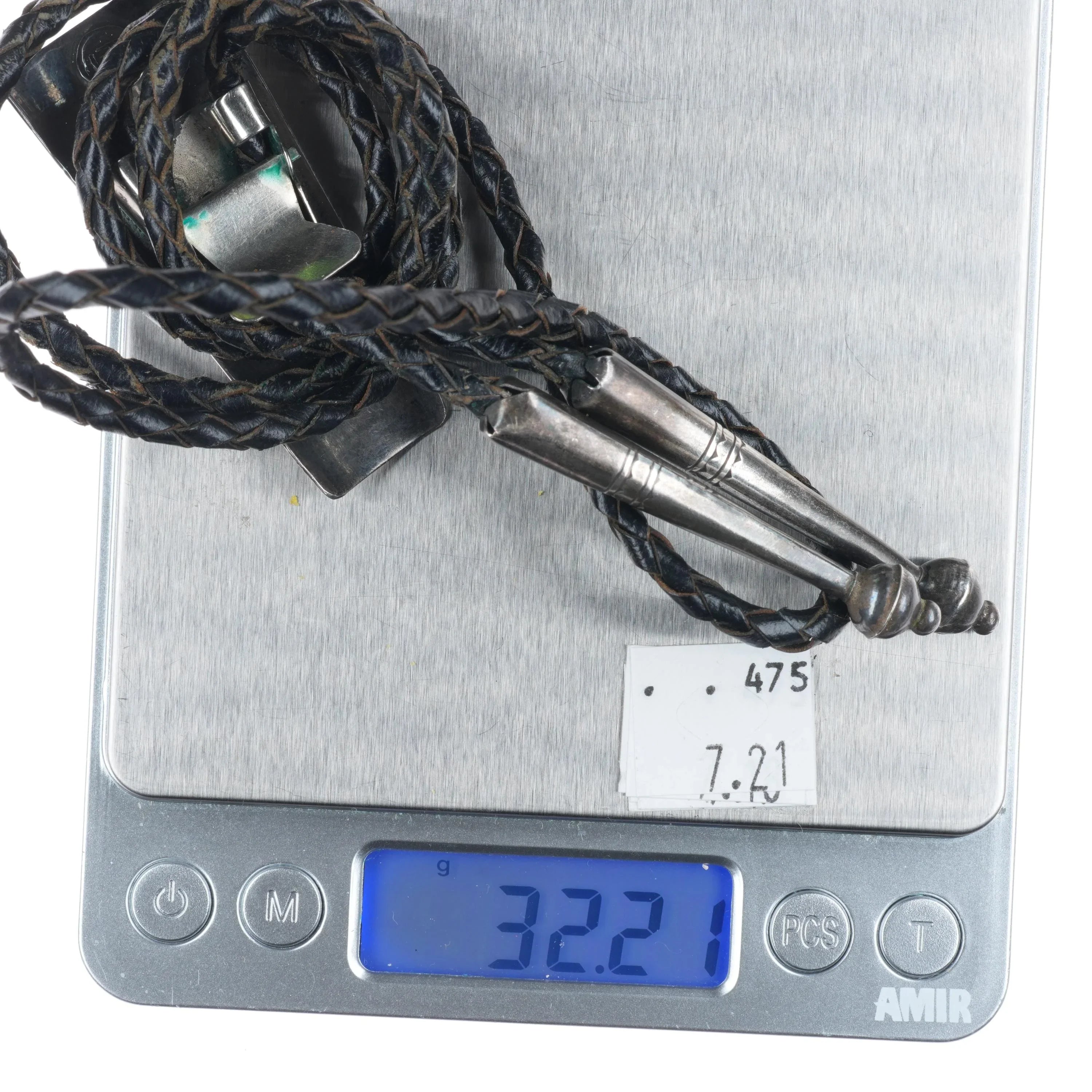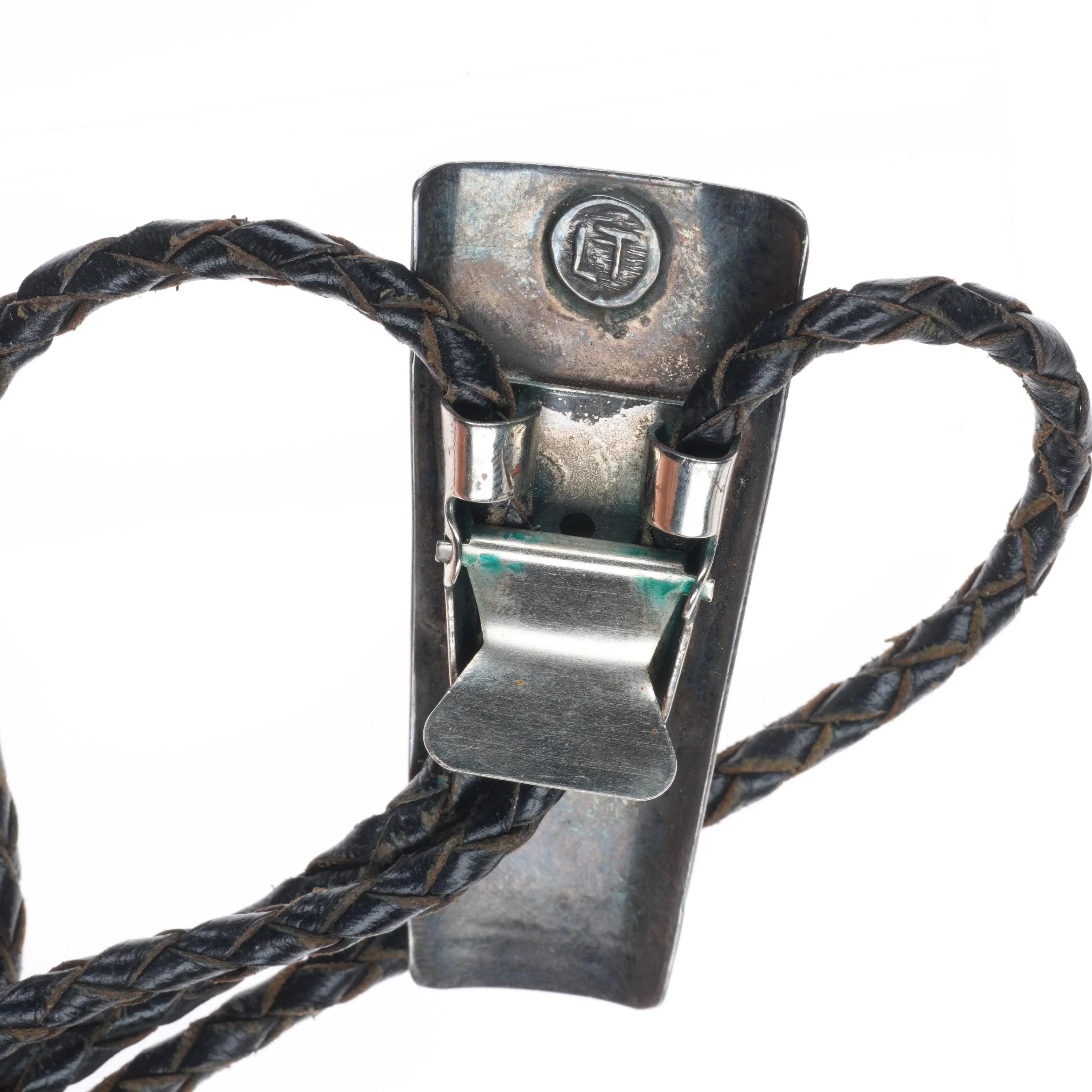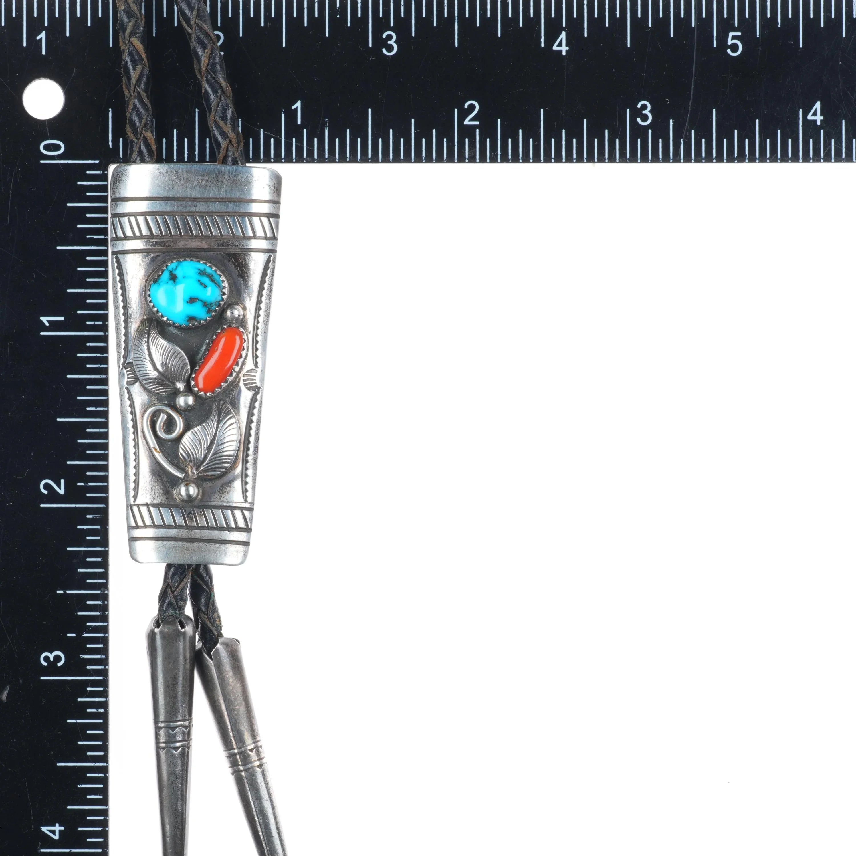 Lorenzo Tortalita - Santo Domingo sterling silver turquoise/coral bolo tie. Tested and guaranteed solid sterling silver slide and tips. Weight and measurements in pictures. Great bolo, 39" long with no issues. Tray is tared out, so weight shown is just the bolo of course.