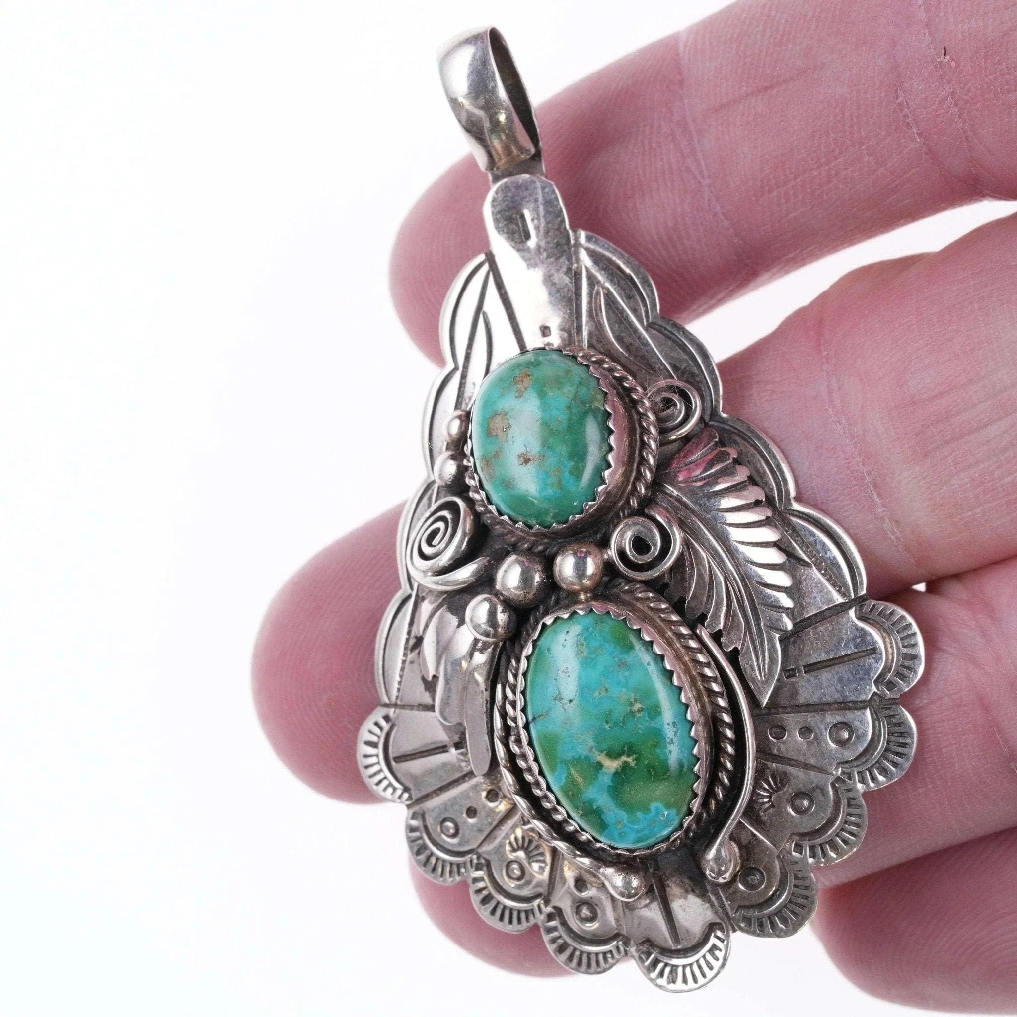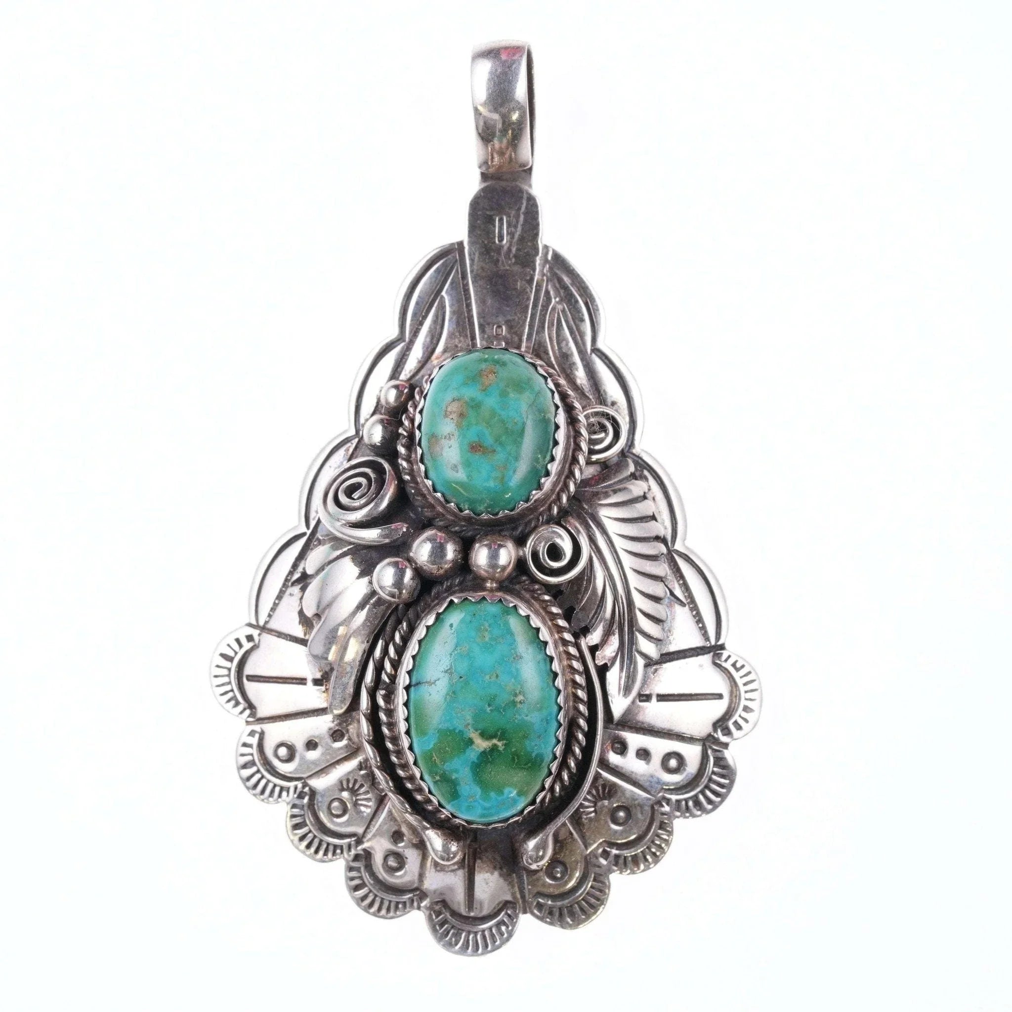 Lowell Draper Navajo sterling and turquoise pendant 2.75" tall x 1 5/8" wide,<br>bail as shown bends forward and open so it can be clipped on a set of Navajo<br>pearls or other beaded necklace, 18.9 grams.<br><br>All precious metals are tested and guaranteed, any Native American jewelry<br>referred to as Silver or Sterling is guaranteed to be a minimum of 90% (coin)<br>silver and possibly higher content. Anything marked is guaranteed to be what<br>it's marked, most bracelets are photographed on a 6" wrist (non hairy), rings<br>photographed on the appropriate sized finger when possible. With bracelets if<br>the measurement is not given in the description then inside circumference is<br>shown where the metal meets the number on the the cloth tape measure.