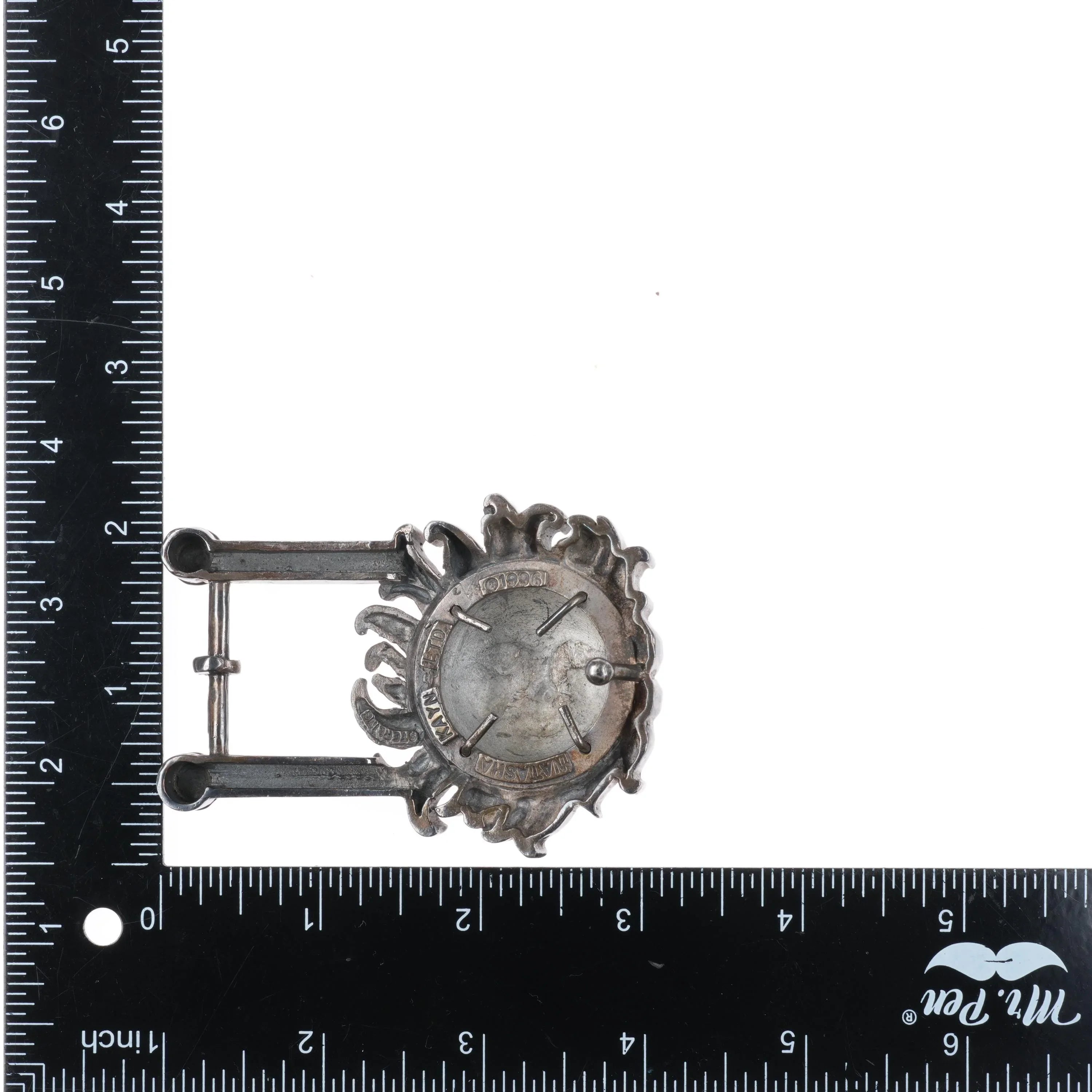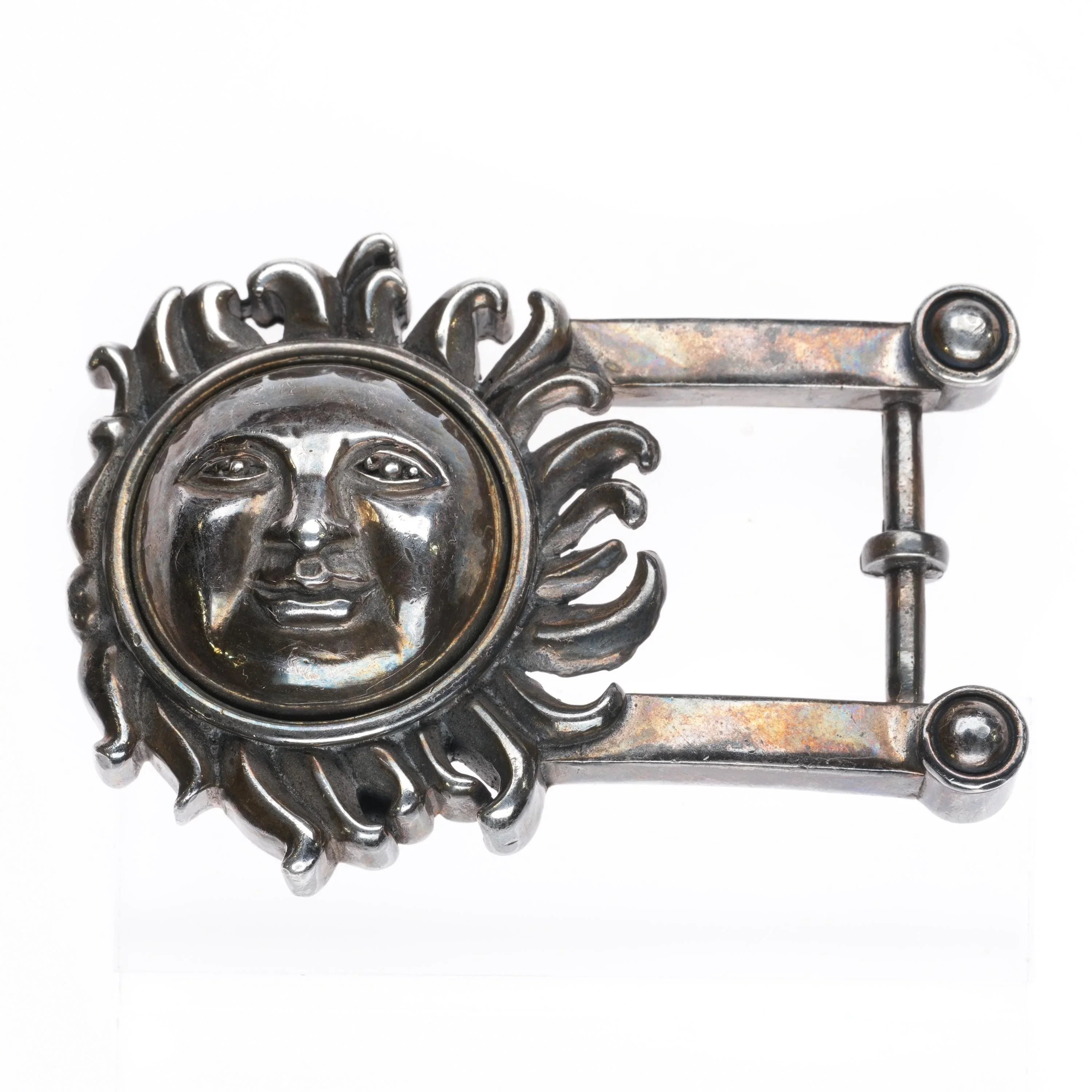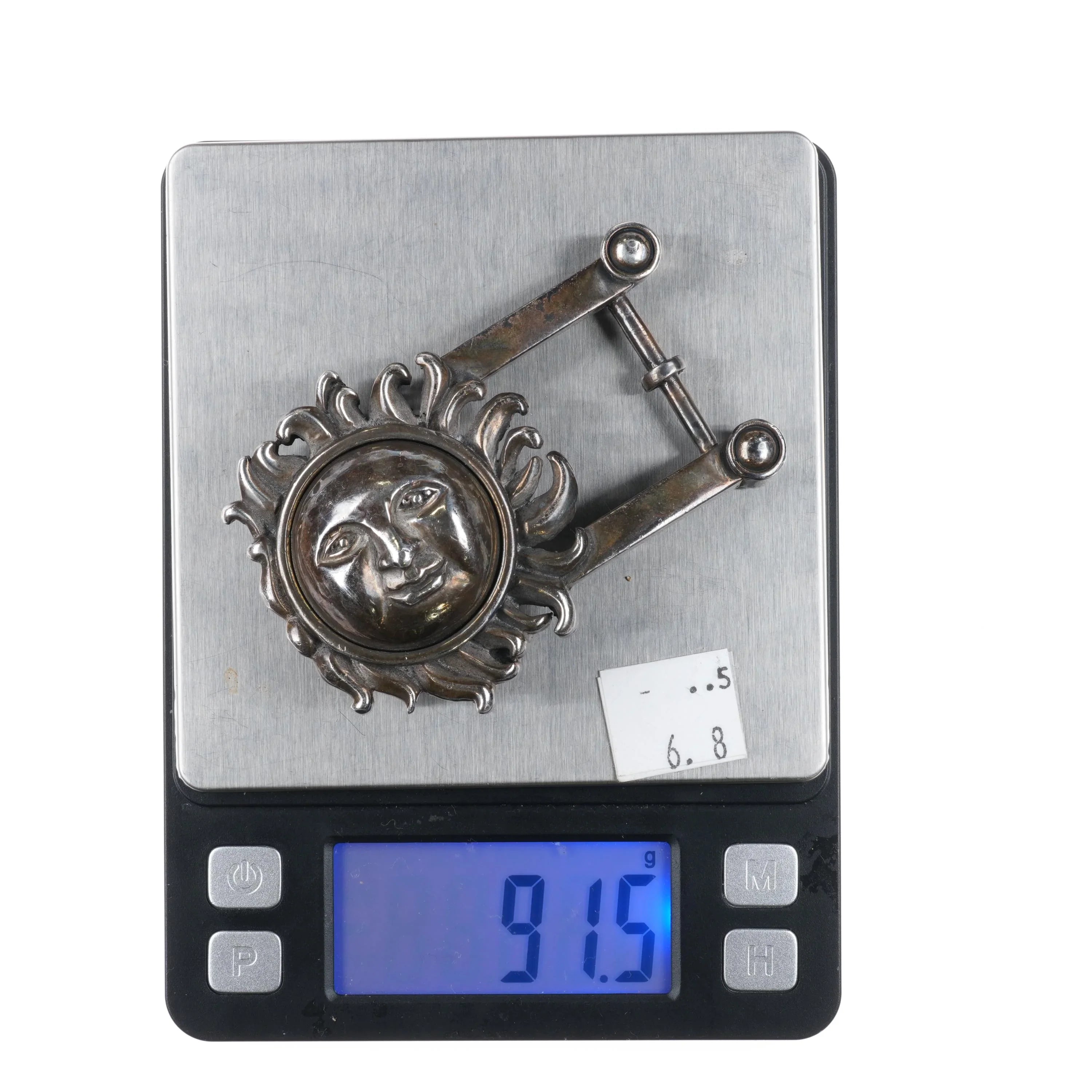 Natasha Kayn Retro Sterling silver sunface belt buckle smiling sun. Solid sterling silver tested with weight and measurements in pictures.. Stamped sterling with other hallmarks shown.. Some expected wear with no damage.