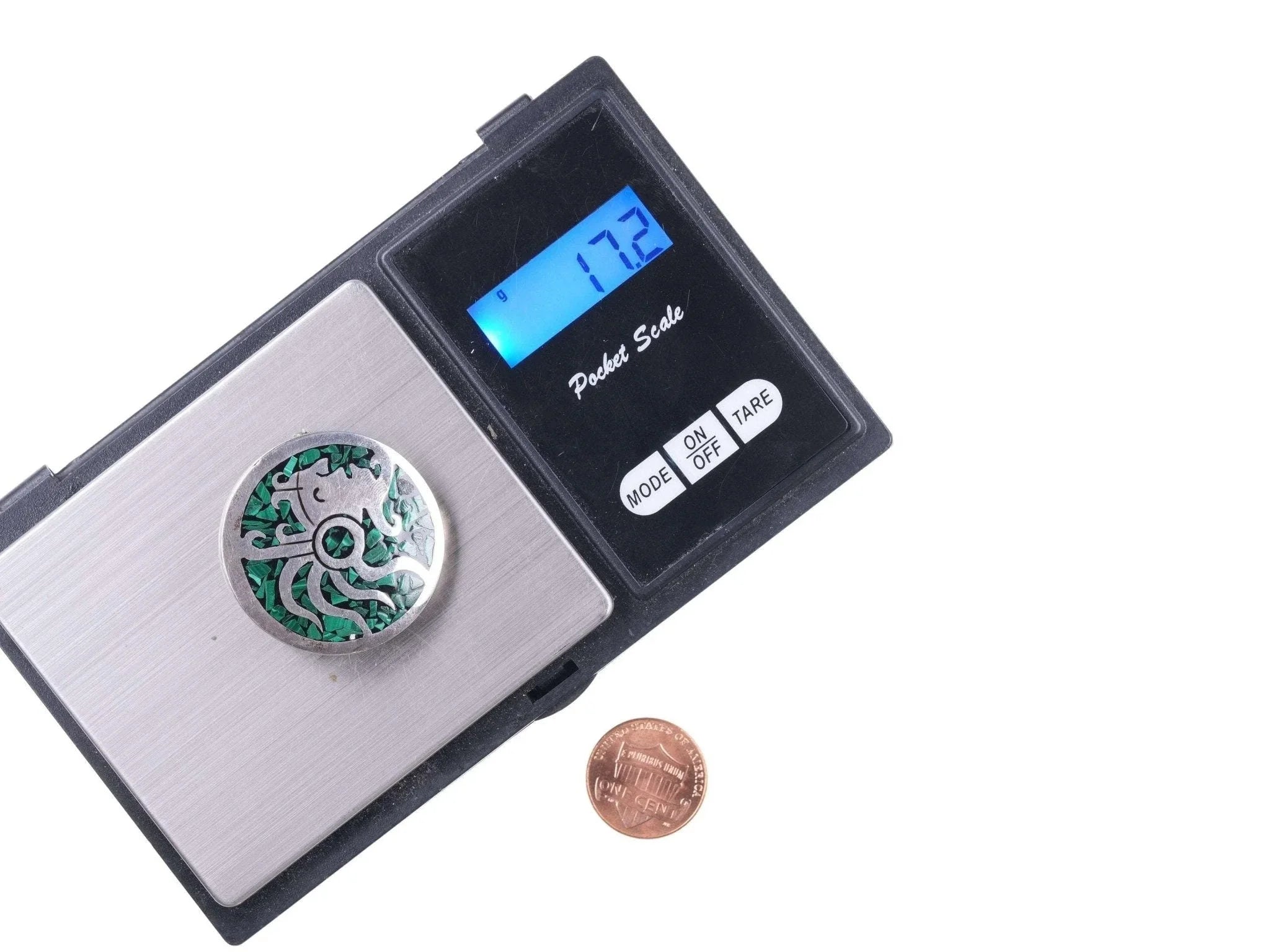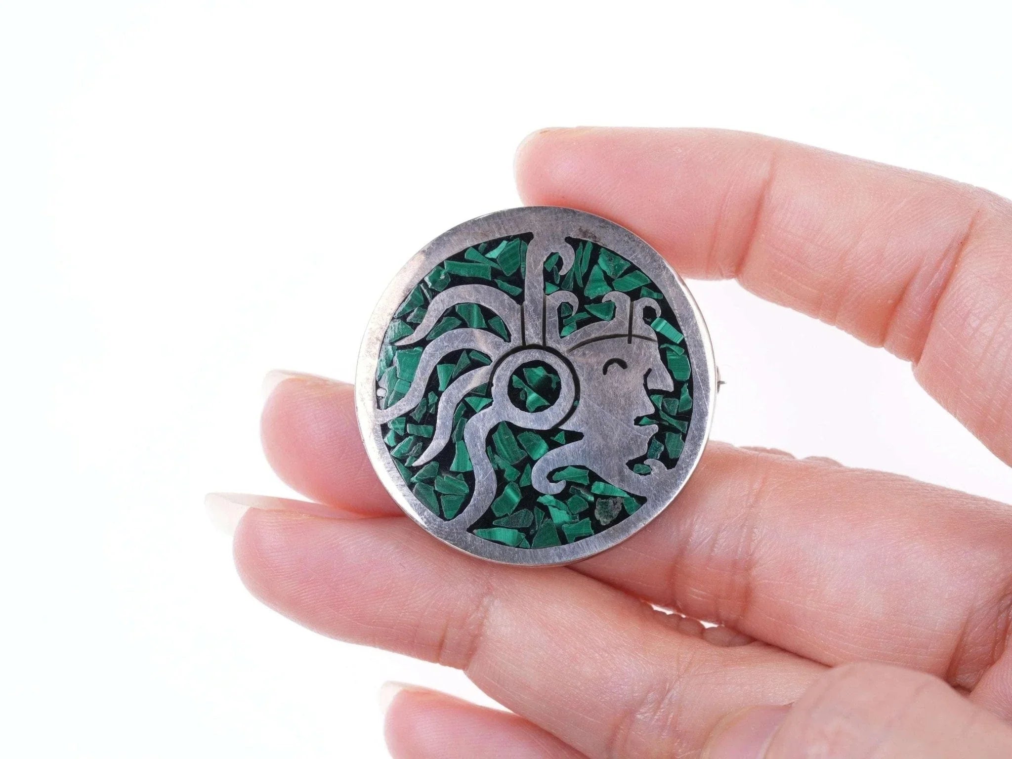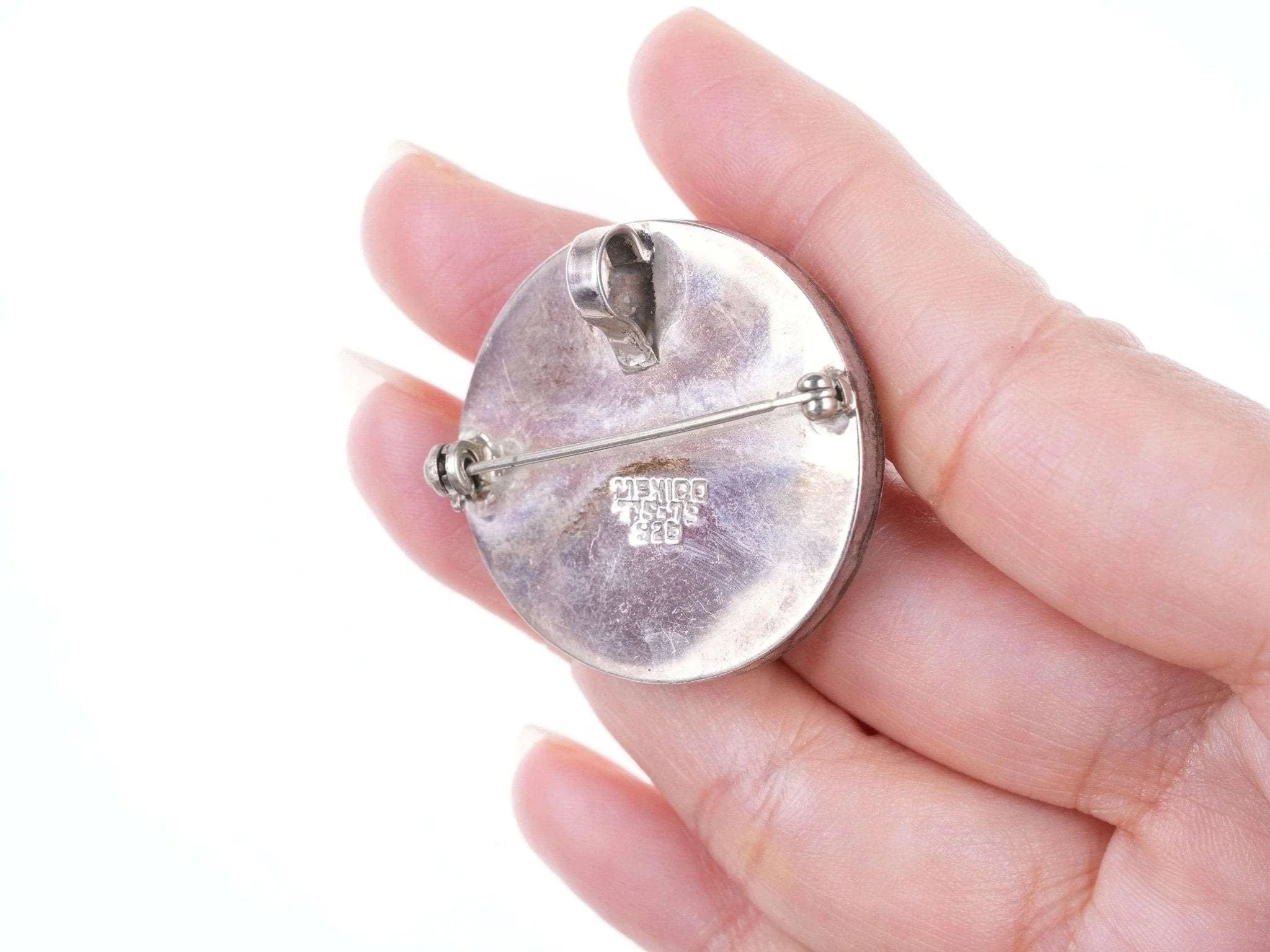 Retro Aztec/Incan warrior sterling chip inlay Pendant/pin 1 3/8" round.<br><br>All precious metals are tested and guaranteed, any Native American jewelry<br>referred to as Silver or Sterling is guaranteed to be a minimum of 90% (coin)<br>silver and possibly higher content. Anything marked is guaranteed to be what<br>it's marked, most bracelets are photographed on a 6" wrist (non hairy), rings<br>photographed on the appropriate sized finger when possible. With bracelets if<br>the measurement is not given in the description then inside circumference is<br>shown where the metal meets the number on the the cloth tape measure.