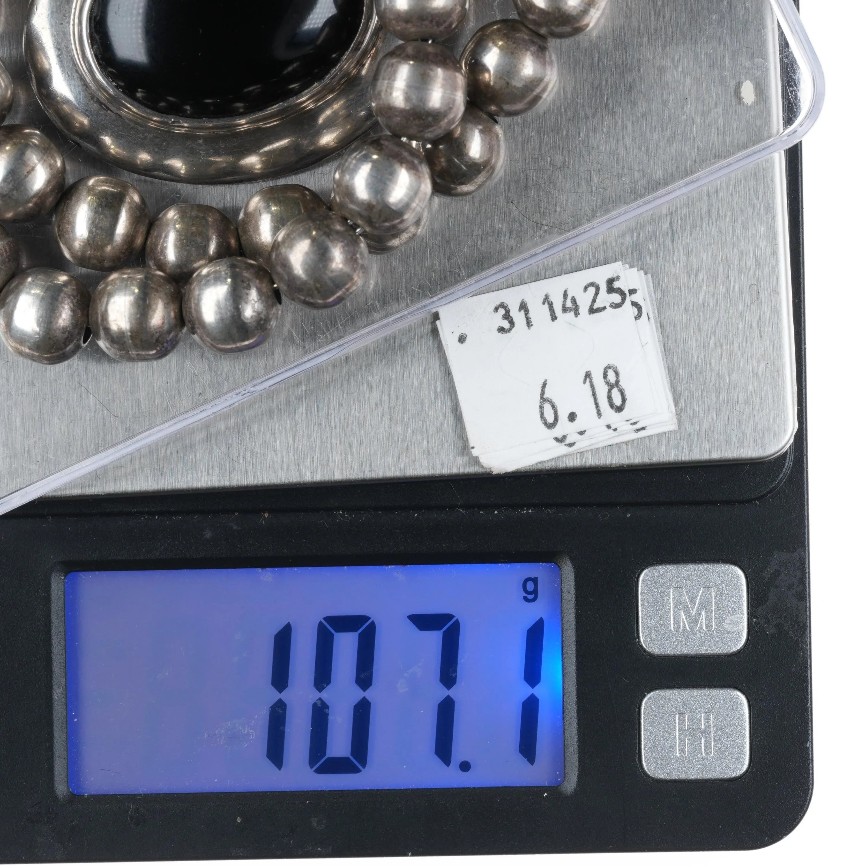 Retro Mexican sterling silver beaded necklace w/ modernist onyx pendant. Tested and guaranteed solid sterling silver with weight and measurements in the pictures. No issues whatsoever, very clean set. 8" bracelet, approx 15" necklace.