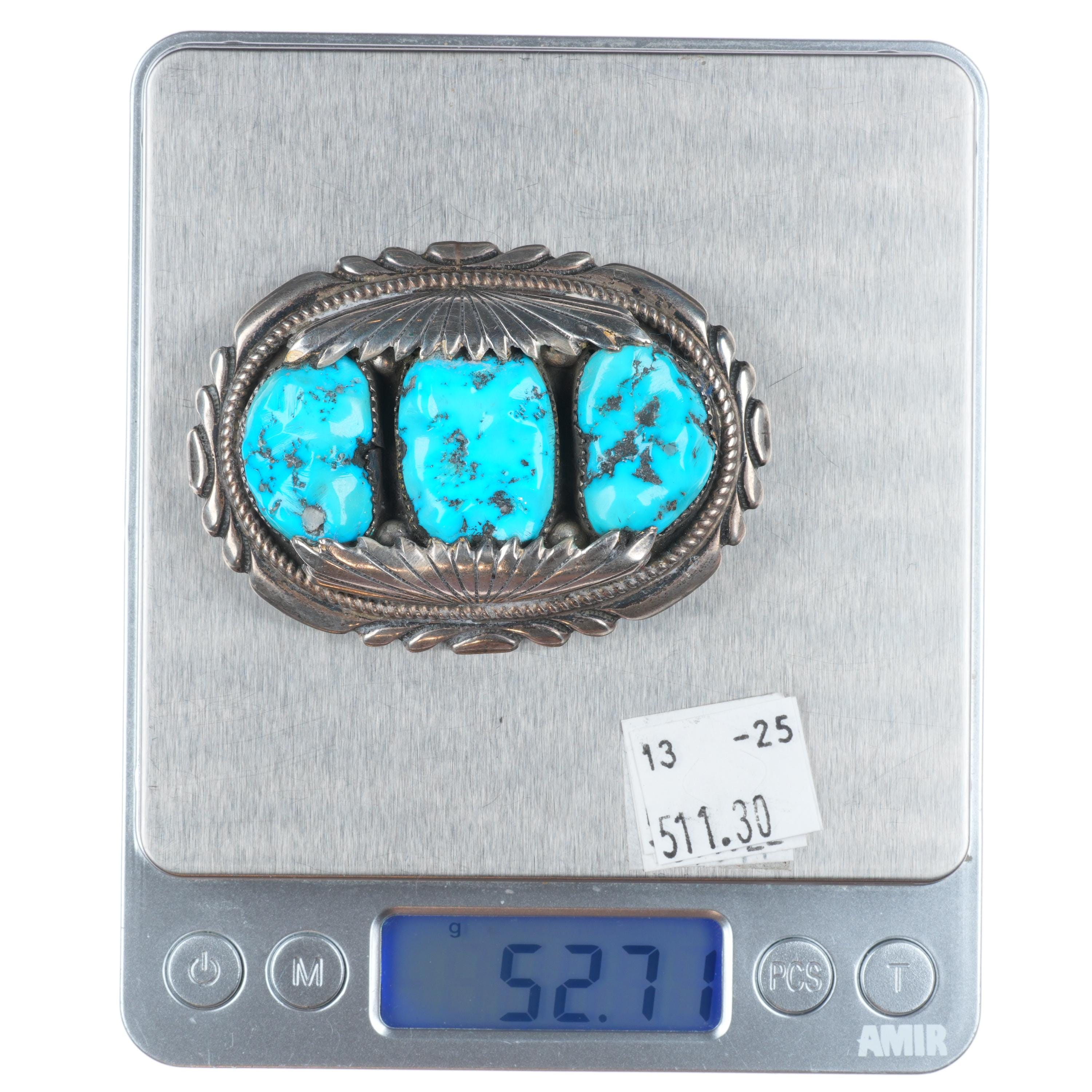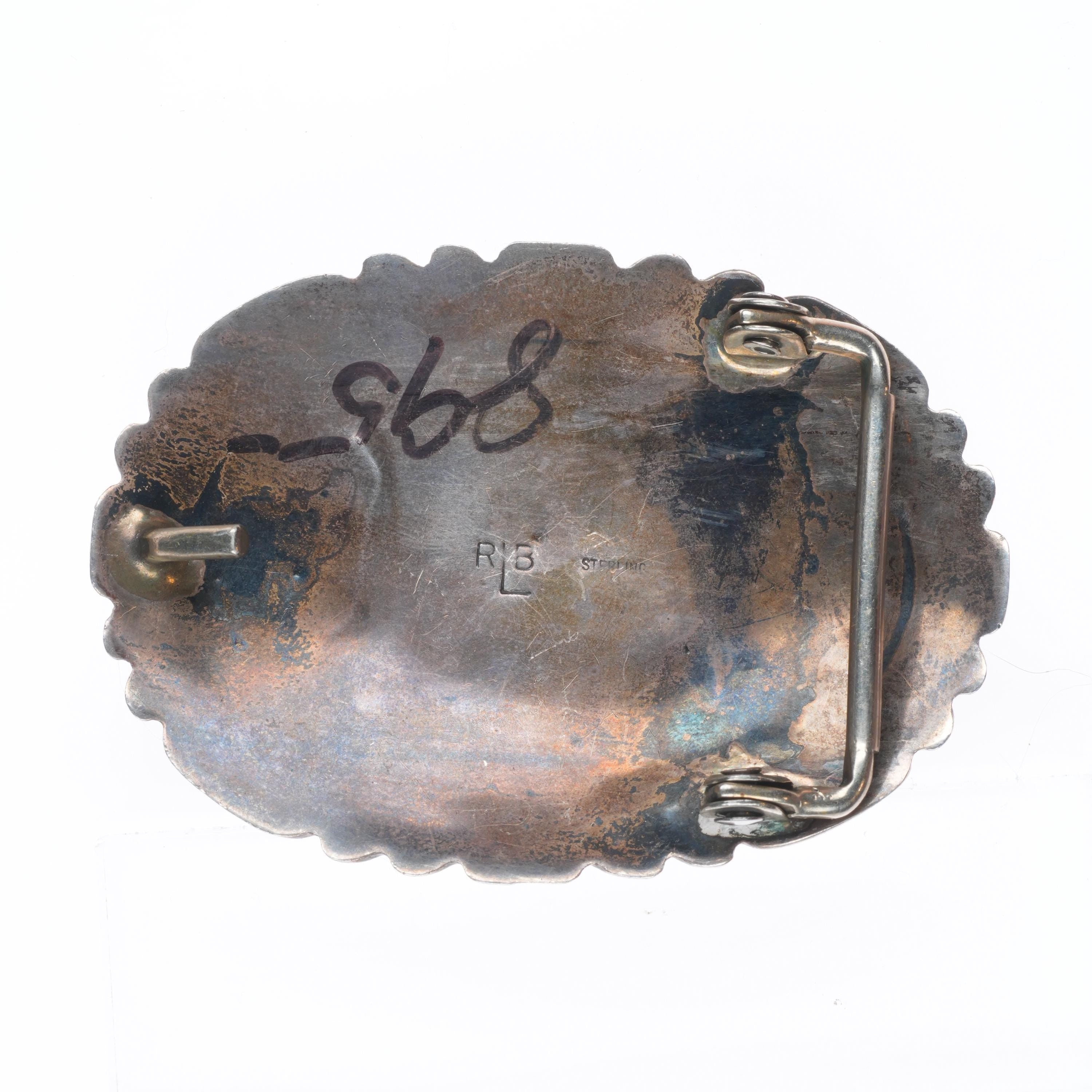 Robert and Bernice Leekya Zuni sterling silver 3 stone turquoise belt buckle. Tested and guaranteed solid sterling silver weight and measurements in pictures, Circa third quarter of the 20th century. Fits a 1.25" belt. Functional with age appropriate wear.