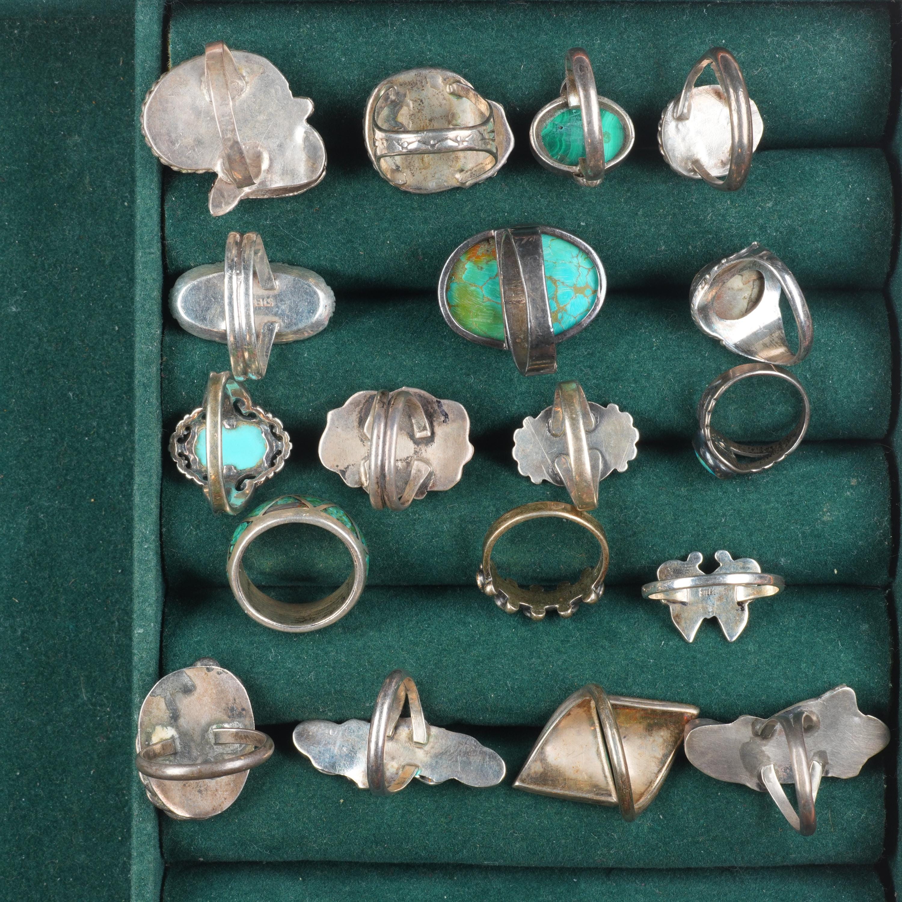 Selling the 18 rings shown with weight and measurements in pictures, shown on sizers. Age appropriate wear. Some marked, some not marked. I am making lots of these lots with my wife photographing and me listing. We are listing in lots due to time limitations, so we are not heavily scrutinizing each ring. Most are going to be Native American made, but there will likely be some southwestern style rings mixed in each lot. Or one two totally unrelated but still sterling. My wife who is making the lots doesn‘t know the difference as she‘s Vietnamese. Please look at the pictures and make up your own mind for condition, etc. There may be dents, cracked stones, etc. I tried to weed out any junk before I gave them to her, but we are in a hurry. Time is the number one consideration when making these lots so there will be some surprises, hopefully more good than bad :)