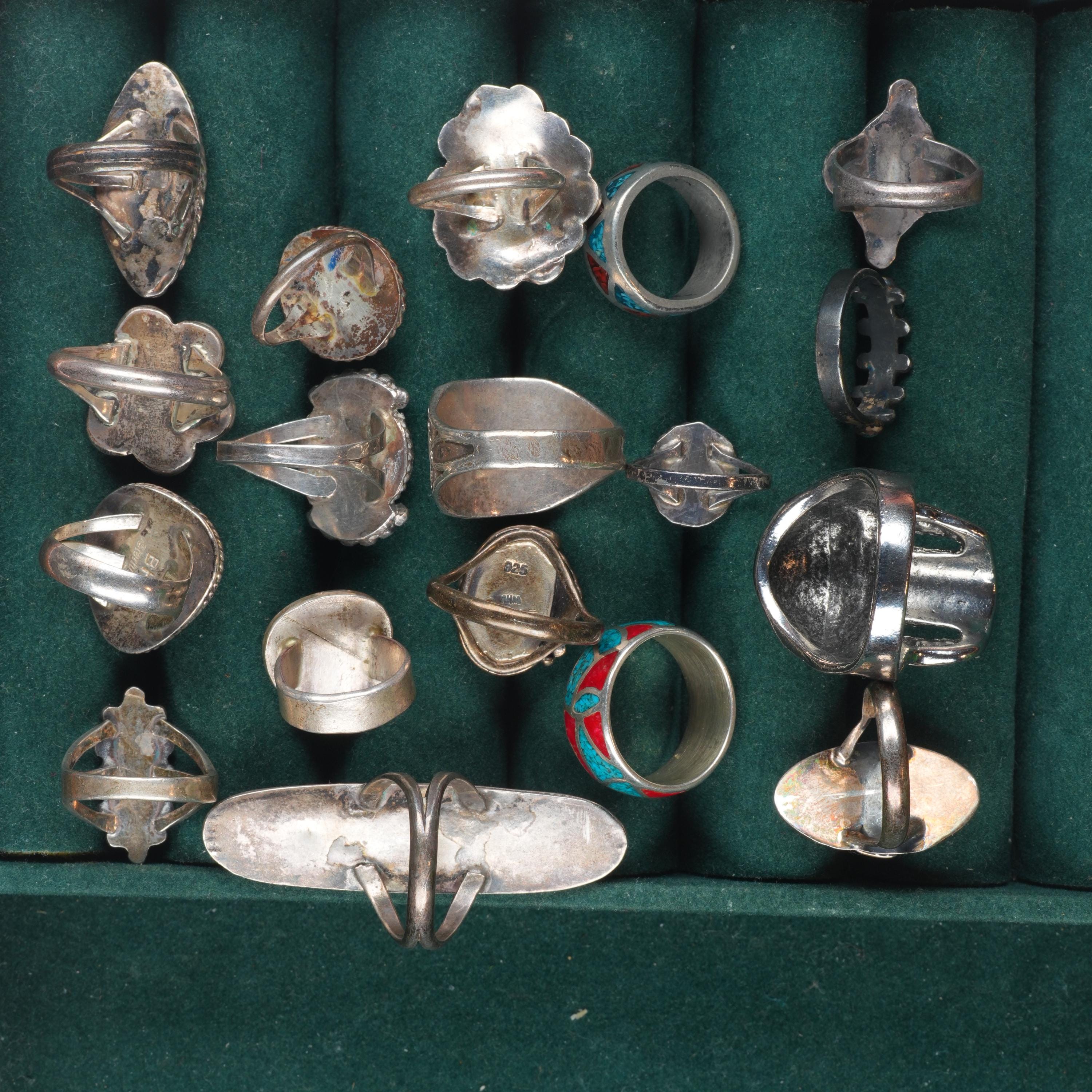 Selling the 18 rings shown with weight and measurements in pictures, shown on sizers. Age appropriate wear. Some marked, some not marked. We are making lots of these lots with my wife photographing and me listing. We are listing in lots due to time limitations, so we are not heavily scrutinizing each ring. Most are going to be Native American made, but there will likely be some southwestern style rings mixed in each lot. Or one two totally unrelated but still sterling. My wife who is making the lots doesn‘t know the difference as she‘s Vietnamese. Please look at the pictures and make up your own mind for condition, etc. There may be dents, cracked stones, etc. I tried to weed out any junk before I gave them to her, but we are in a hurry. Time is the number one consideration when making these lots so there will be some surprises, hopefully more good than bad :)