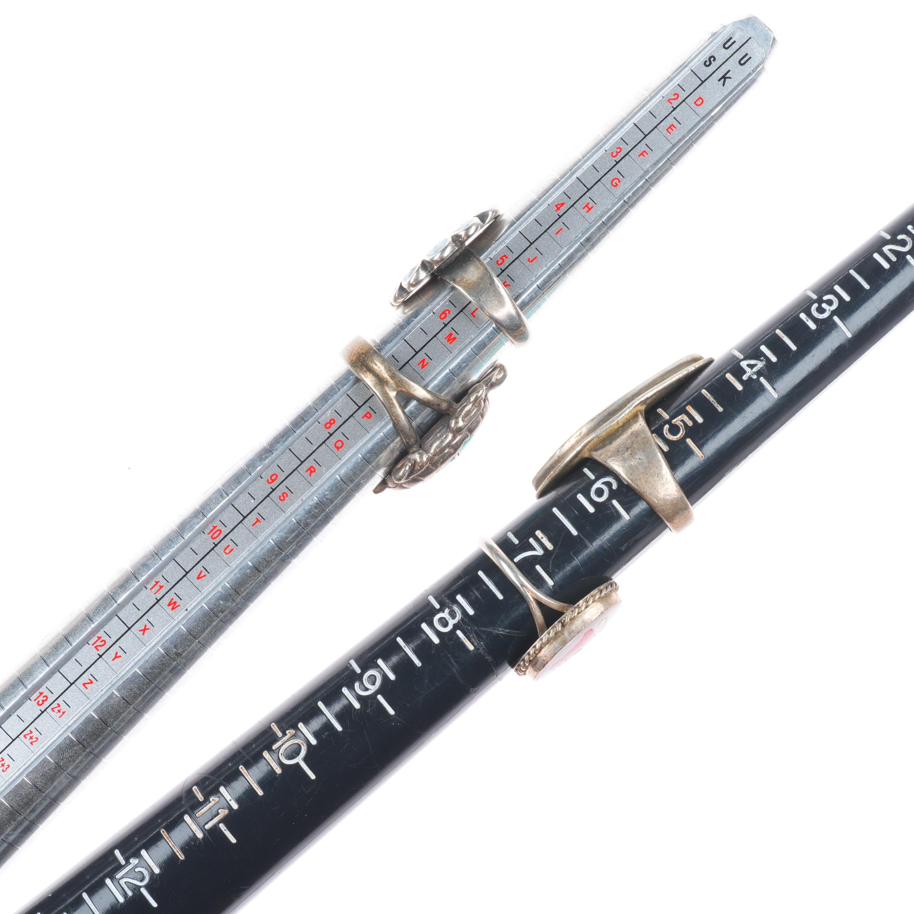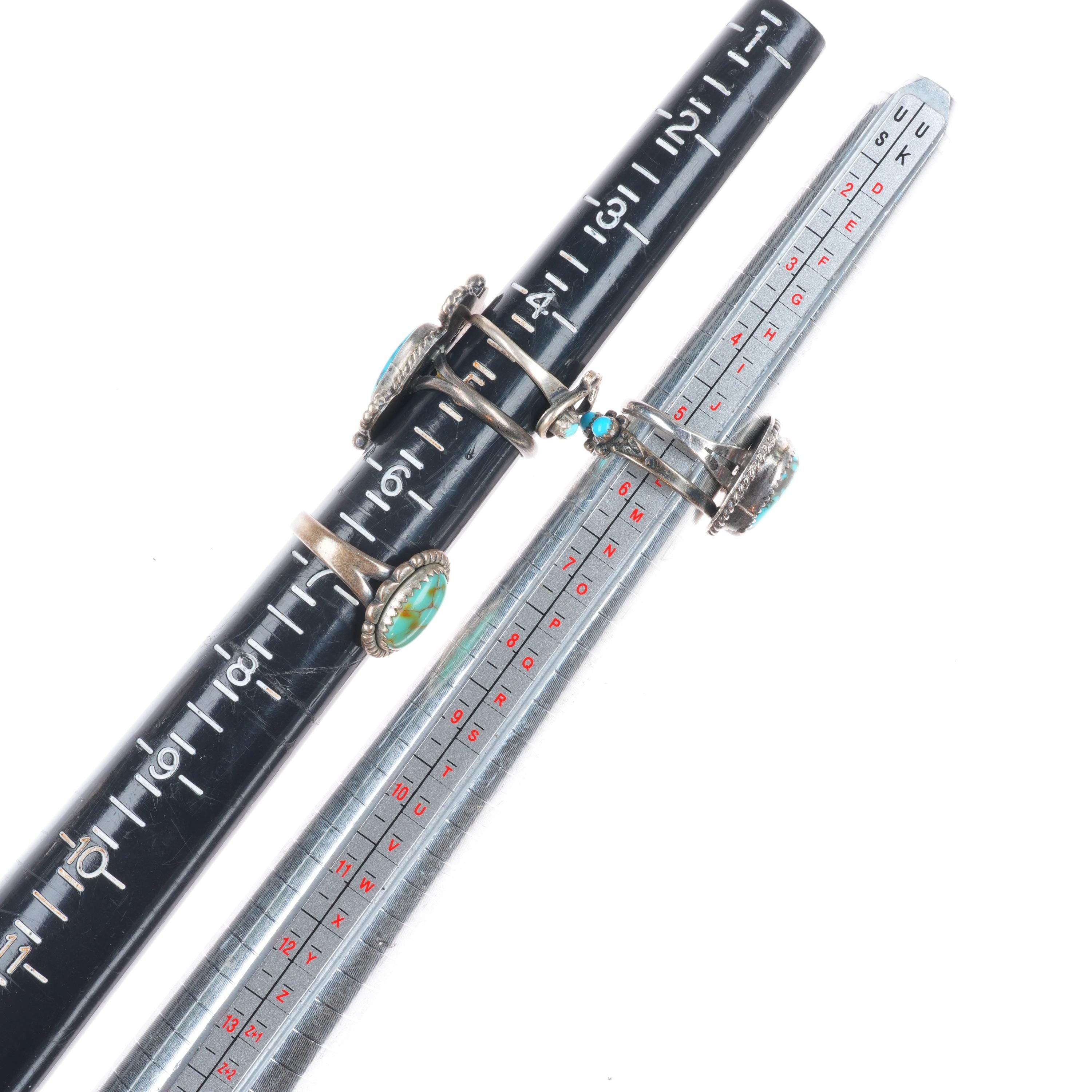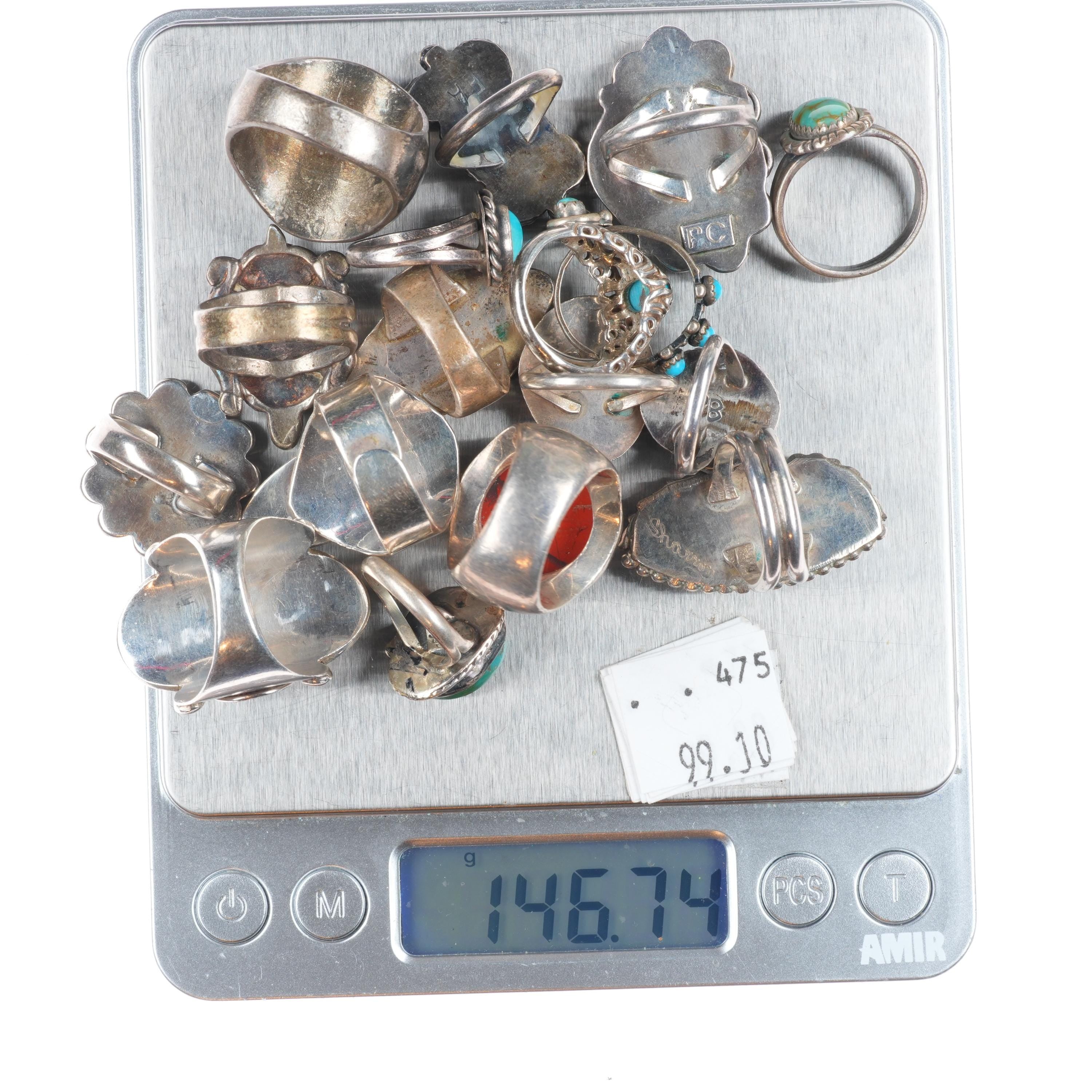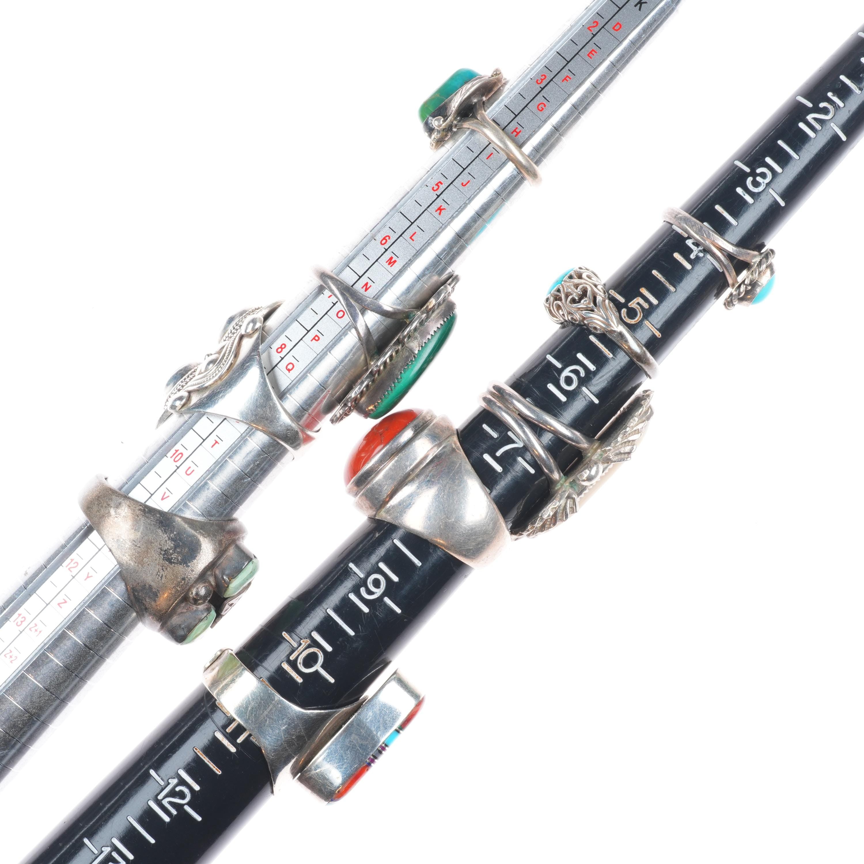 sz4-11 Navajo/Zuni/Southwestern sterling silver turquoise/shell/coral rings lot. Tested and guaranteed solid sterling silver. Selling the 18 rings shown with weight and measurements in pictures, shown on sizers. Age appropriate wear. Some marked, some not marked. I am making lots of these lots with my wife photographing and me listing. We are listing in lots due to time limitations, so we are not heavily scrutinizing each ring. Most are going to be Native American made, but there will likely be some southwestern style rings mixed in each lot. Or one two totally unrelated but still sterling. My wife who is making the lots doesn‘t know the difference as she‘s Vietnamese. Please look at the pictures and make up your own mind for condition, etc. There may be dents, cracked stones, etc. I tried to weed out any junk before I gave them to her, but we are in a hurry. Time is the number one consideration when making these lots so there will be some surprises, hopefully more good than bad :)
