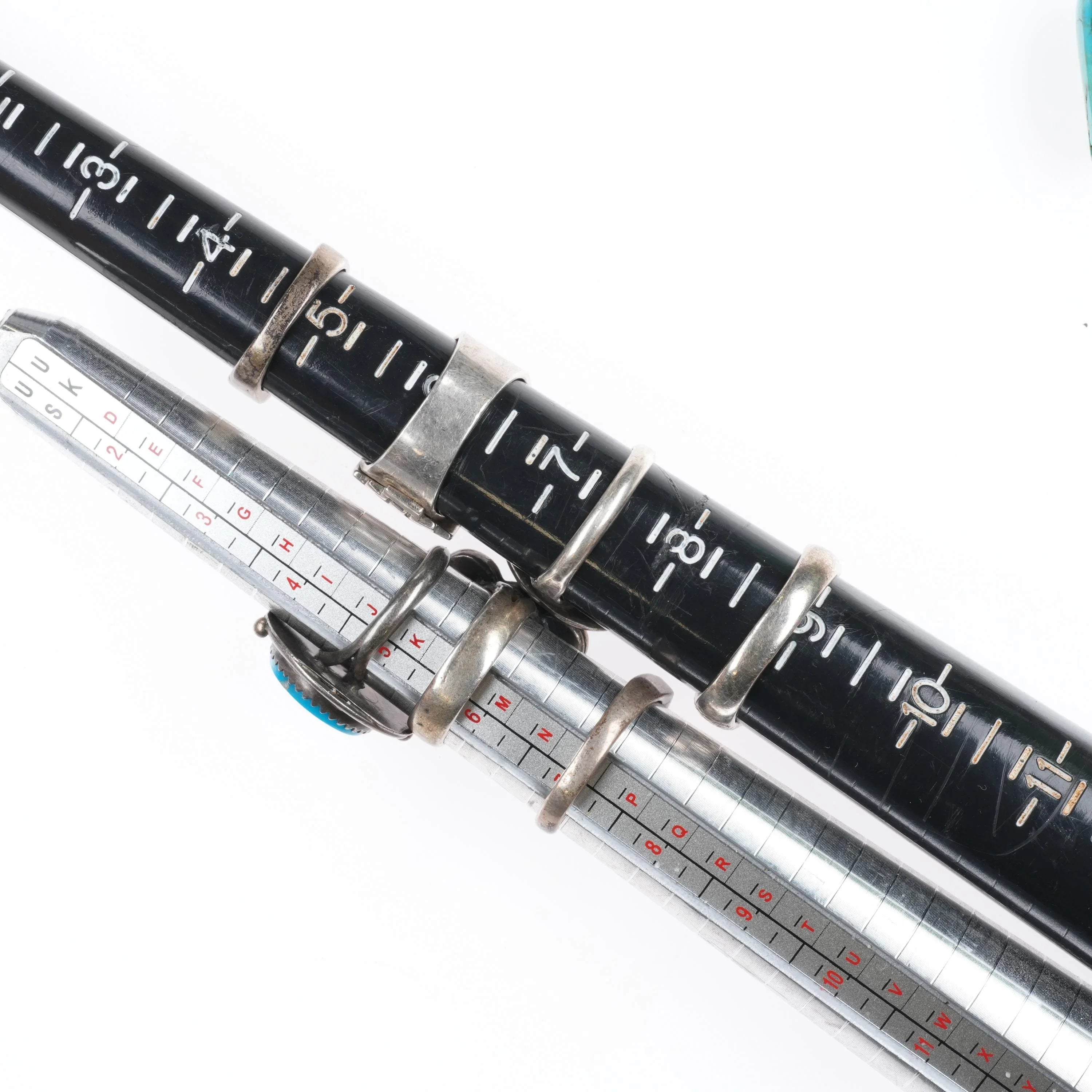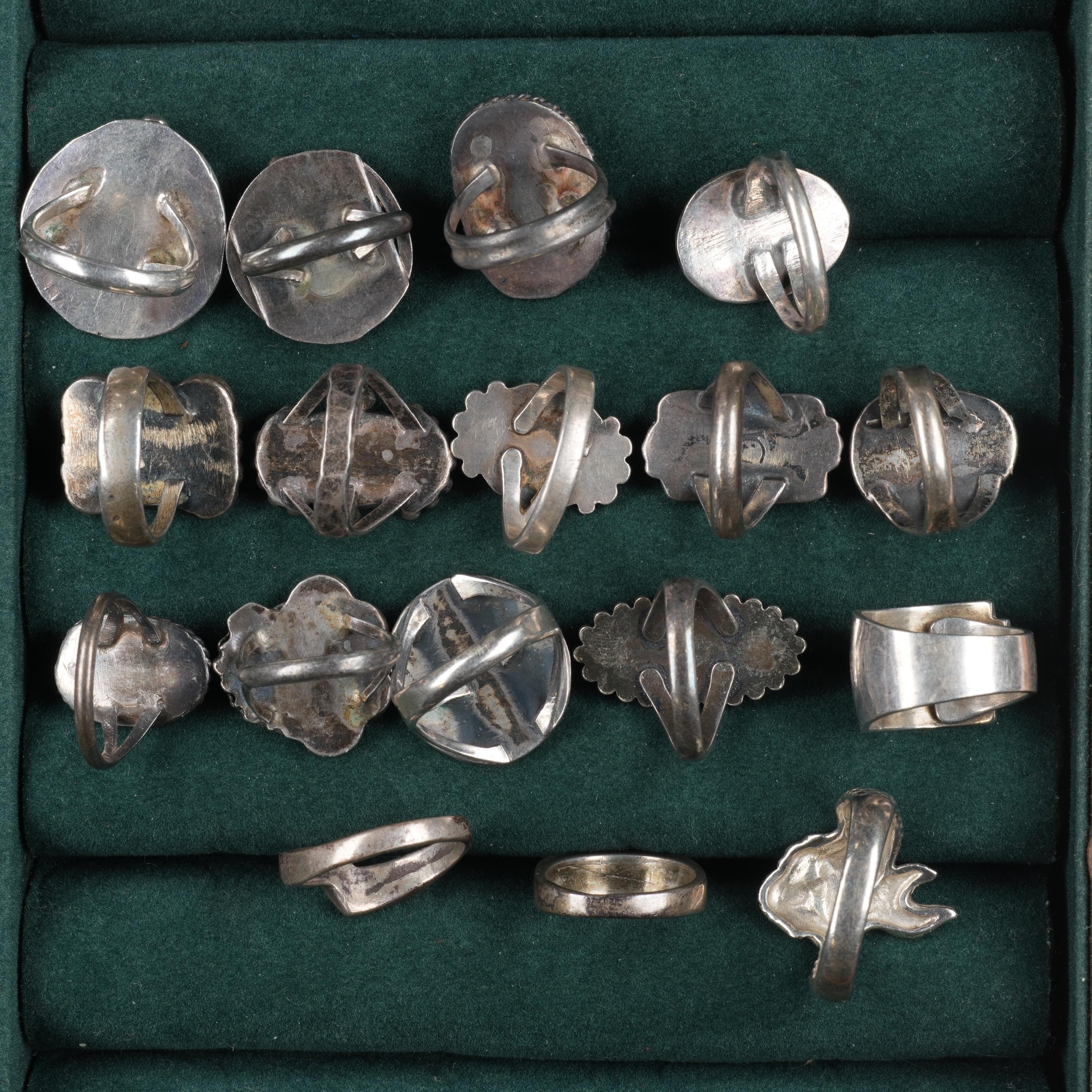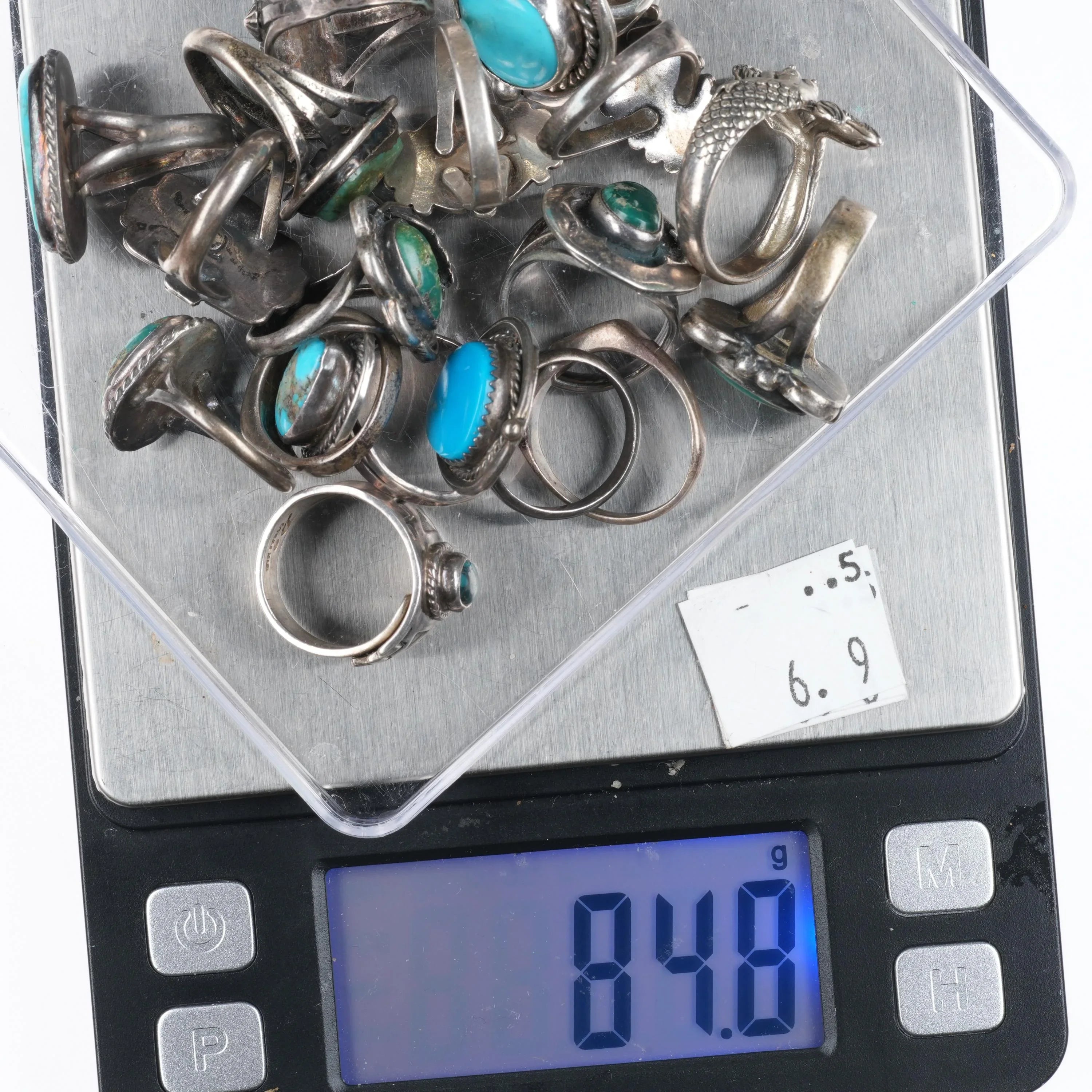 Sz4.5-9 vintage Collection sterling silver Turquoise Navajo, Zuni rings. Selling the 17 rings shown with weight and measurements in pictures. Second from the top right side needs soldered where the shank meets the ring top, no other apparent breaks. All are tested and guaranteed Solid sterling silver. Various makers, ages, and stones. All solid sterling silver, tested, some marked. These will be packed immediately after listing and won‘t be available to answer questions on specific rings. I‘m going to try offering some of these as lots due to time limitations, so selling partial lots or answering a bunch of questions will defeat the purpose.
