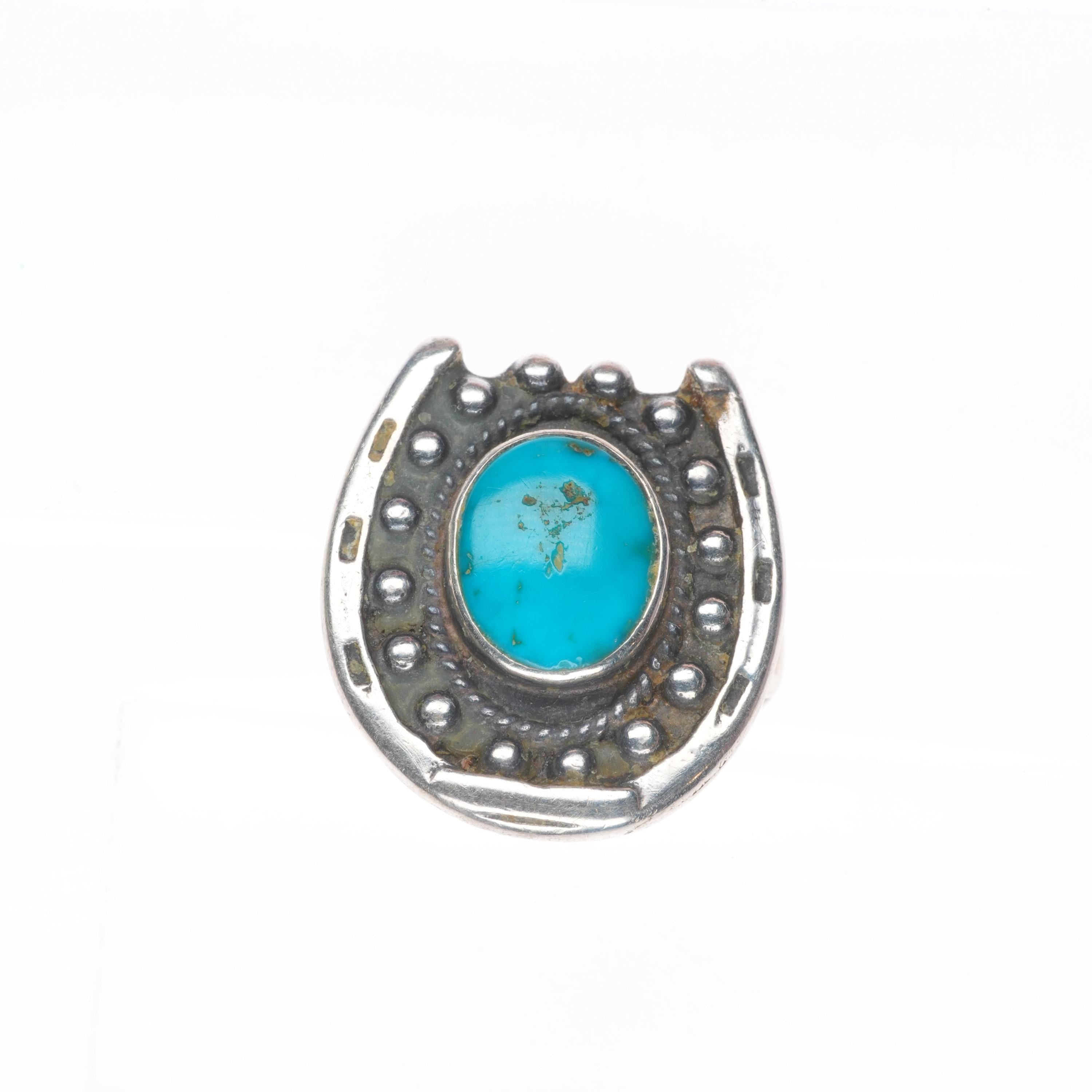 sz6 Vintage Navajo sterling silver horseshoe ring with nice turquoise. Tested and guaranteed solid sterling silver, circa third quarter of the 20th century. Some expected wear, weight and measurements in pictures. Unmarked.