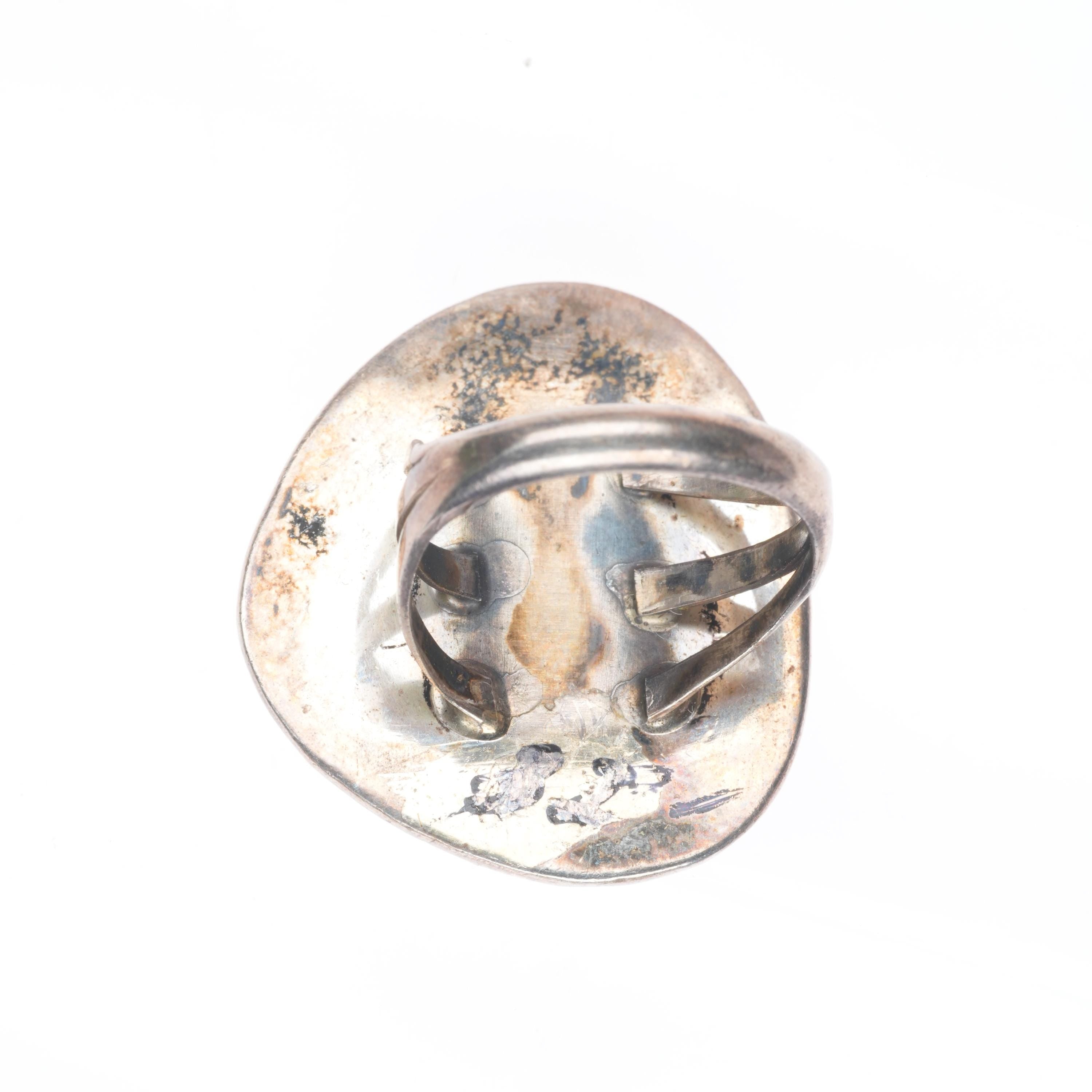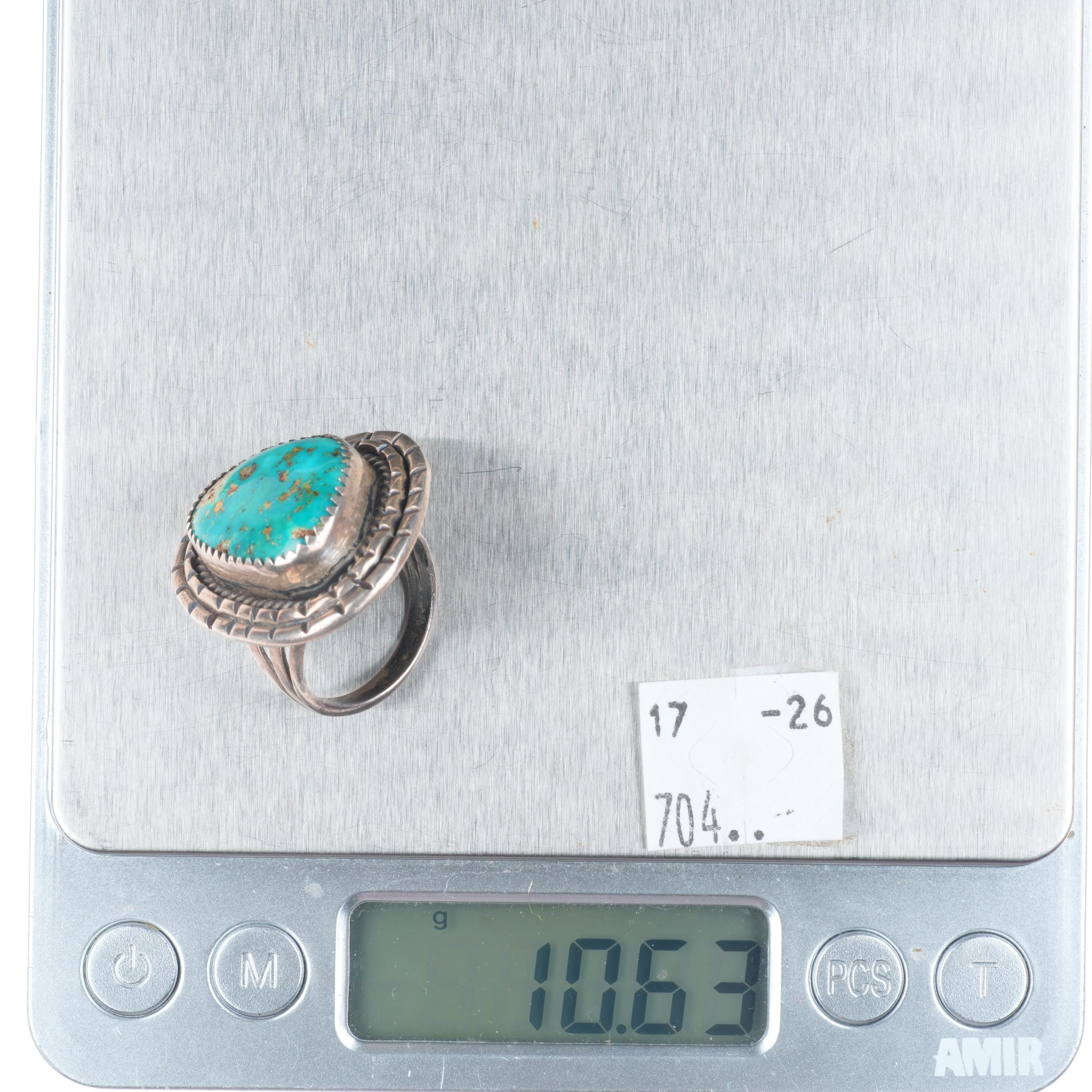 sz7 Vintage Navajo sterling silver ring with nice green turquoise. Tested and guaranteed solid sterling silver, circa third quarter of the 20th century. Some expected wear, weight and measurements in pictures.