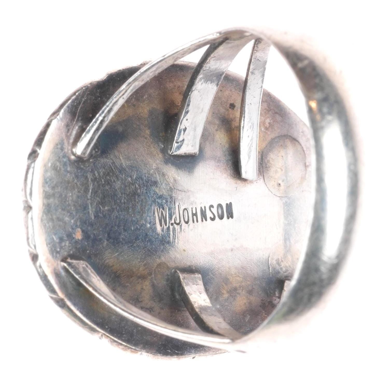 sz8 W Johnson Navajo sterling silver turquoise shadowbox ring. Tested and guaranteed solid sterling silver, circa third quarter of the 20th century. Some expected wear, weight and measurements in pictures.