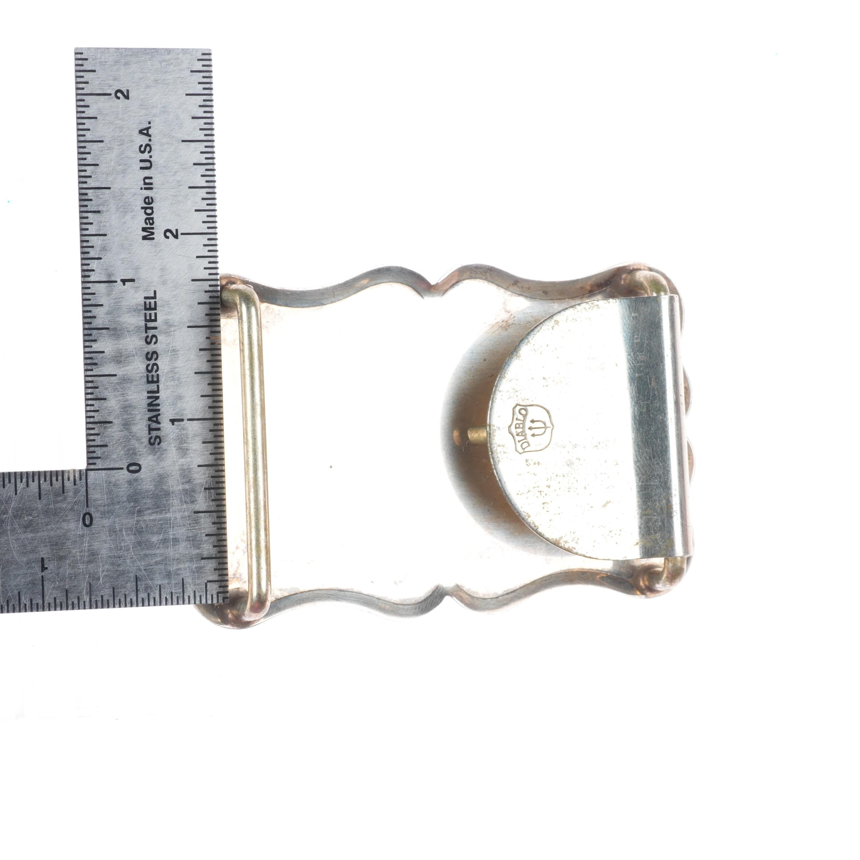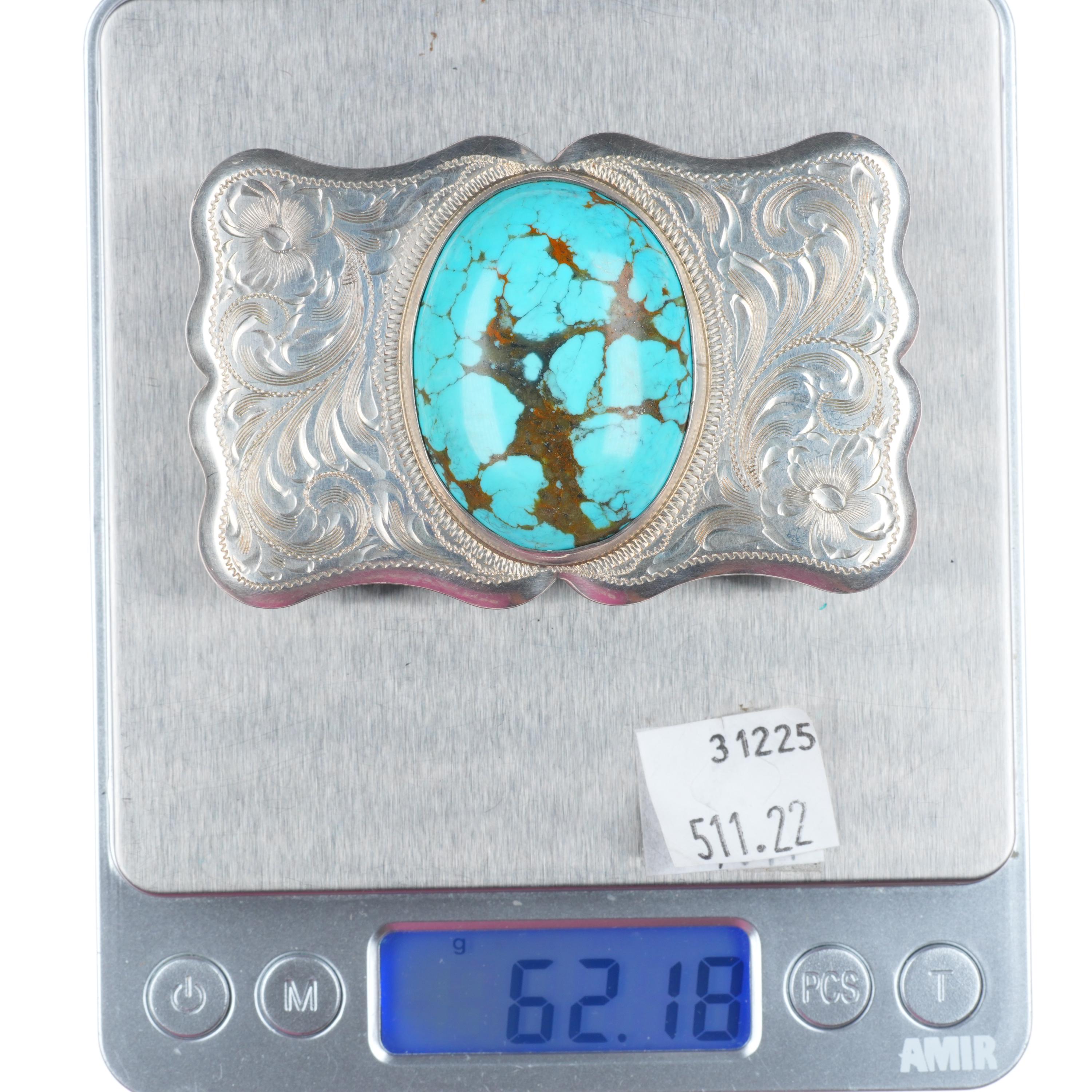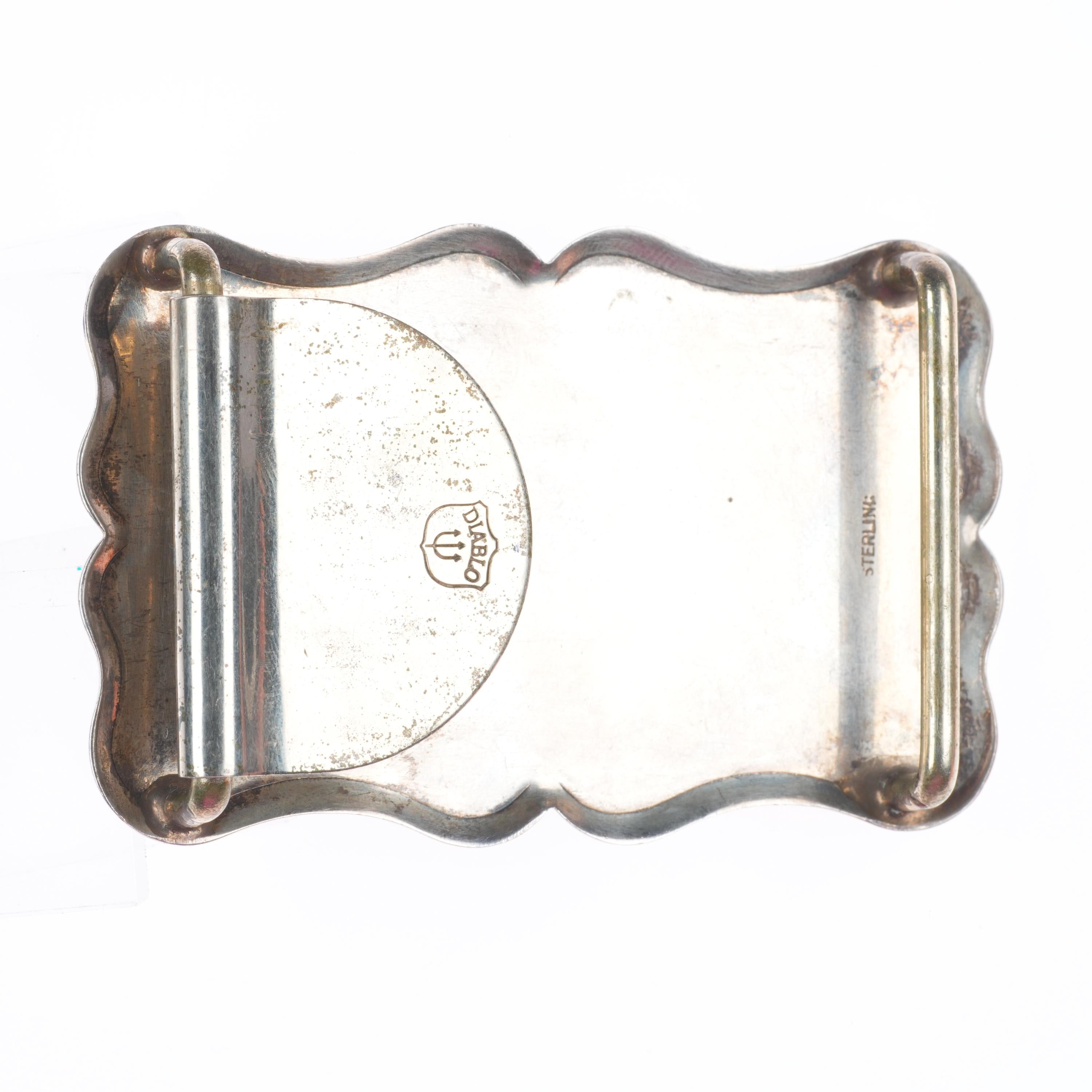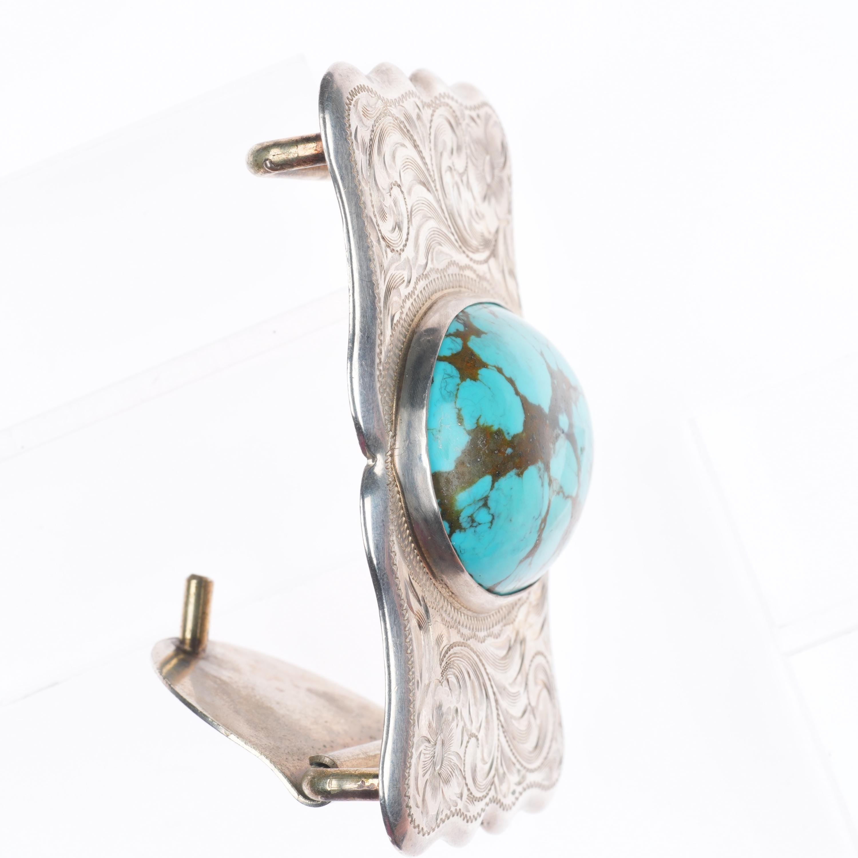 Vintage Diablo sterling silver hand engraved belt buckle with large turquoise. Tested and guaranteed solid sterling silver weight and measurements in pictures, Circa third quarter of the 20th century. Fits a 1.5" belt. Functional with age appropriate wear, no significant issues.