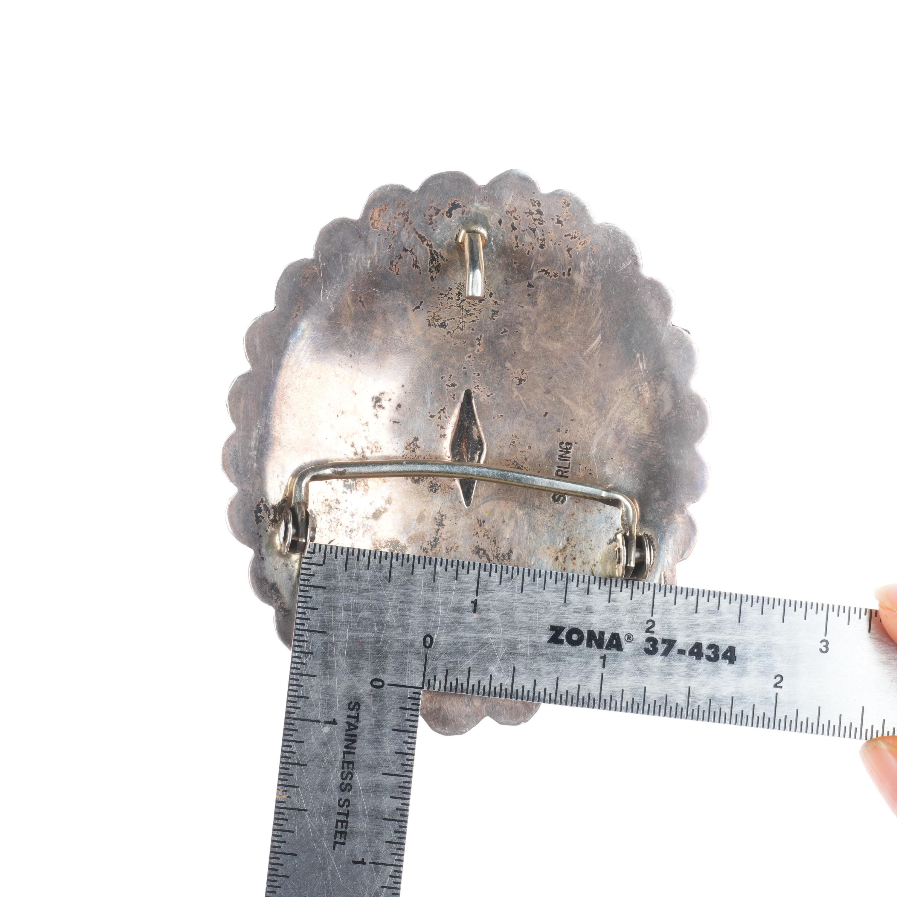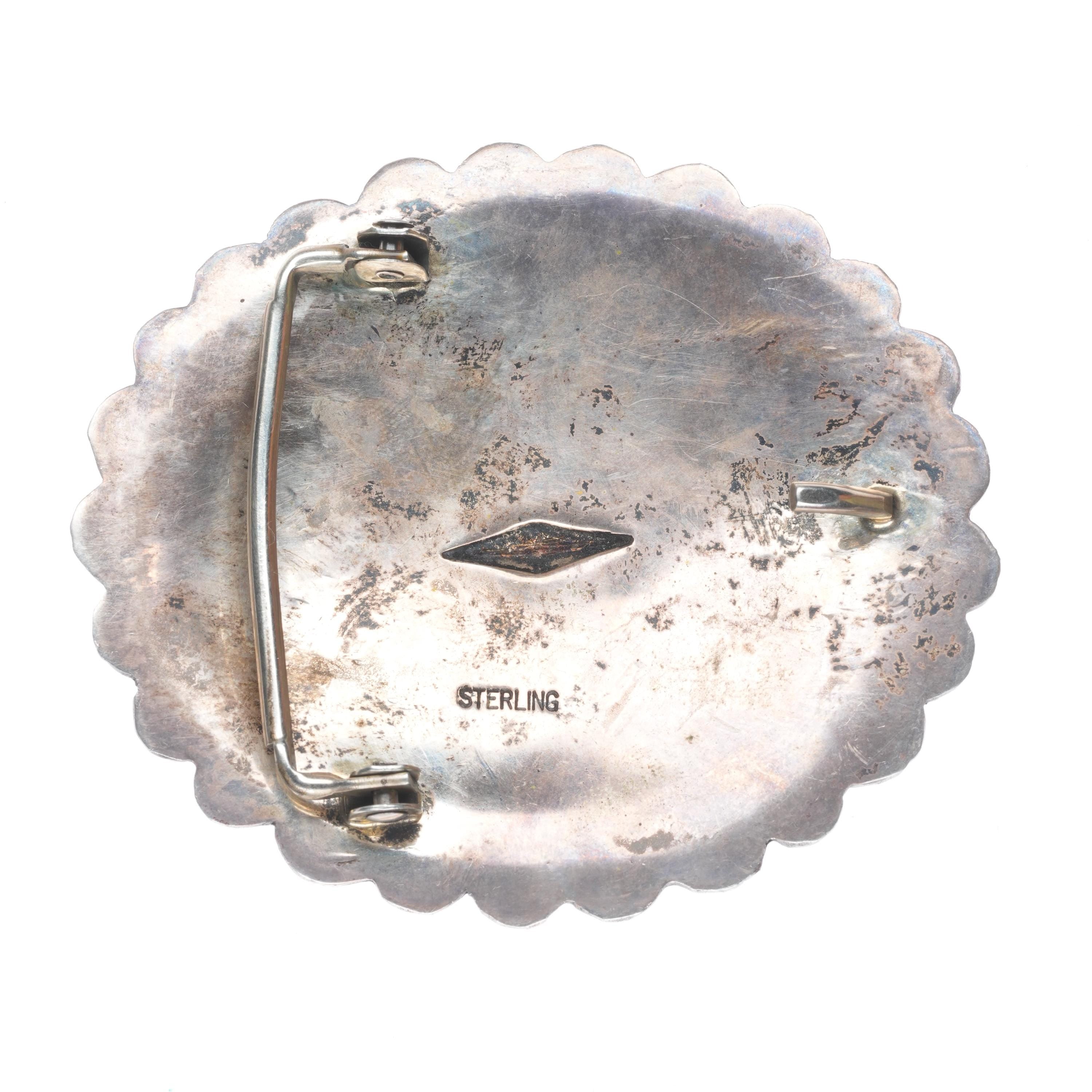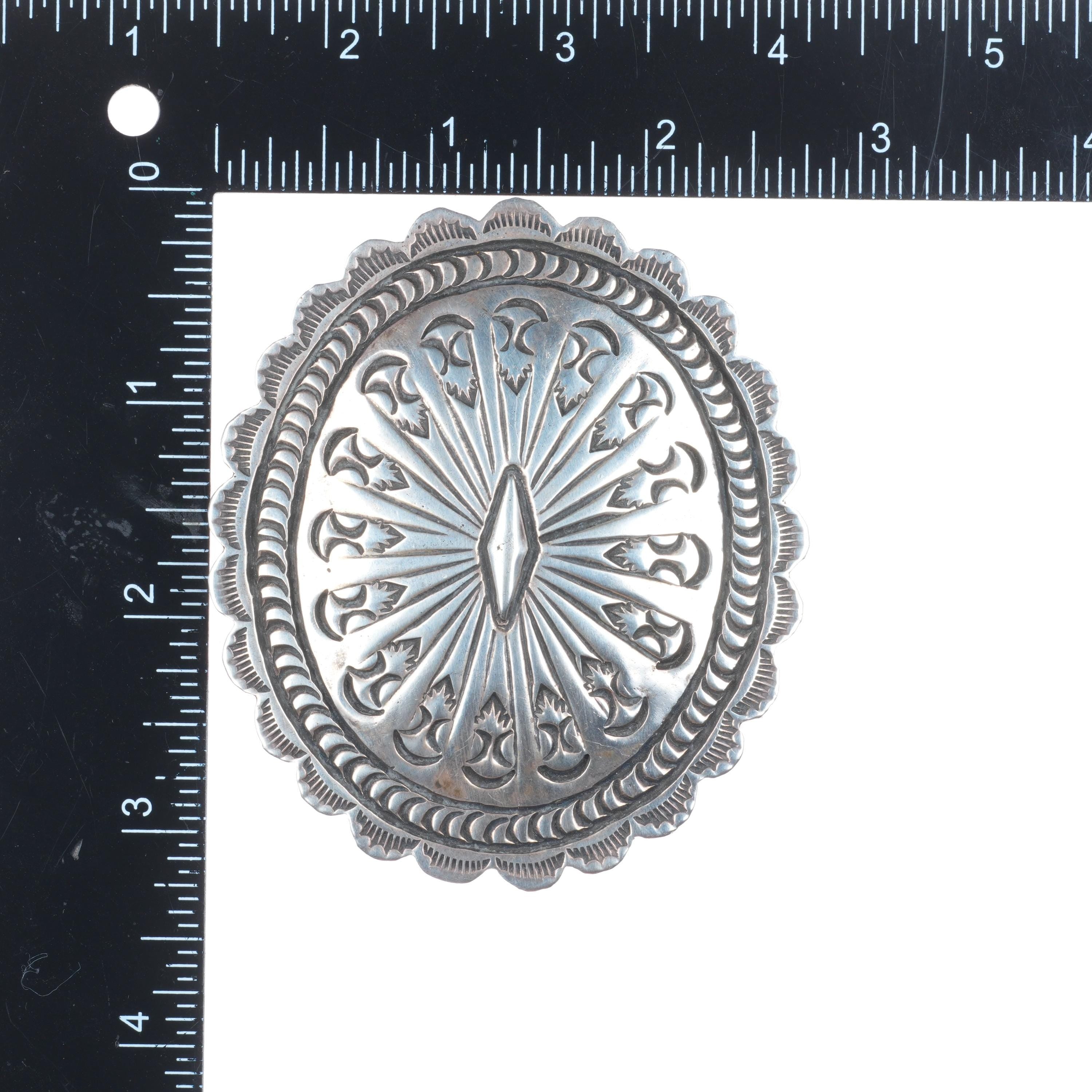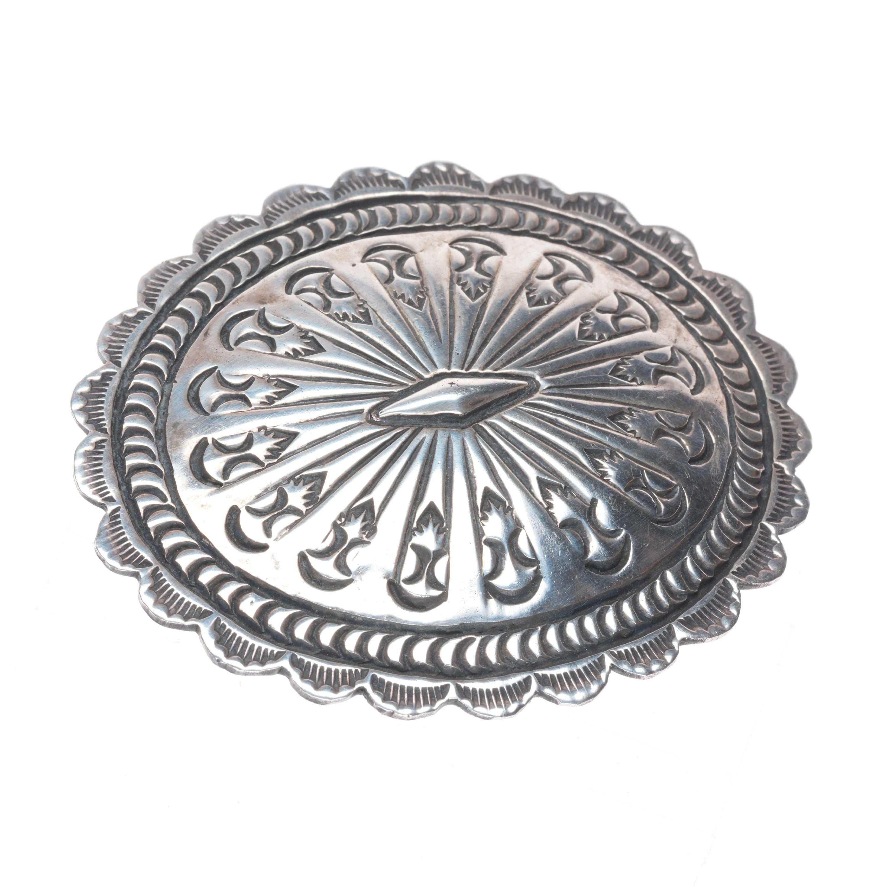 Vintage Navajo deep stamped sterling silver concho style belt buckle. Fits up to a 1.5" belt. Tested and guaranteed solid sterling silver with weight and measurements in pictures. Fully functional. All items will likely have some age appropriate/expected wear, the older they are the more wear they should have. Circa third quarter of the 20th century..