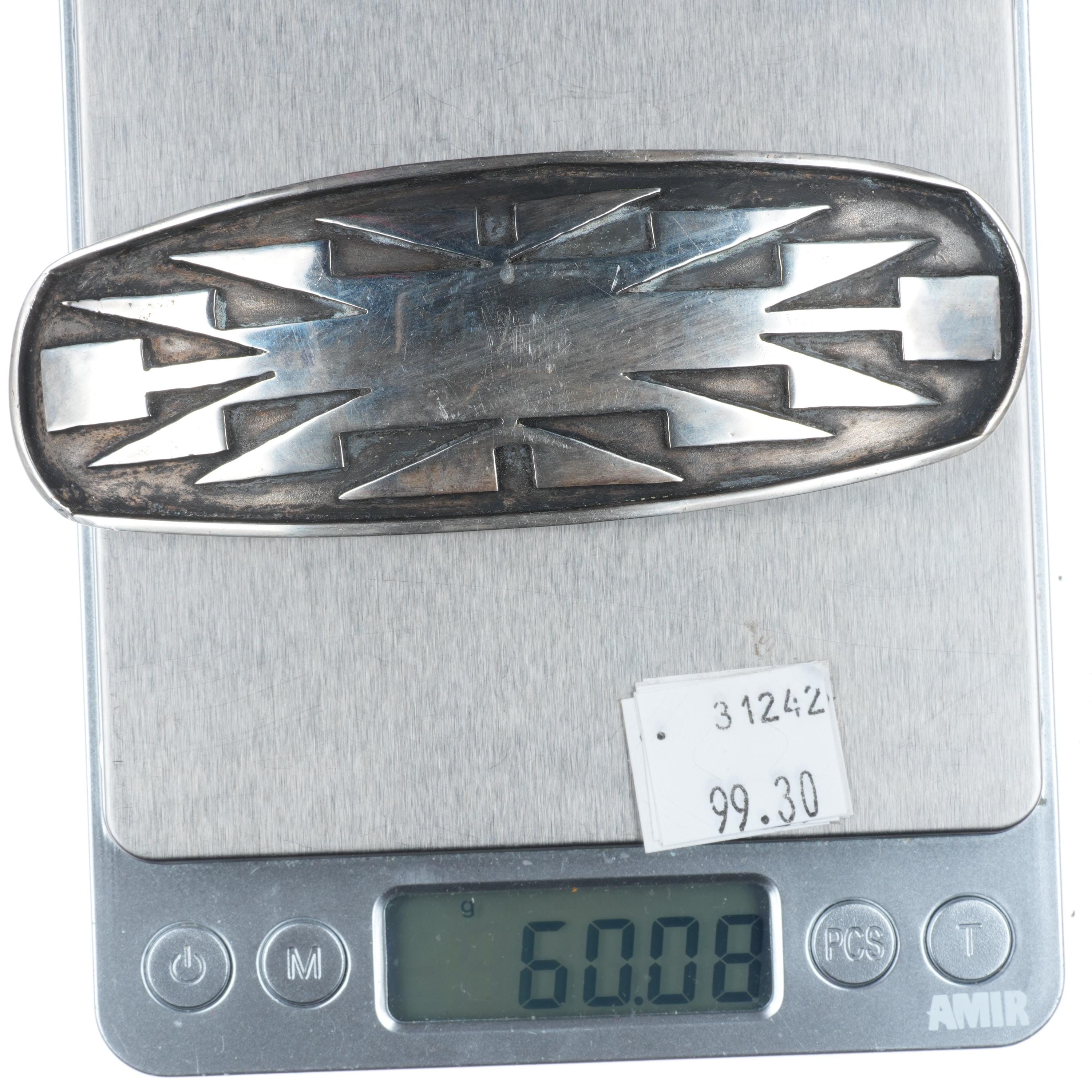 Vintage Navajo Overlay geometric belt buckle sterling silver Tested and guaranteed solid sterling silver. Weight and measurements in pictures, circa third quarter of the 20th century. Fits a 1 1/8" belt. Illegibly marked on back, likely a previous owner.
