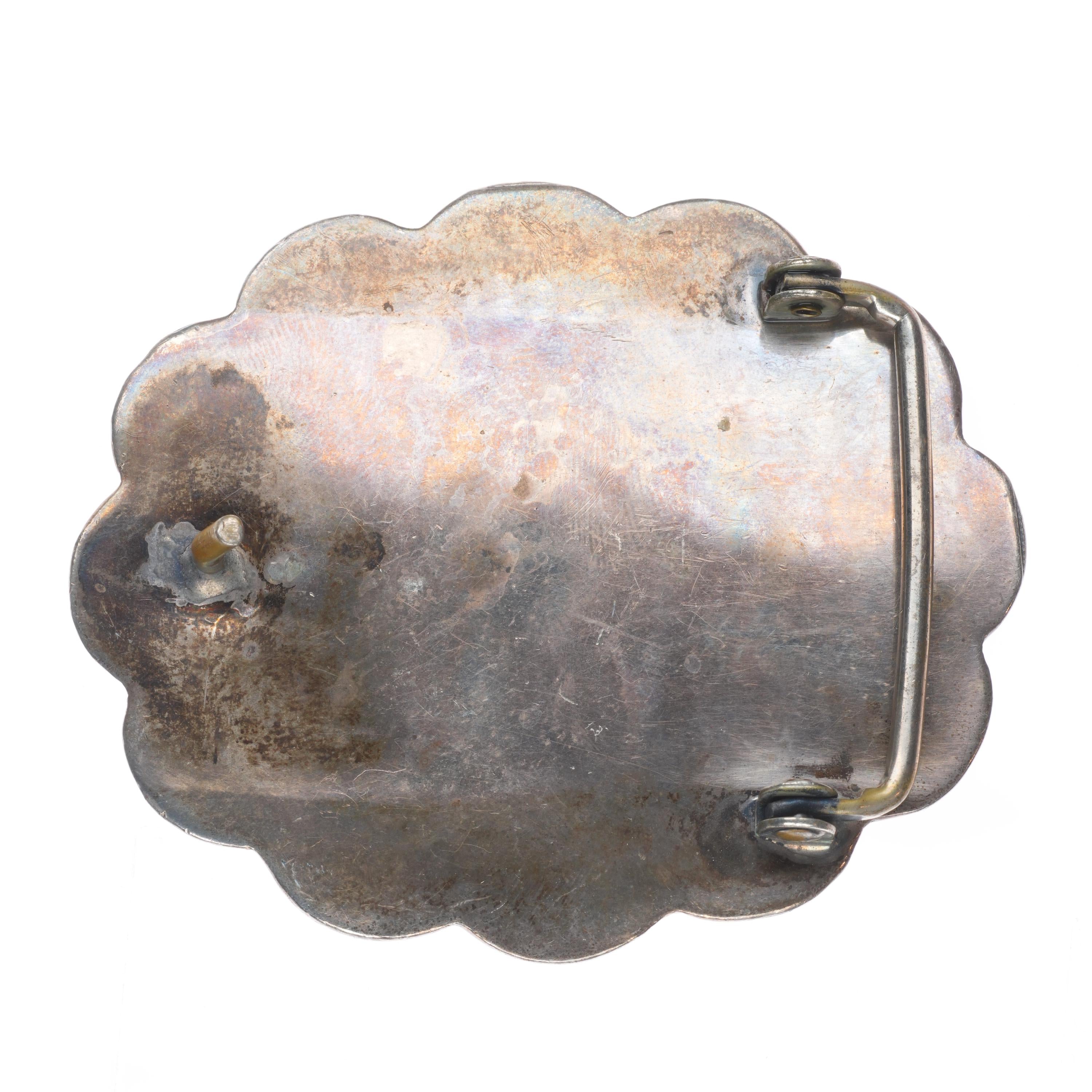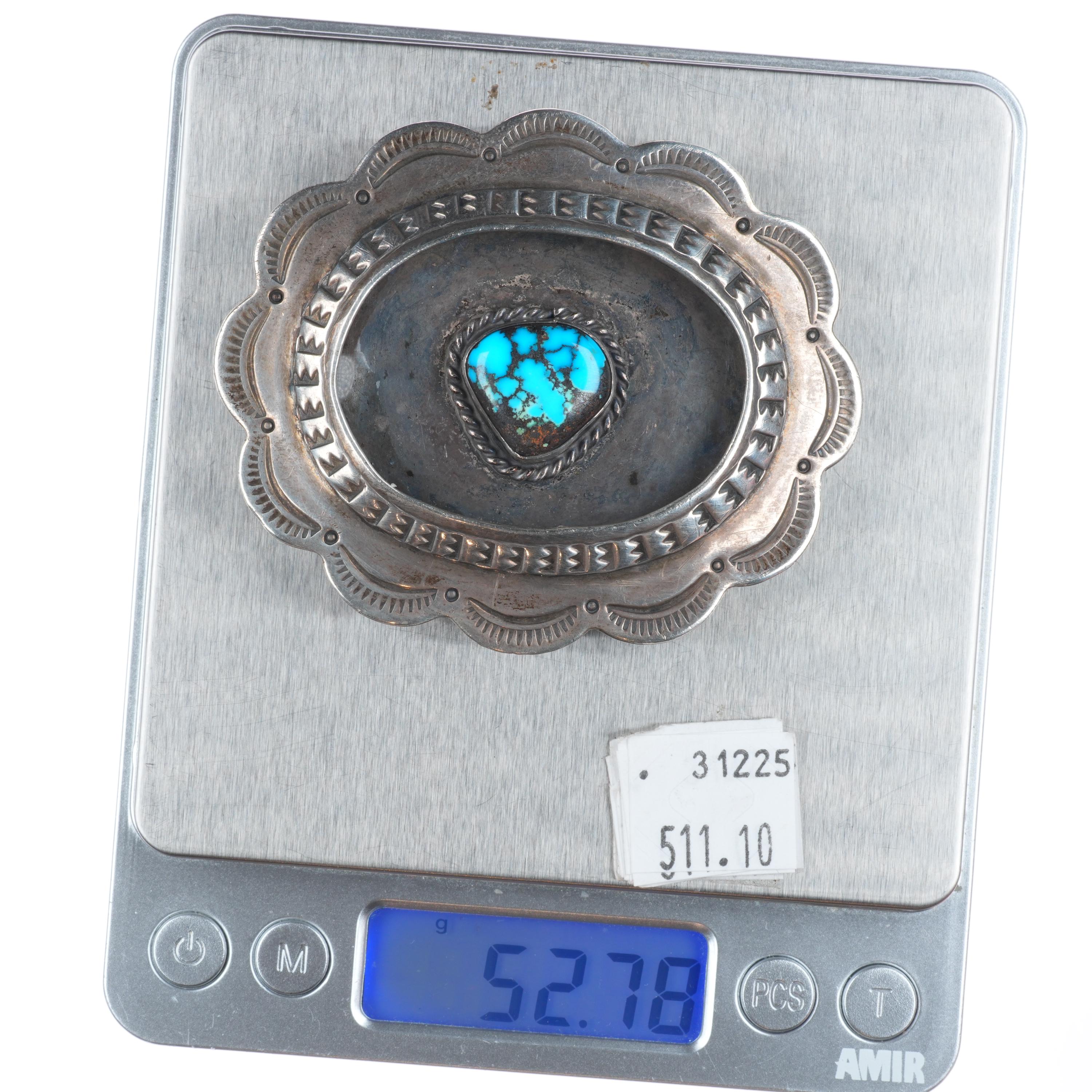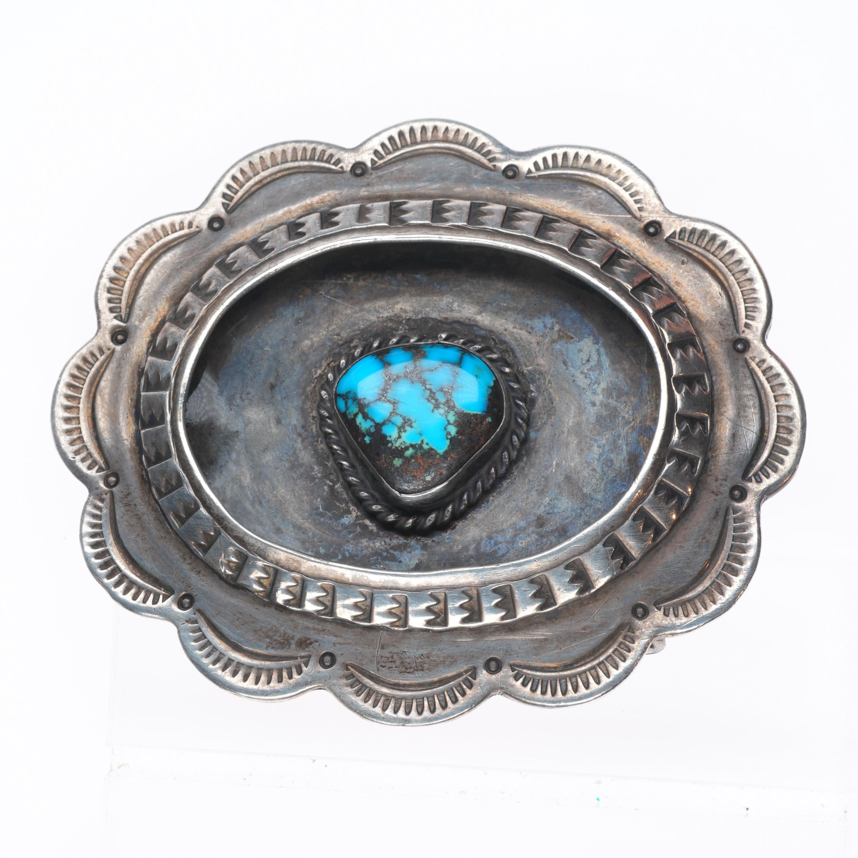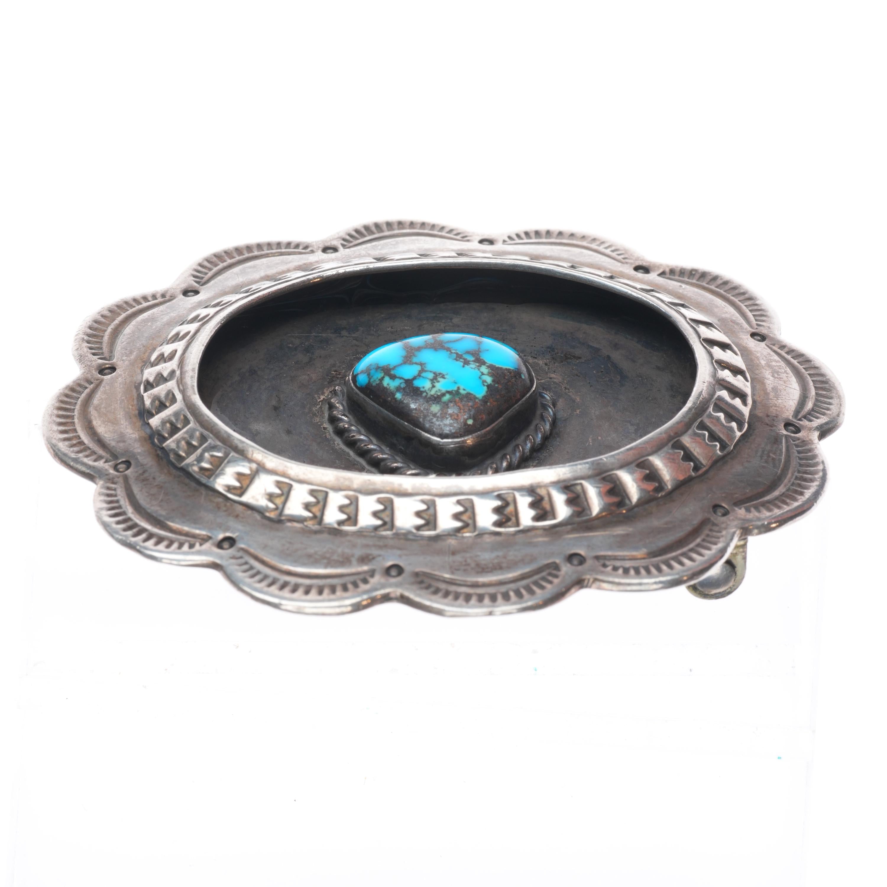 Vintage Navajo sterling silver shadowbox spiderweb turquoise belt buckle