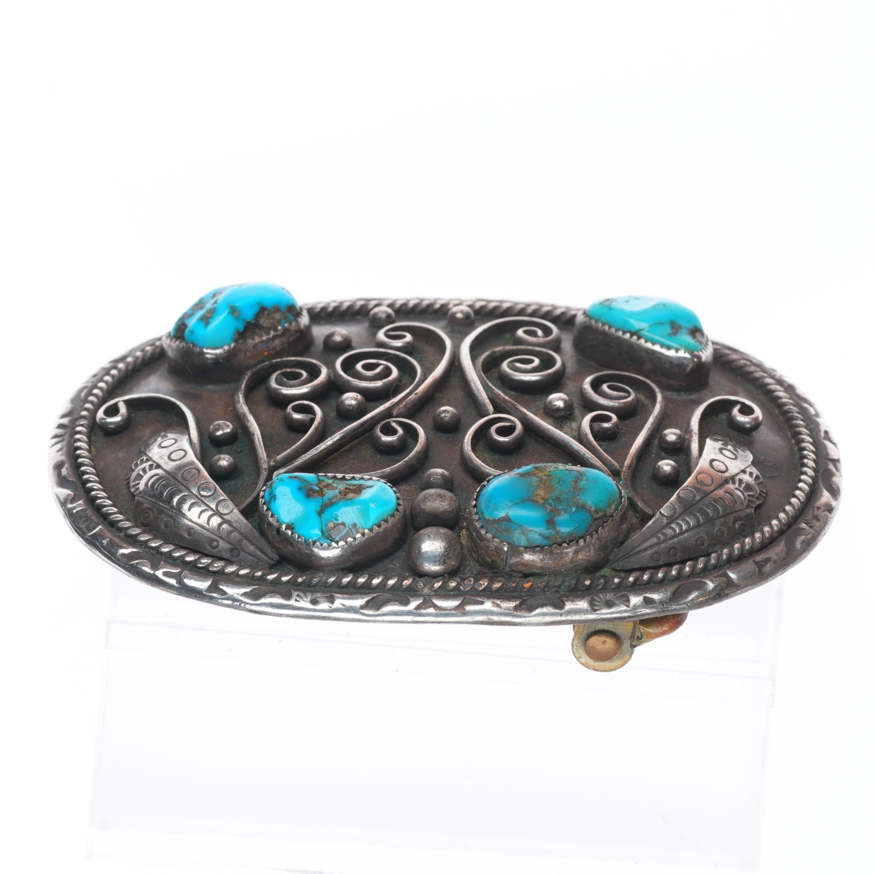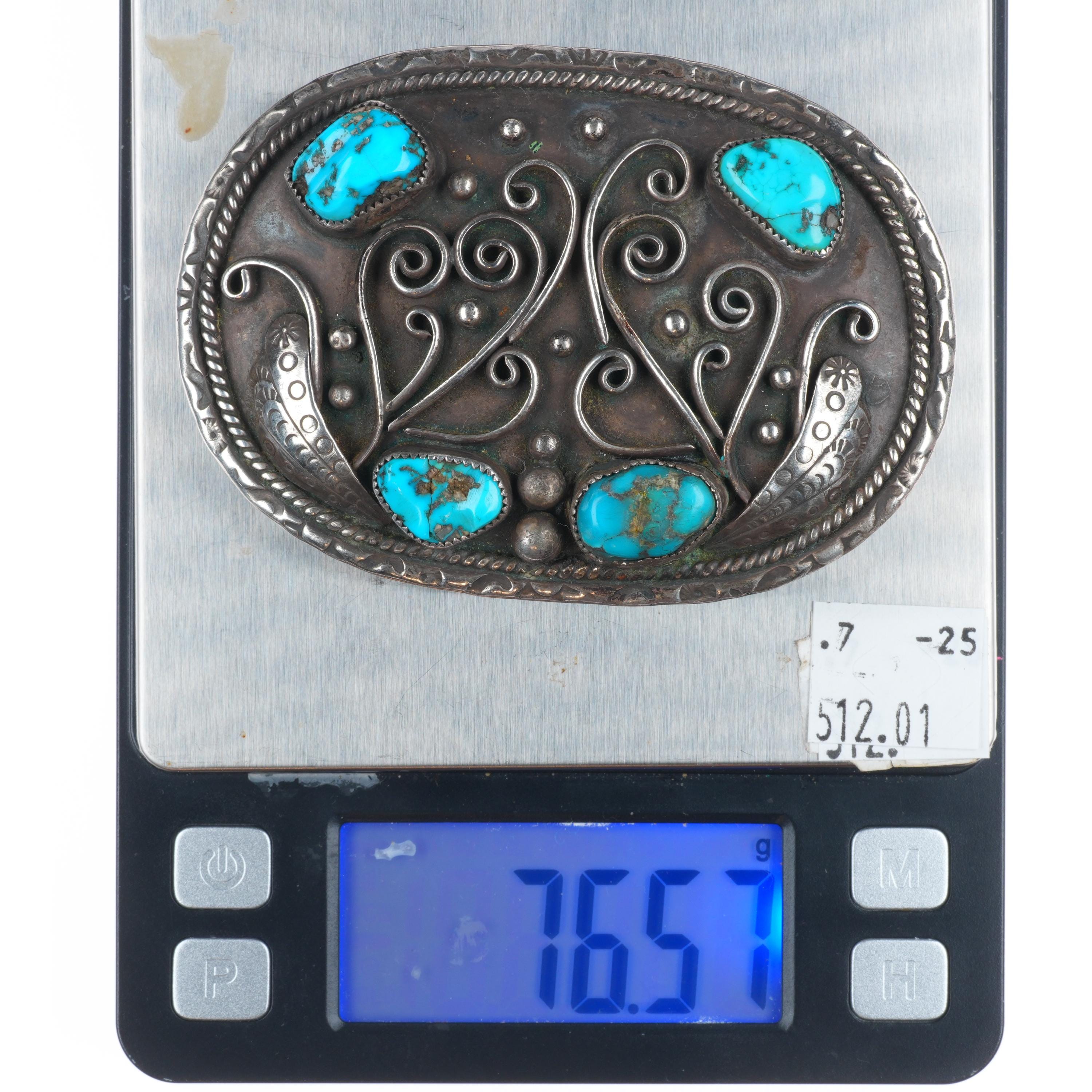 Vintage Navajo sterling silver turquoise belt buckle 4 stone. Tested and guaranteed solid sterling silver with weight and measurements in pictures. Fits up to a 1.5" belt, circa third quarter of the 20th century. Age appropriate wear with no significant issues.
