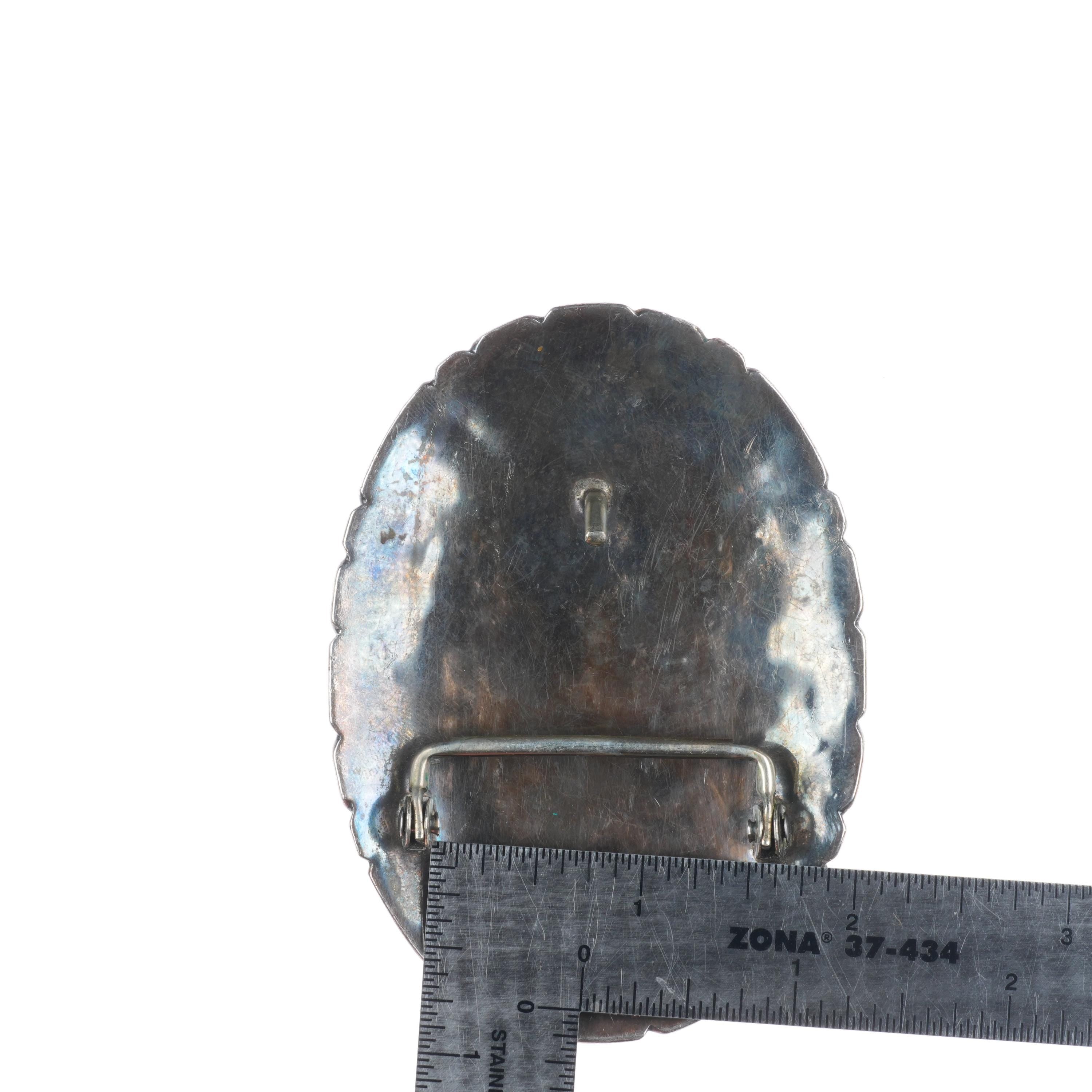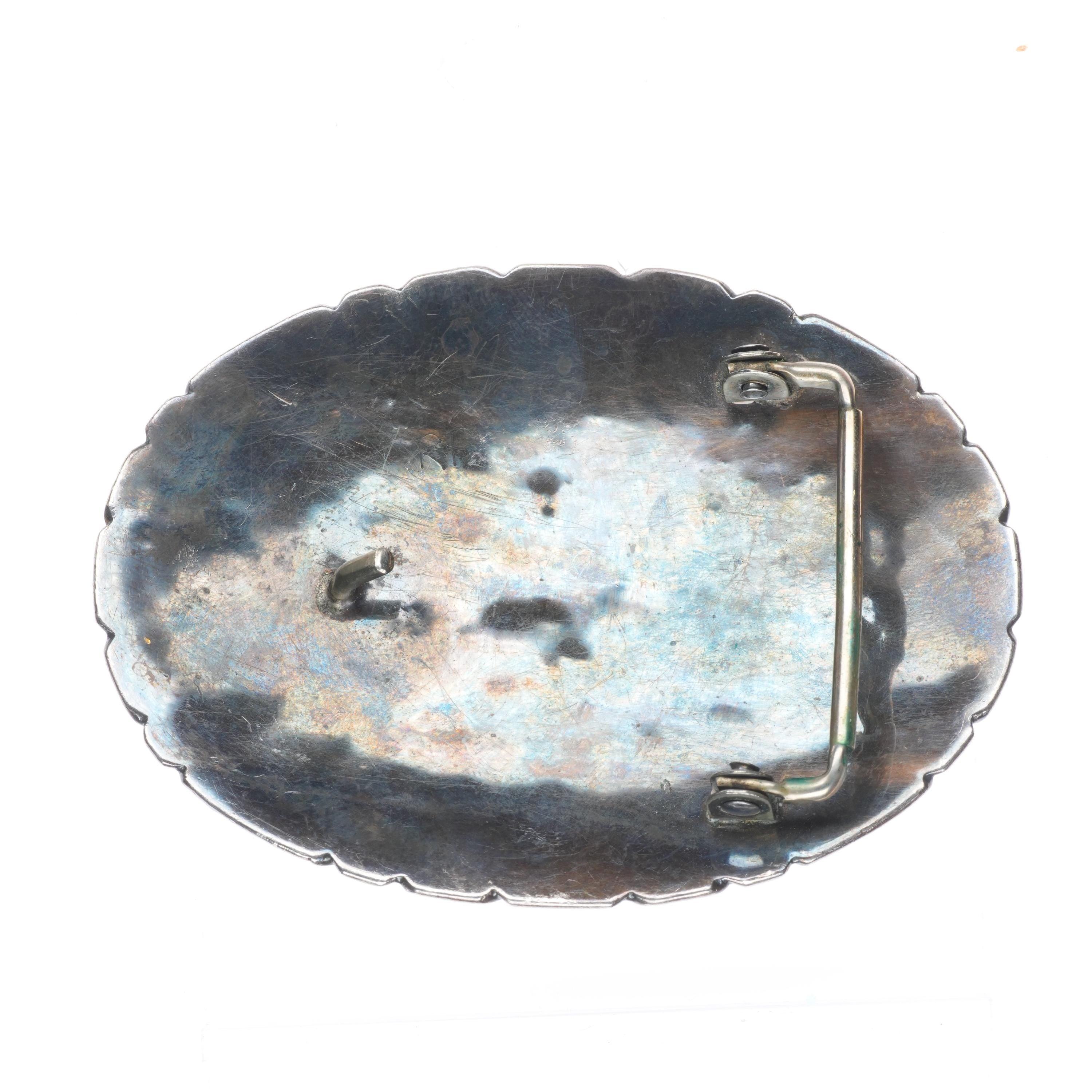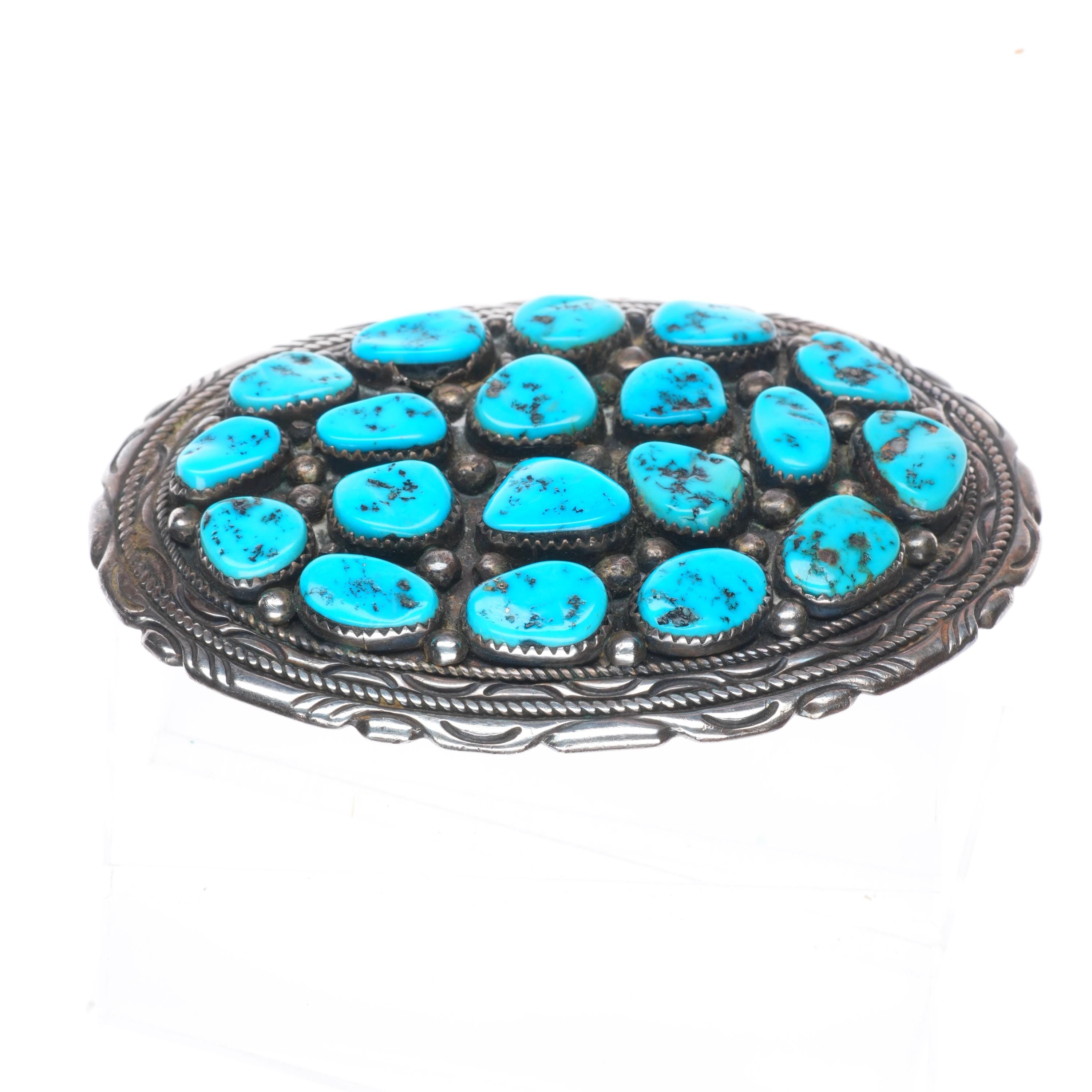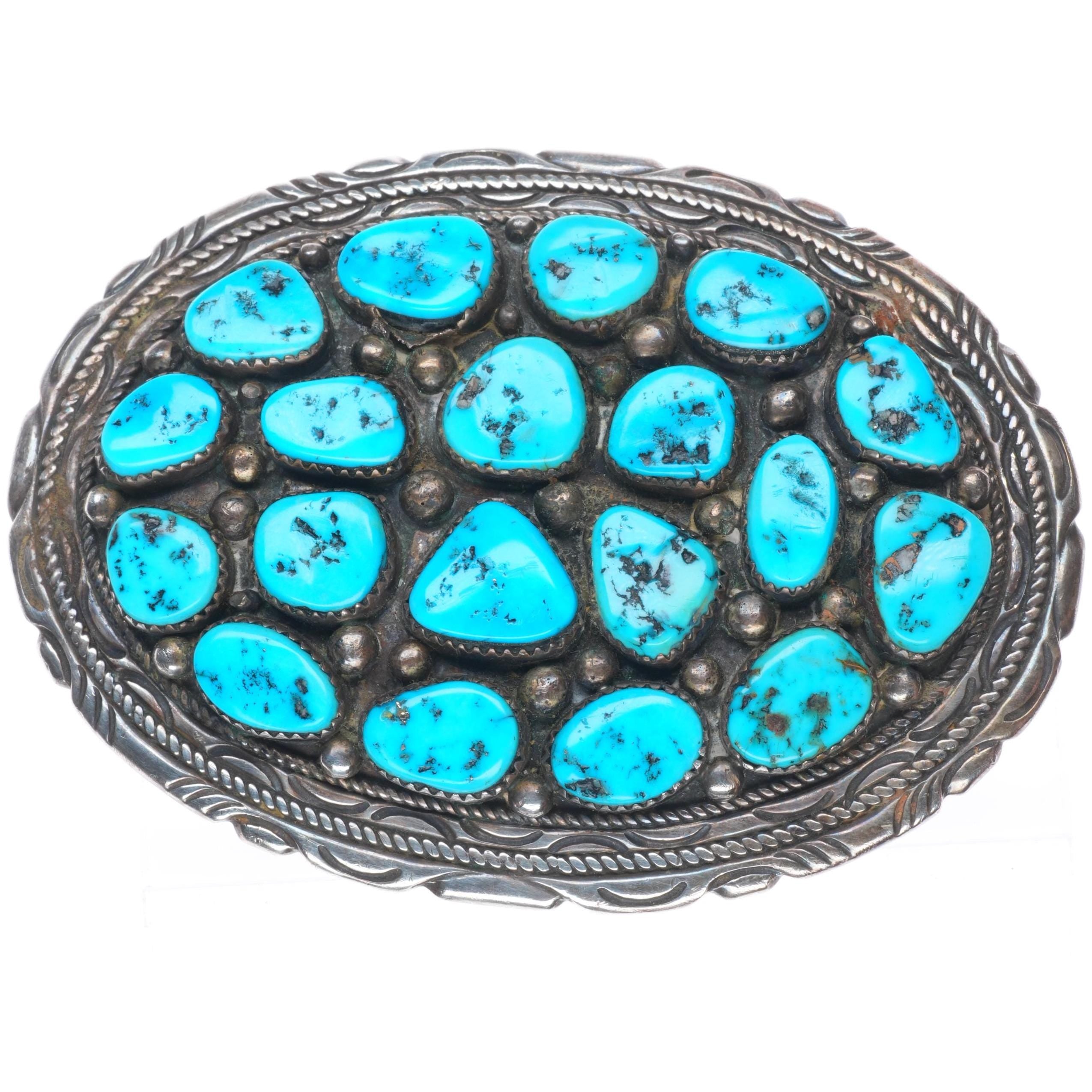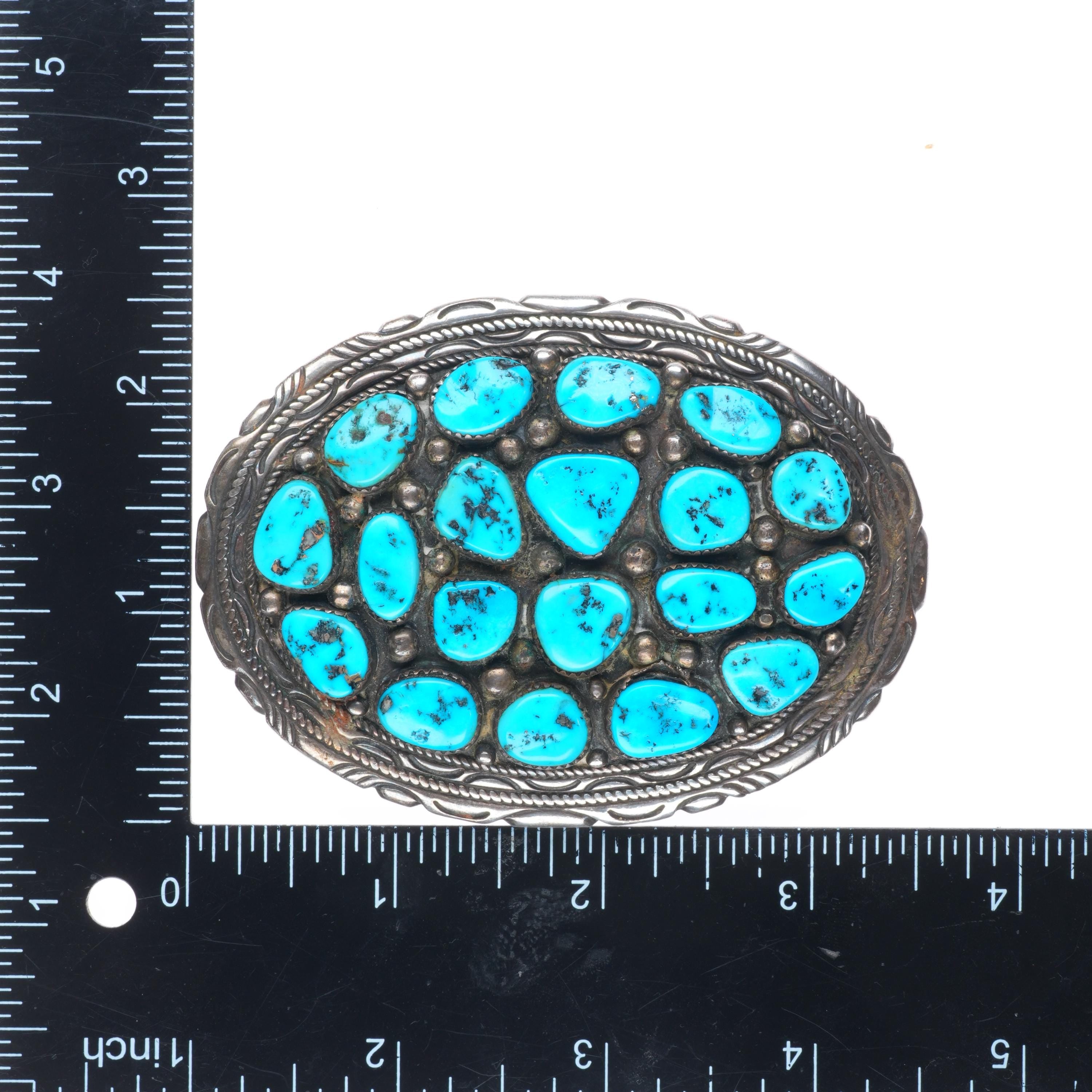 Vintage Navajo sterling silver turquoise cluster belt buckle with stamped rim. Tested and guaranteed solid sterling silver weight and measurements in pictures, Circa third quarter of the 20th century. Fits a 1.5" belt.