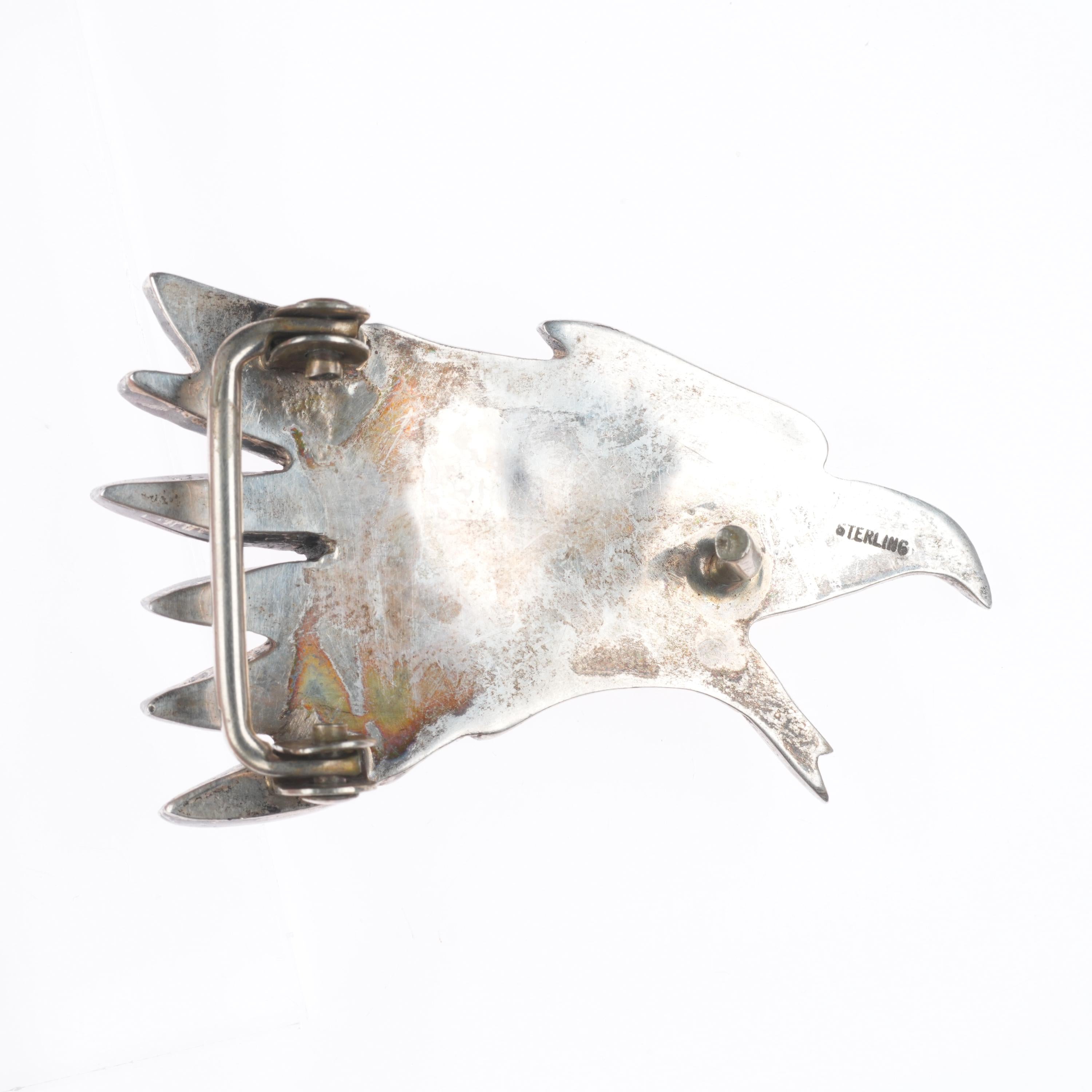 Vintage southwestern sterling silver carved shell eagle head belt buckle. Tested and guaranteed solid sterling silver weight and measurements in pictures, circa last quarter of the 20th century. Fits a 1" belt.