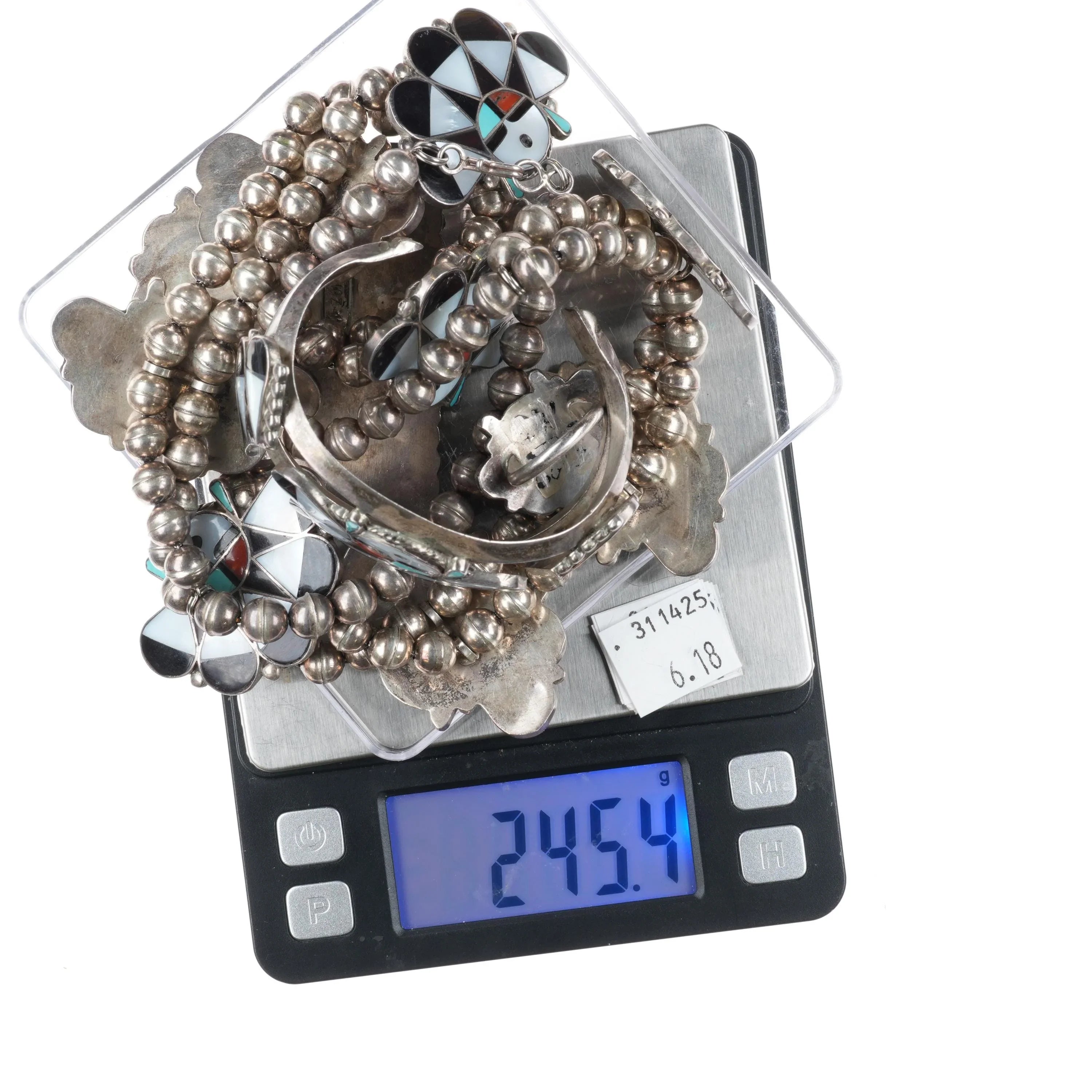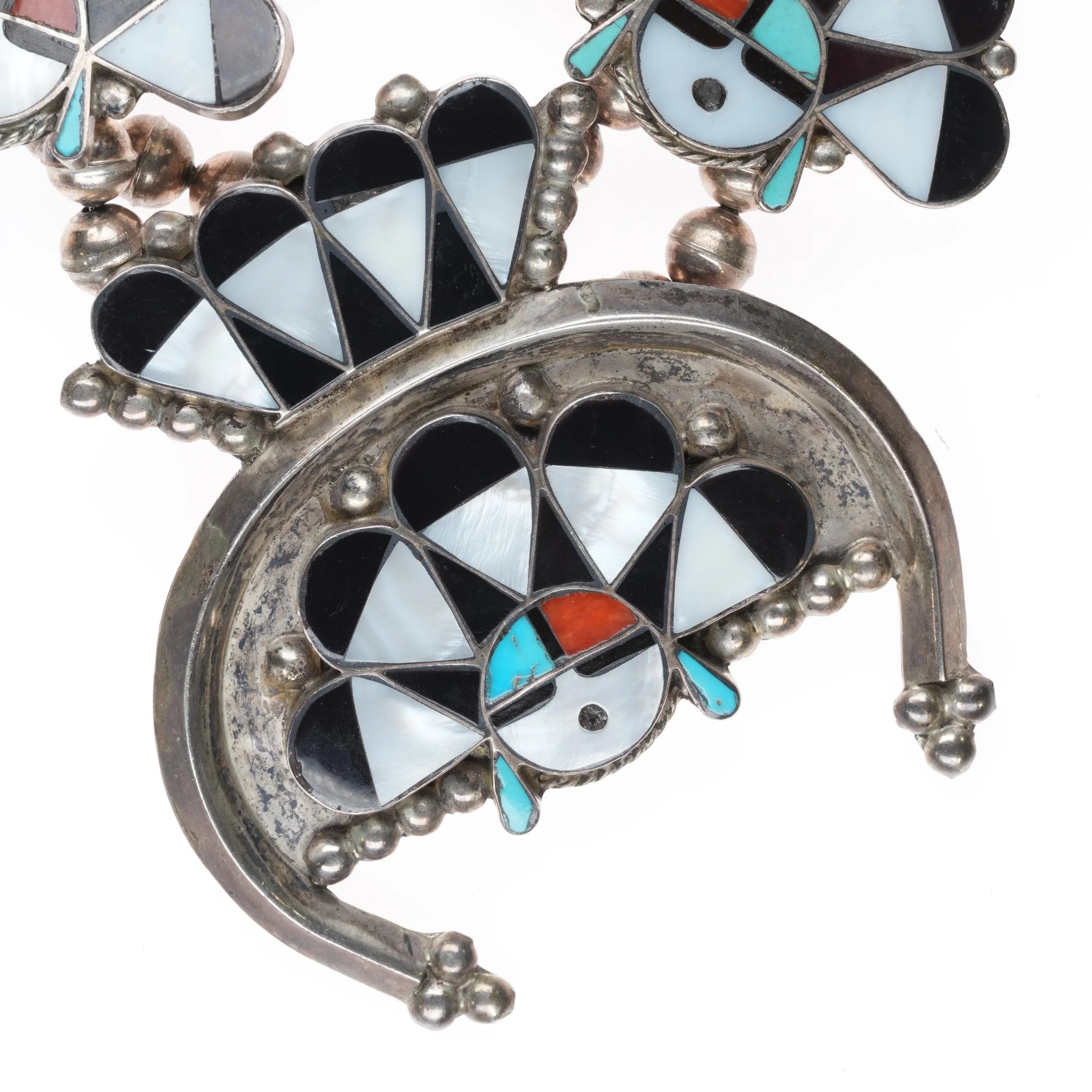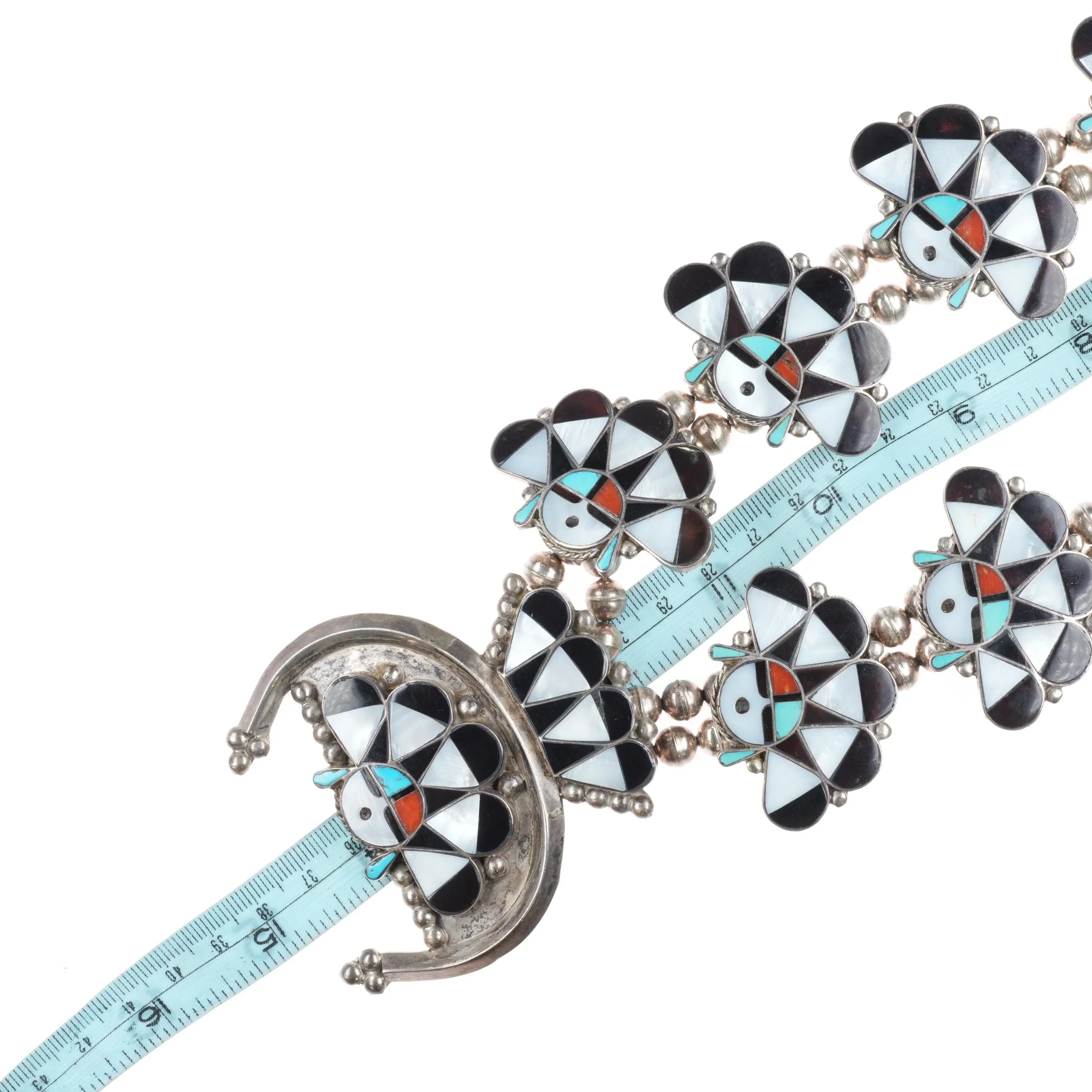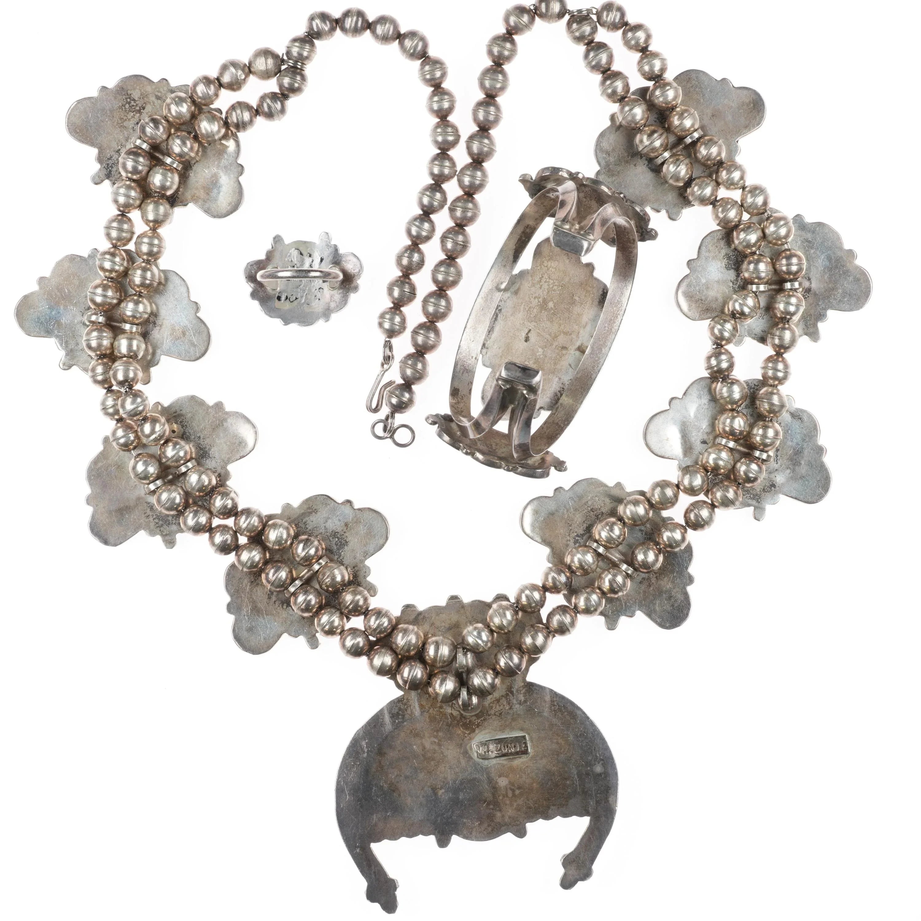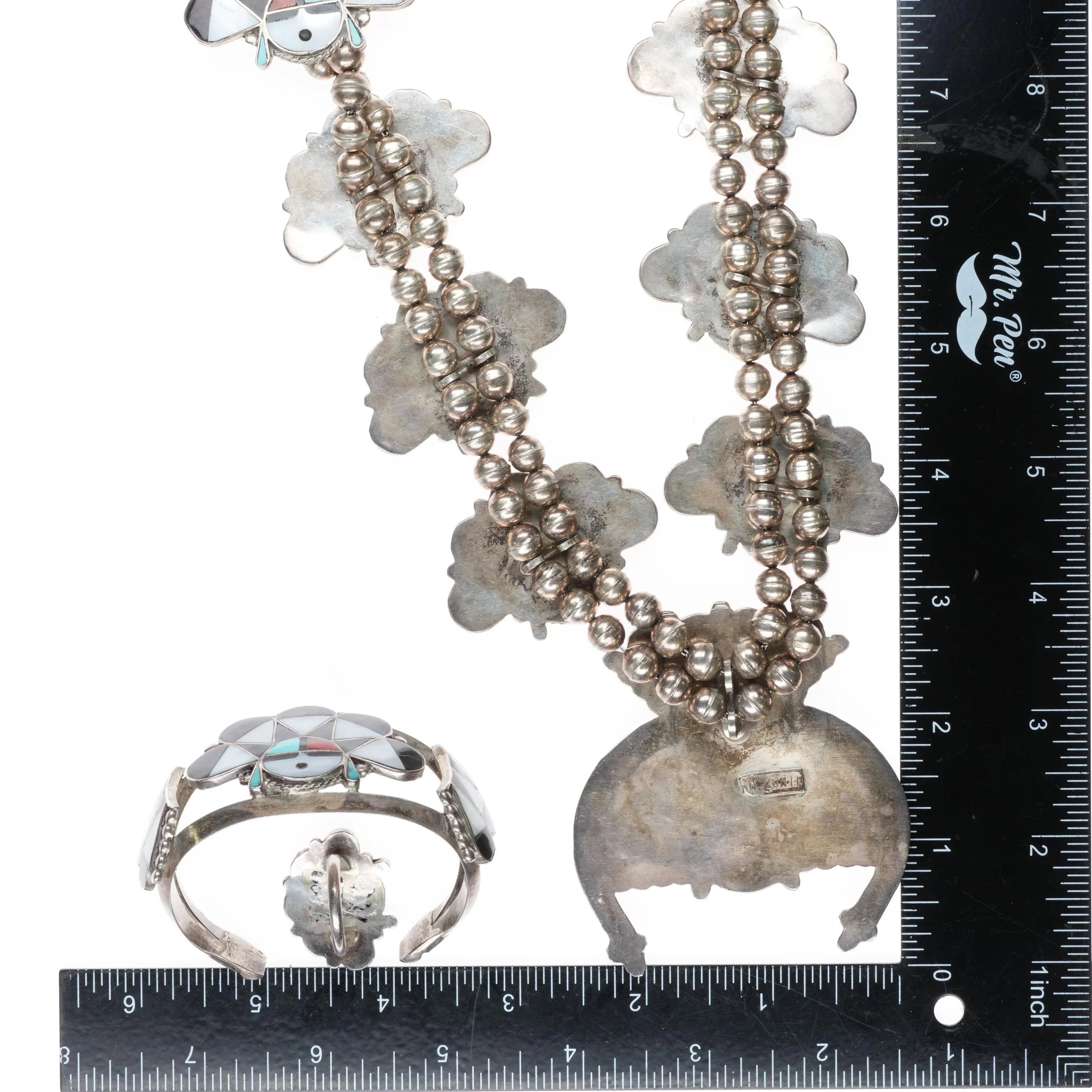 Vintage Zuni William Zunie sterling silver sunface squash blossom 6.5" Cuff bracelet and Size 7.25 Ring set. Tested and guaranteed solid sterling silver with weight and measurements in the pictures. High quality set circa 1970‘s with no apparent damage. Only the necklace appears to be signed by the artist. Necklace is 24" long Other measurements in pictures.