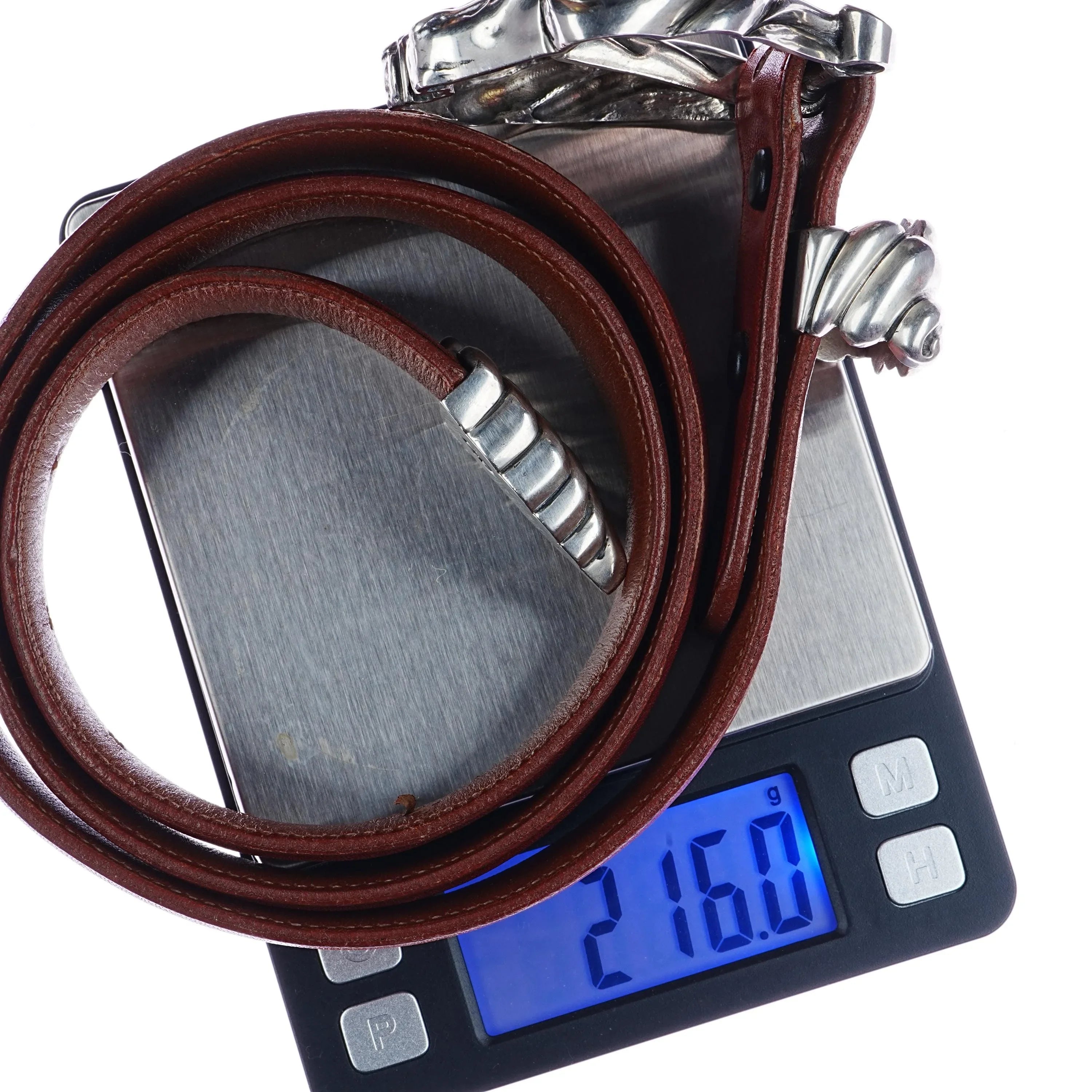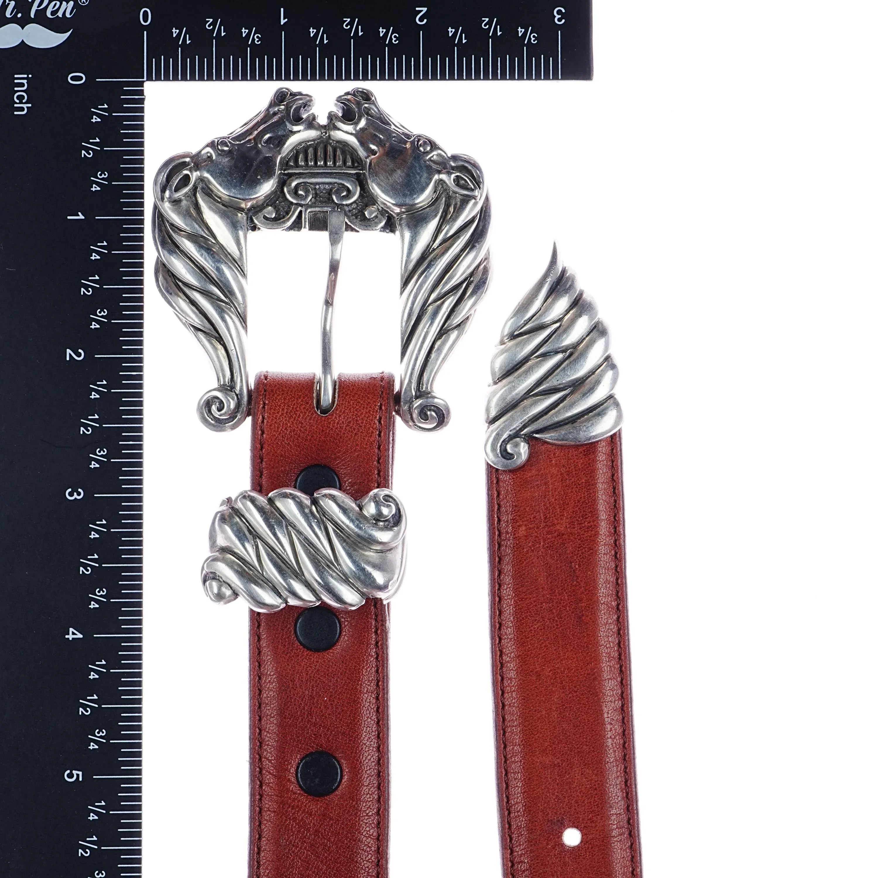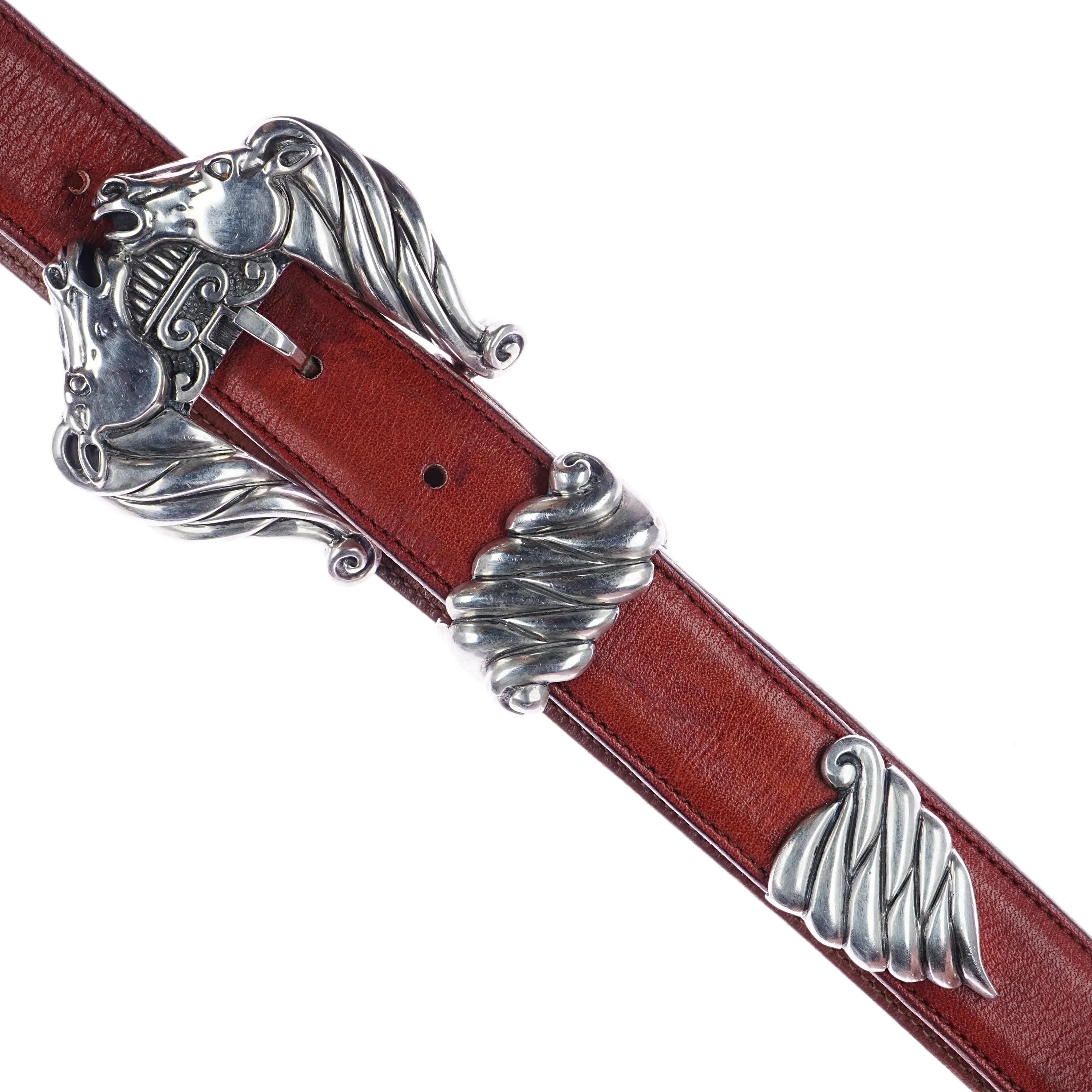 1993 Kokopelli Designs Sterling silver Horses Equestrian Ranger belt buckle set. This is on a 1" belt, the holes on the belt are 30"-34", belt is high quality and in good condition and it is free with the solid sterling silver, Buckle, keeper, and tip that I am selling. Weights and measurements are in the pictures. This company was in Business in the 1990‘s, the modern day equivalent of this type of quality would cost a small fortune.