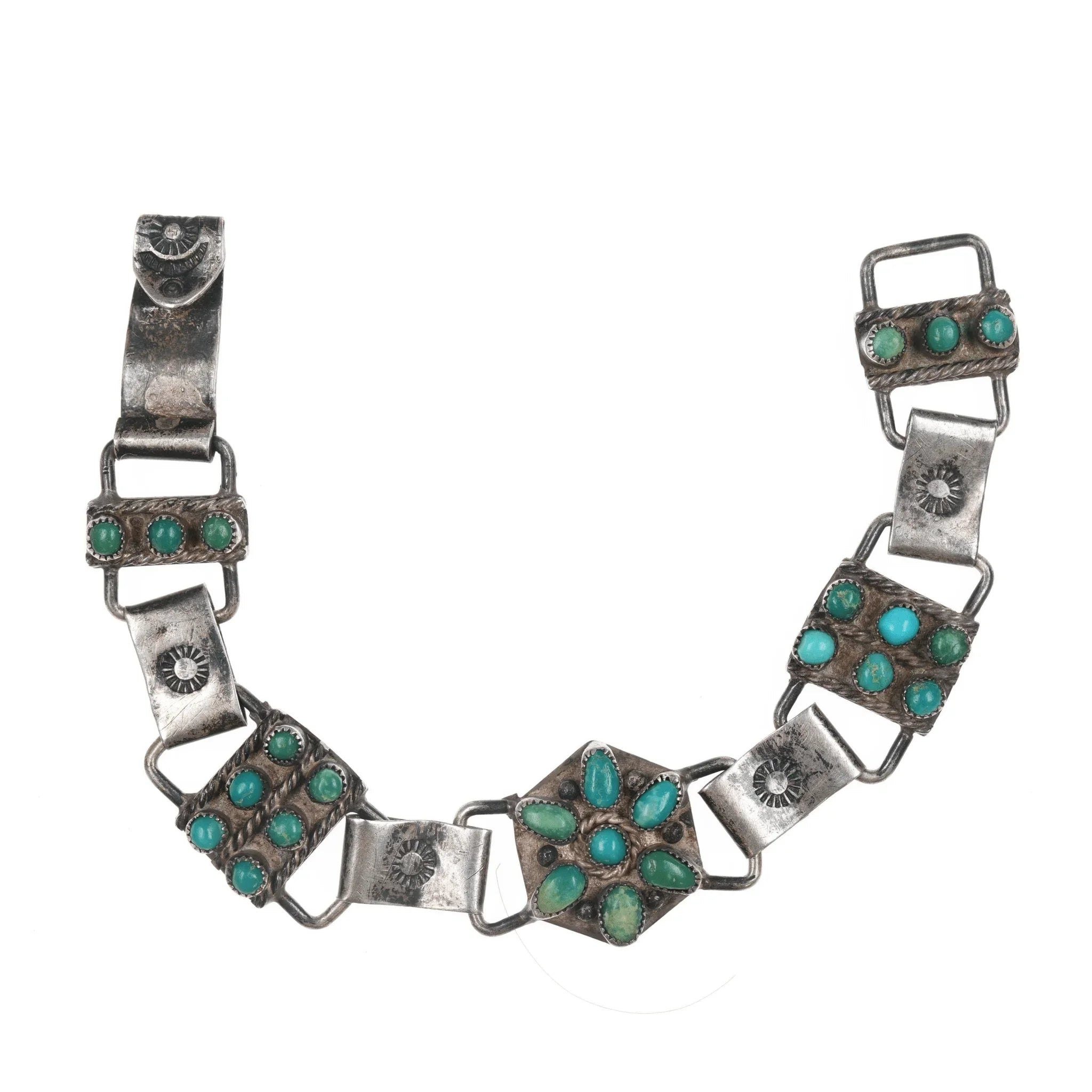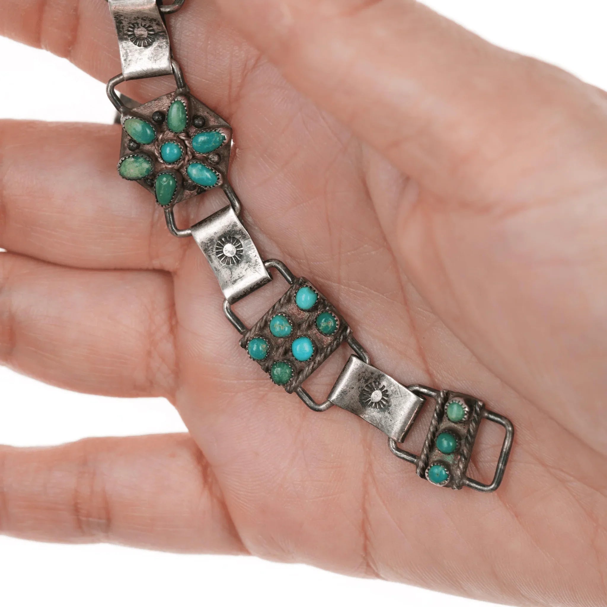 5.25" 30's-40's CG Wallace Era Zuni silver link bracelet with turquoise. For a very small wrist as shown. No markings other than scratched YEA or VEA traders code on back, common with pieces from this era.