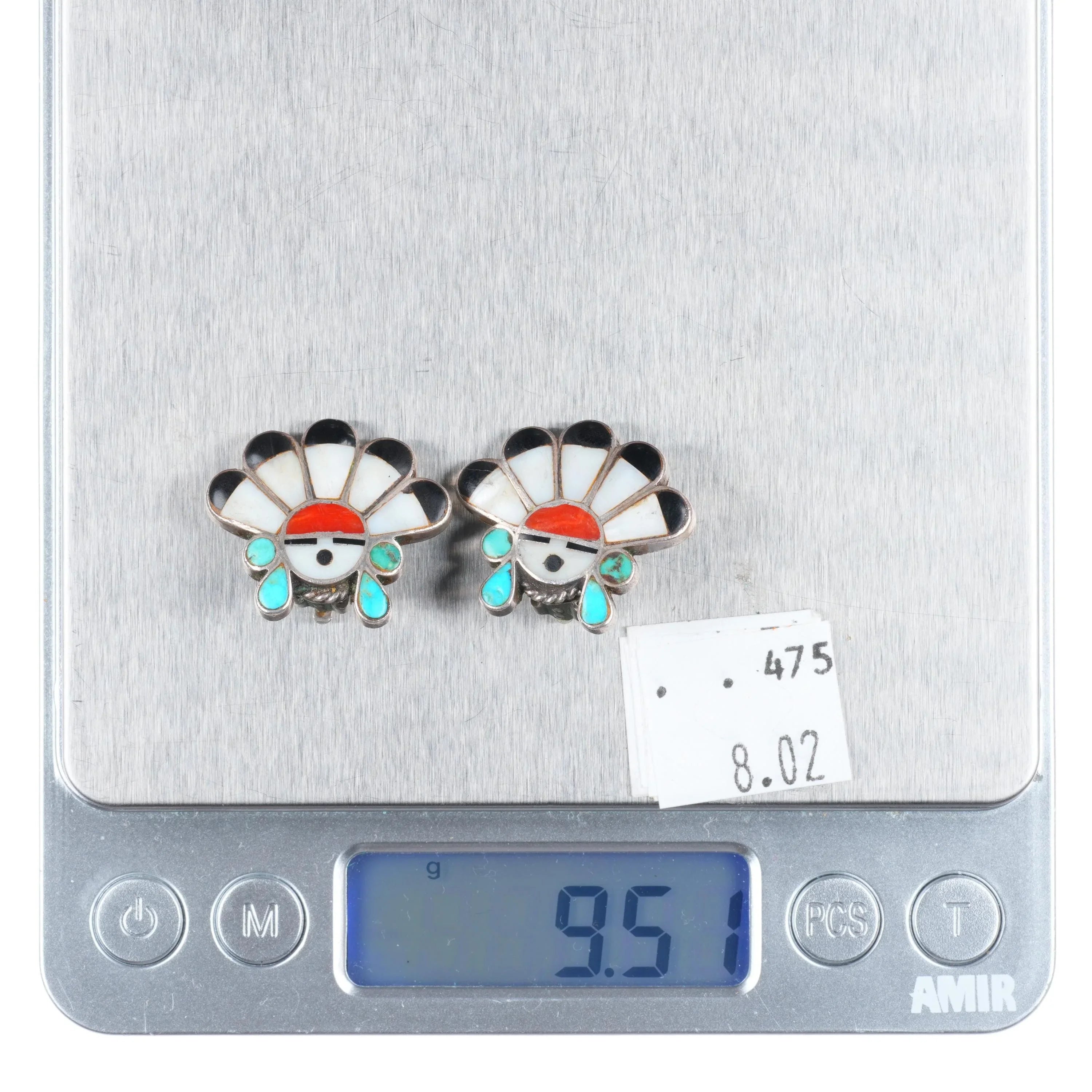 50‘s-60‘s Zuni sterling silver sunface sterling silver inlaid clip-on earrings. Great earrings with no damage or significant wear. Tested and guaranteed solid sterling silver. Strong springs on clips, unmarked.